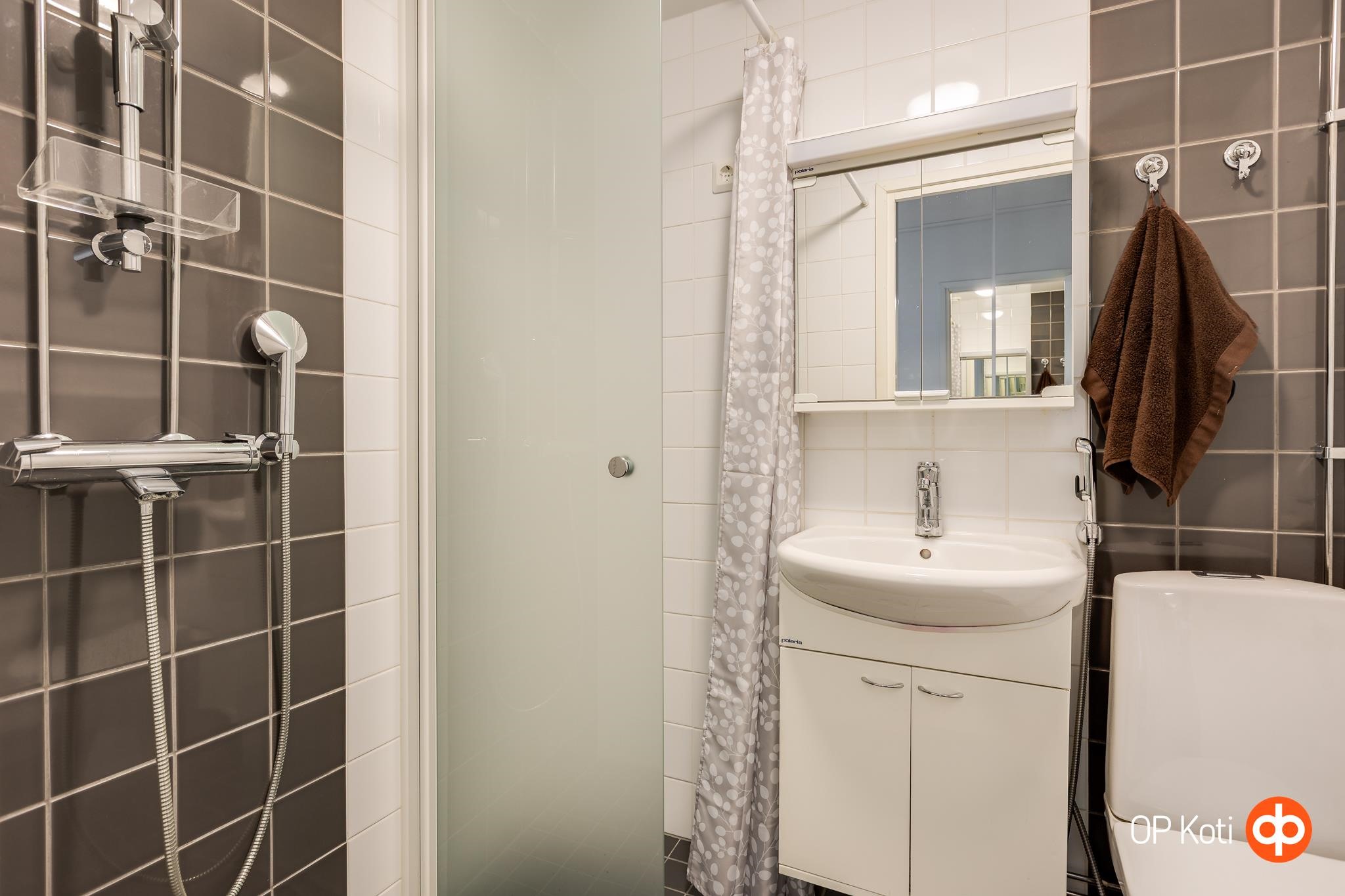 - Kylpyhuone, suihku, suihkuseinä, peilikaappi, allaskaappi, pesukoneliitäntä, lattialämmitys, kiinteät valaisimet. Kylpyhuone on uusittu täysin vuonna 2015 taloyhtiön LVIS-remontin yhteydessä.