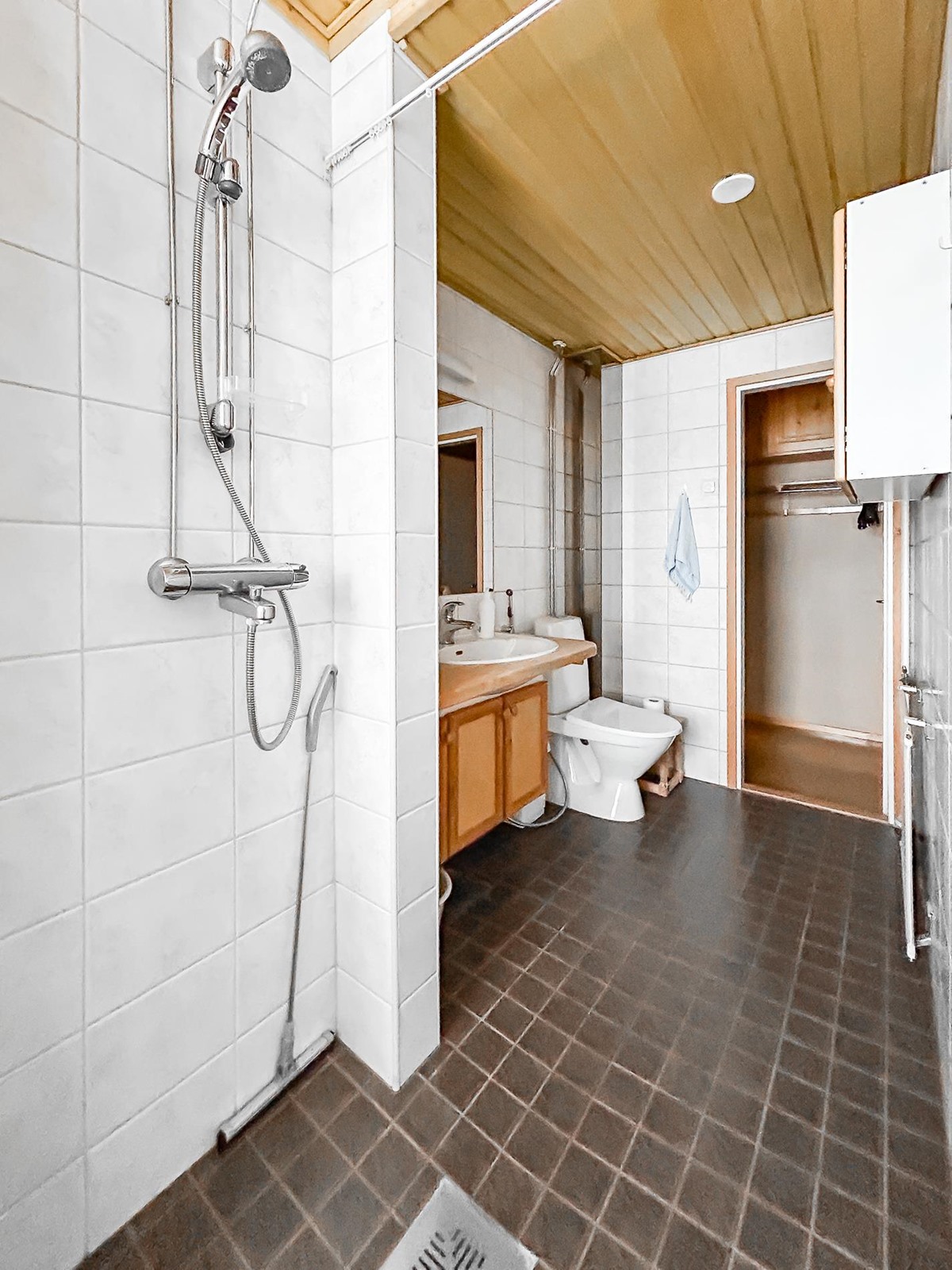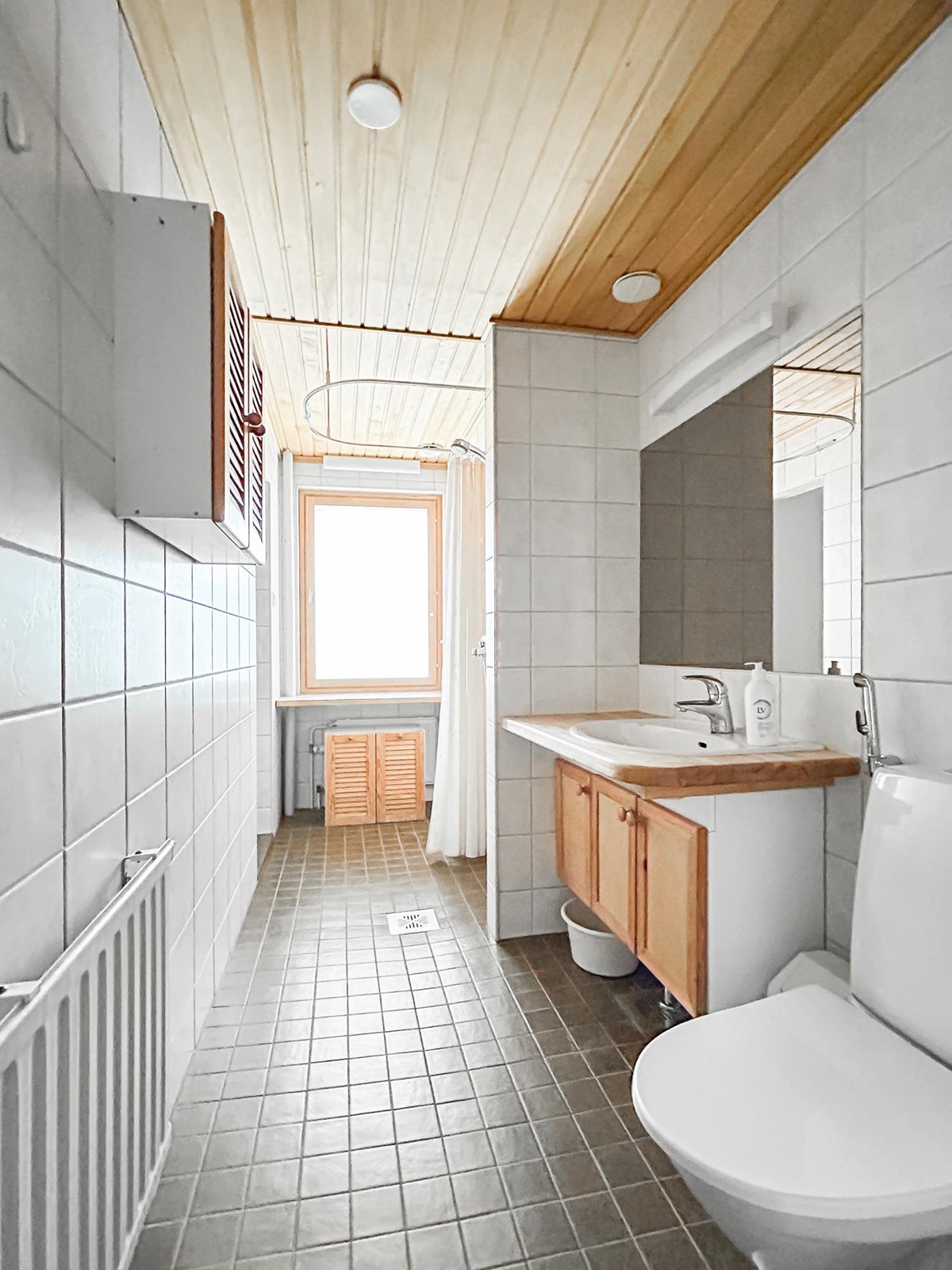 - Kylpyhuone, suihku, peili, kaapit, allaskaappi, pesukoneliitäntä, lattialämmitys, kiinteät valaisimet. Pesuhuone remontoitu taloyhtiössä tehdyn LVIS-saneerauksen yhteydessä 2008. Asunnosta purettu vaatehuone ja saneerattu tilalle isompi kylpyhuone.