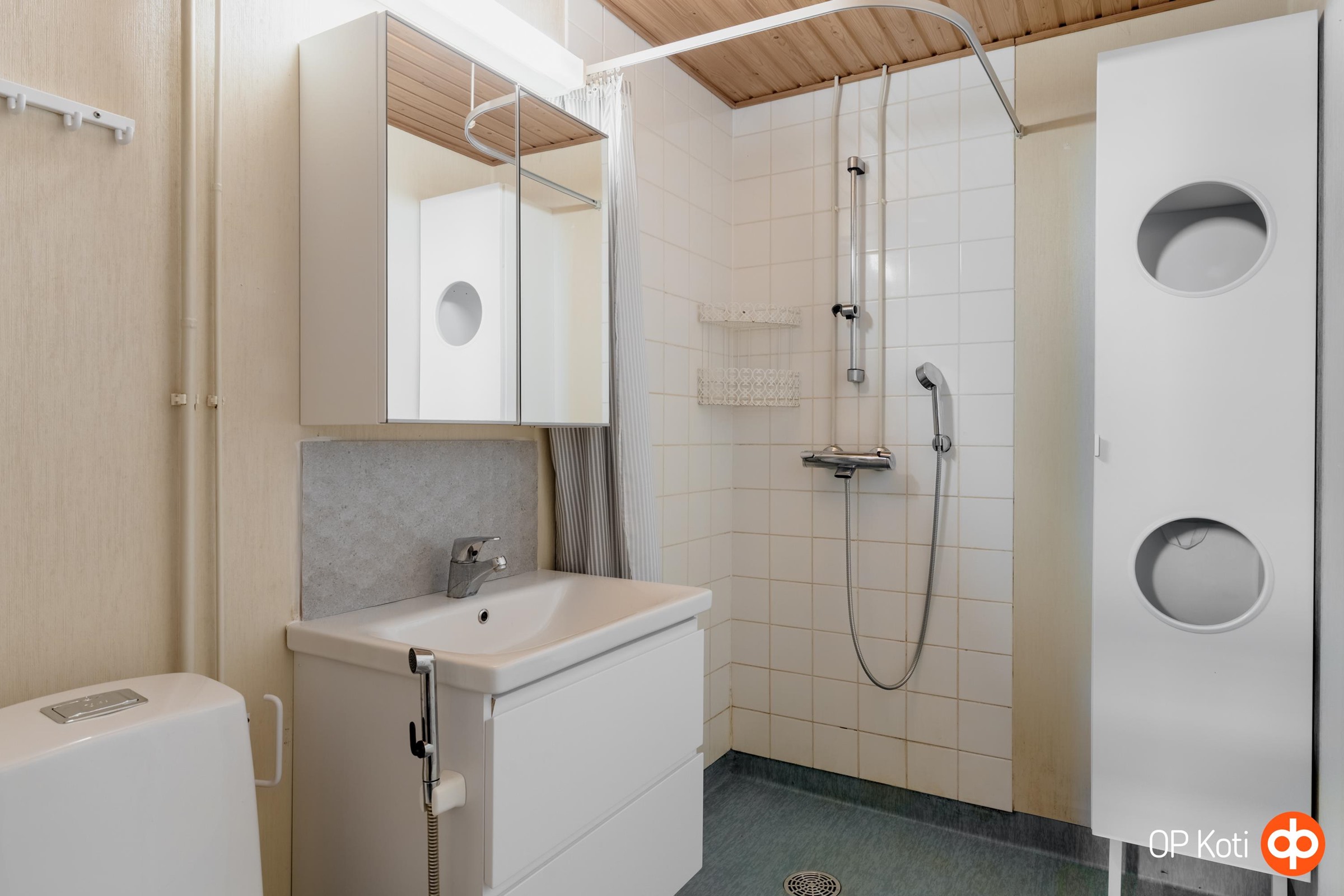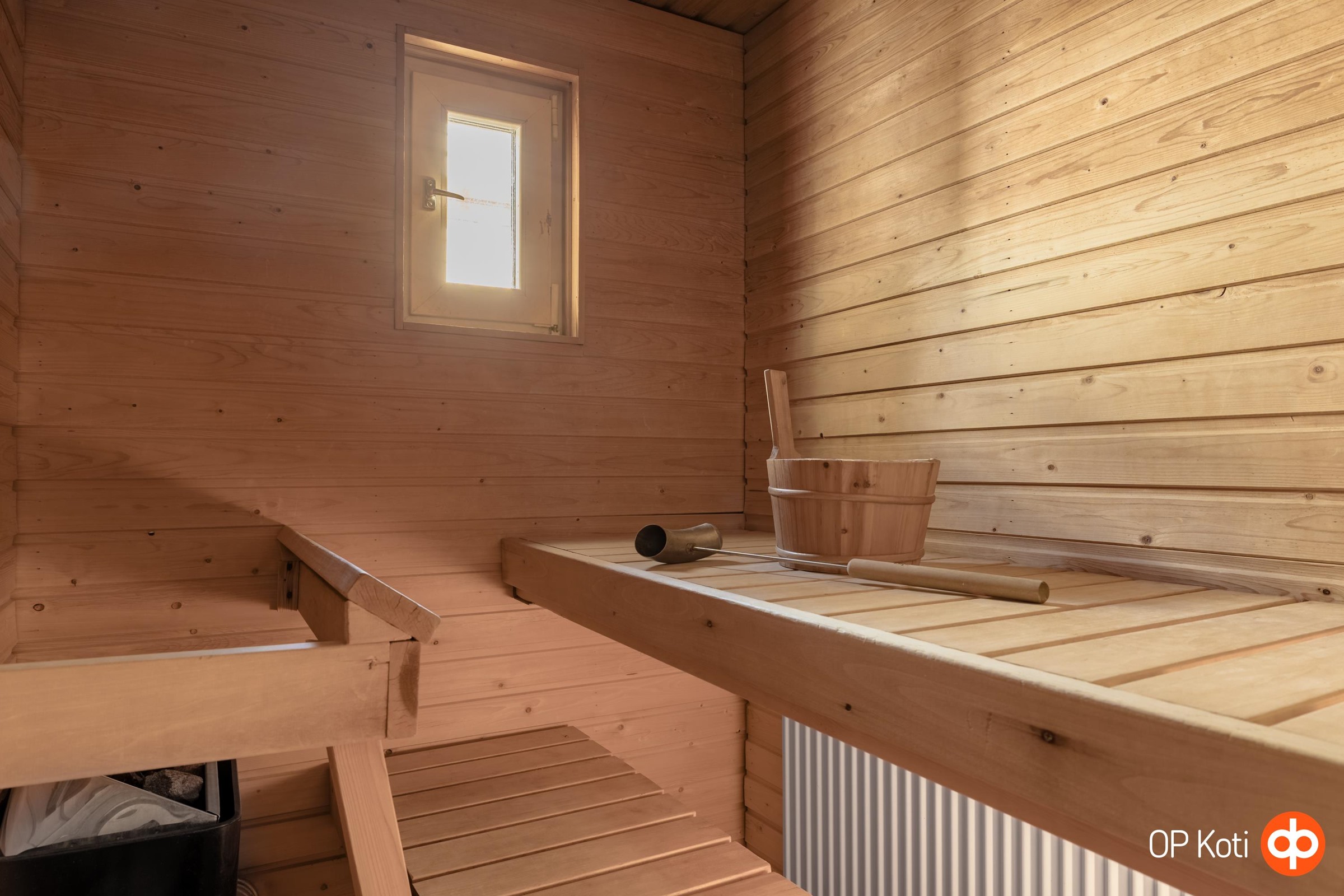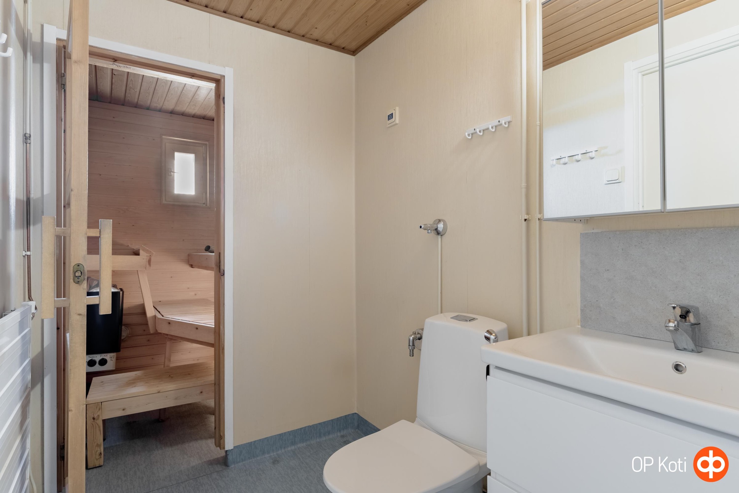 - Sauna, sähkökiuas, kylpyhuone, suihku, pesukoneliitäntä. Alkuperäinen. Muovilattia ja muoviseinät. Sauna paneloitu.