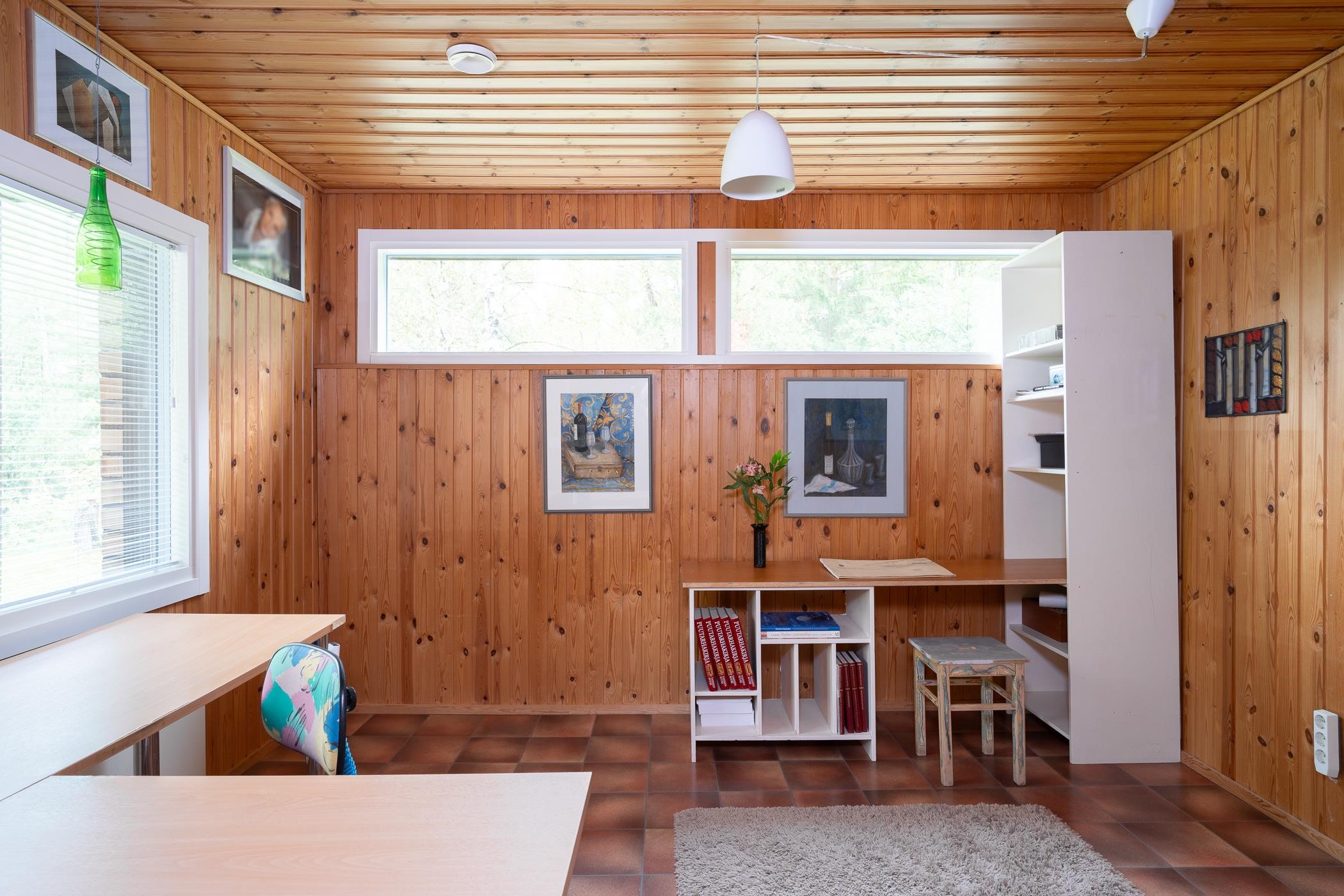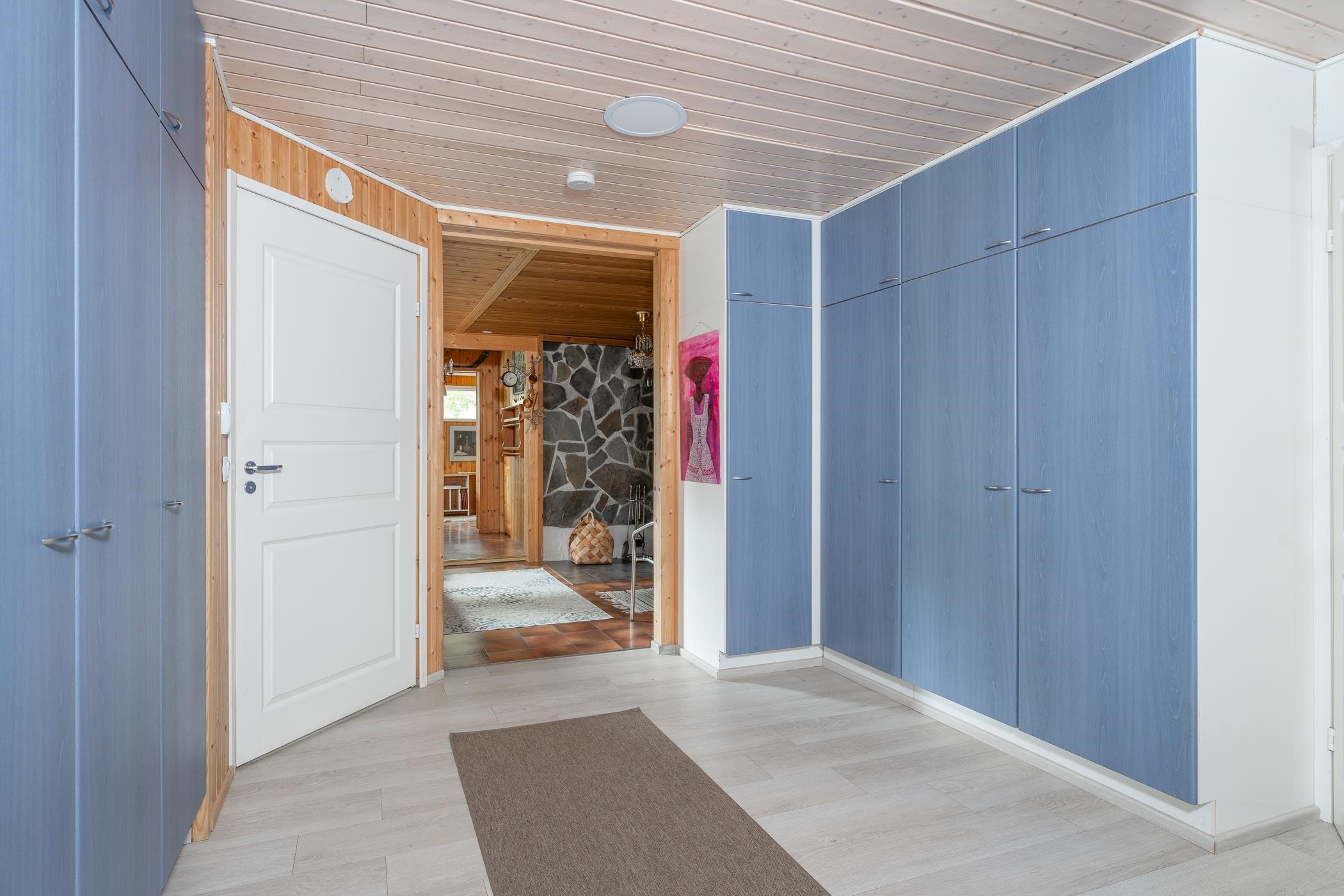 Keittiö: maali, muovimatto. Olohuone: maali/tapetti, laminaatti. Makuuhuone 1: maali, muovimatto. Makuuhuone 2: maali, muovimatto. Kodinhoitohuone: lasikuitutapetti, laatta. Sauna: paneeli, laatta. Kylpyhuone: laatta, laatta. Eteinen: maali, vinyyli. Wc: lasikuitutapetti, laatta. Ruokailutila: maali, laminaatti. Takka-/työhuone: paneeli, laatta/muovimatto.