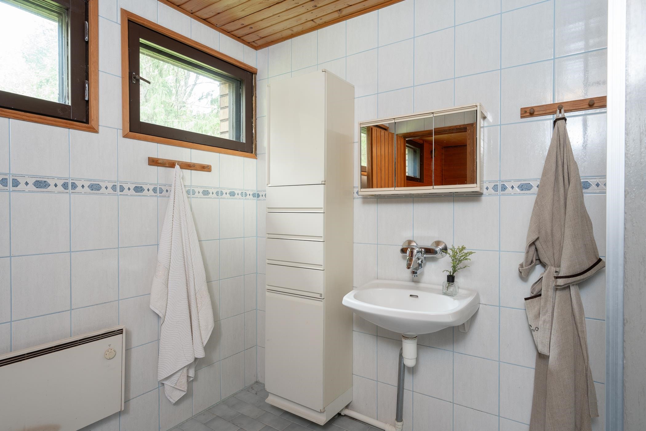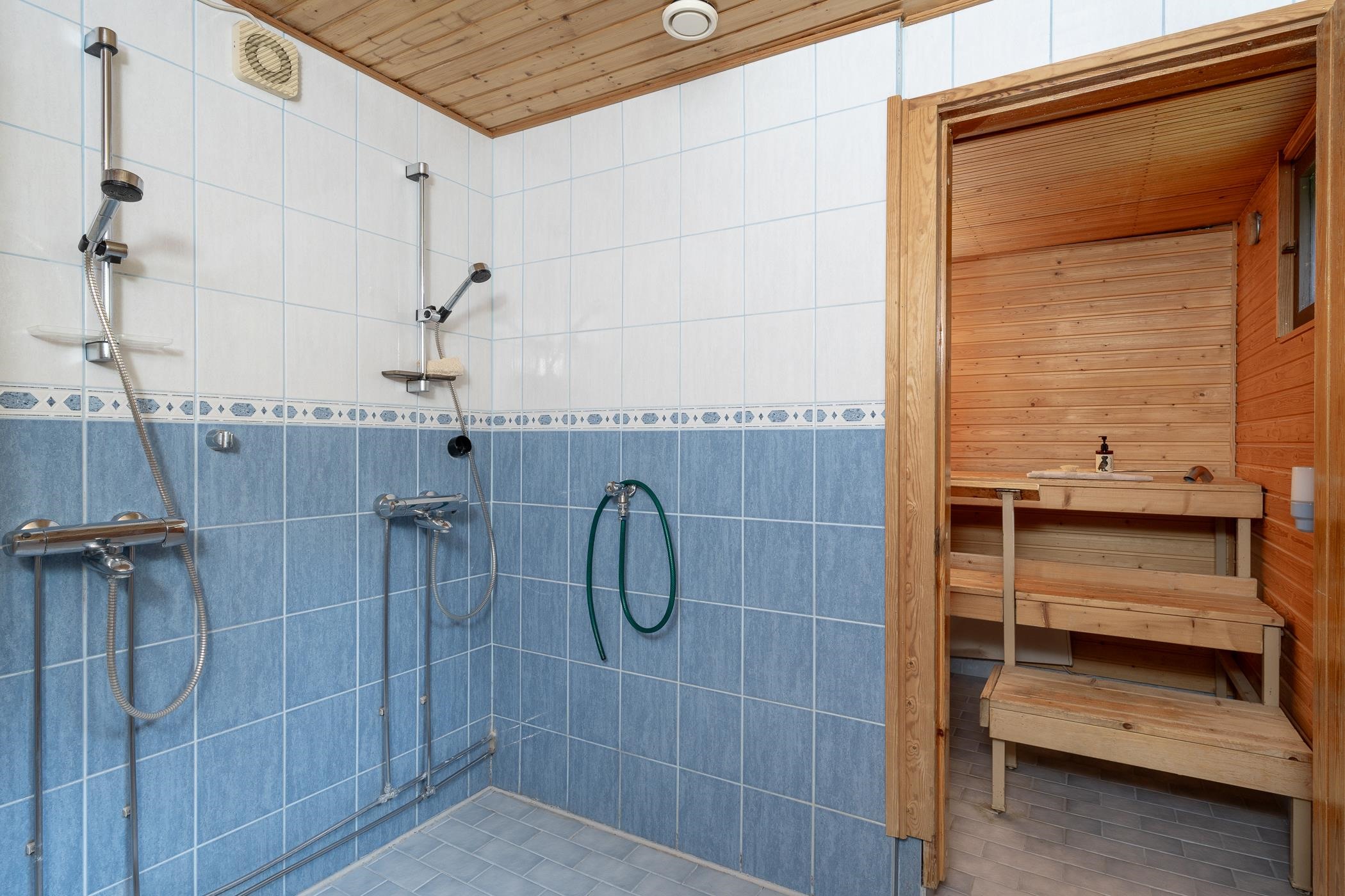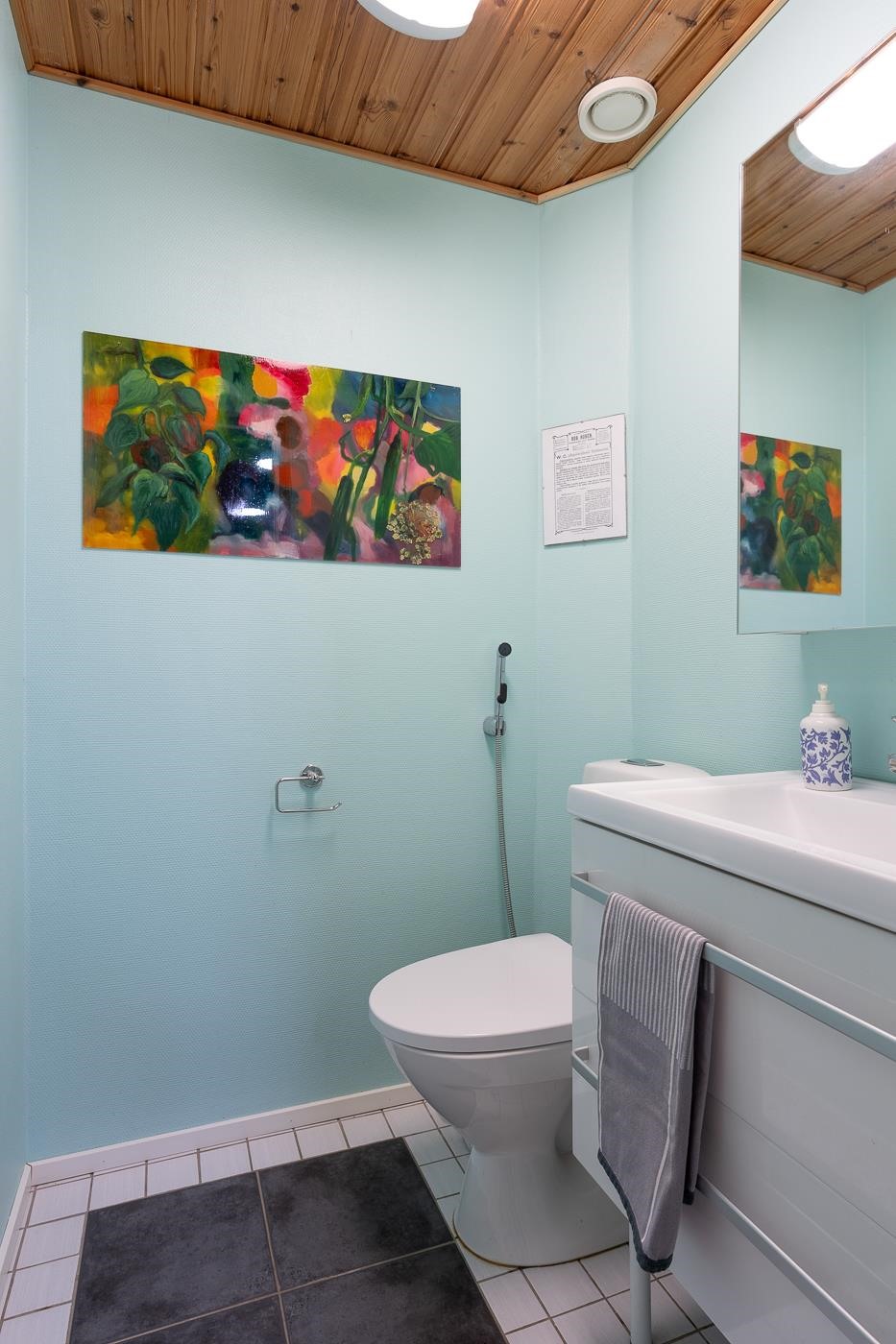 - Sauna, puukiuas, kylpyhuone, erillinen wc, suihku (2 kpl), peilikaappi (wc+kph), allaskaappi, pesukoneliitäntä (khh), lattialämmitys (kph, toiminnasta ei tietoa), kiinteät valaisimet. Kylpyhuoneremontti n. 1999.