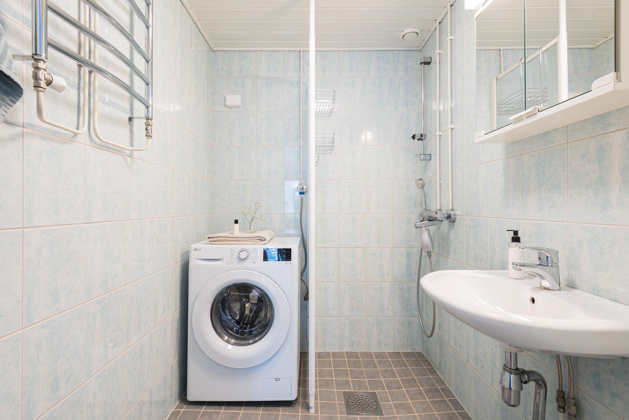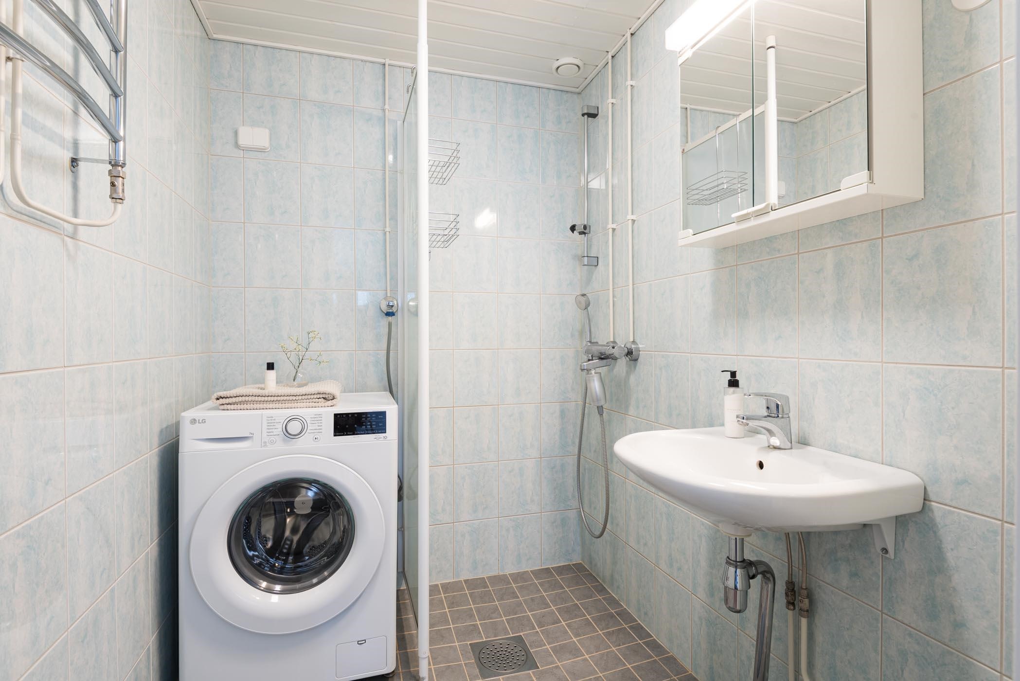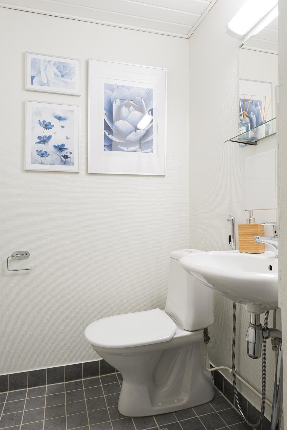 - Kylpyhuoneessa : Suihku ja suihkuseinä, peilikaappi, pyyhepatteri, pesukoneliitäntä ja kiinteät valaisimet. Erillinen WC : WC, peili ja kiinteät valaisimet.