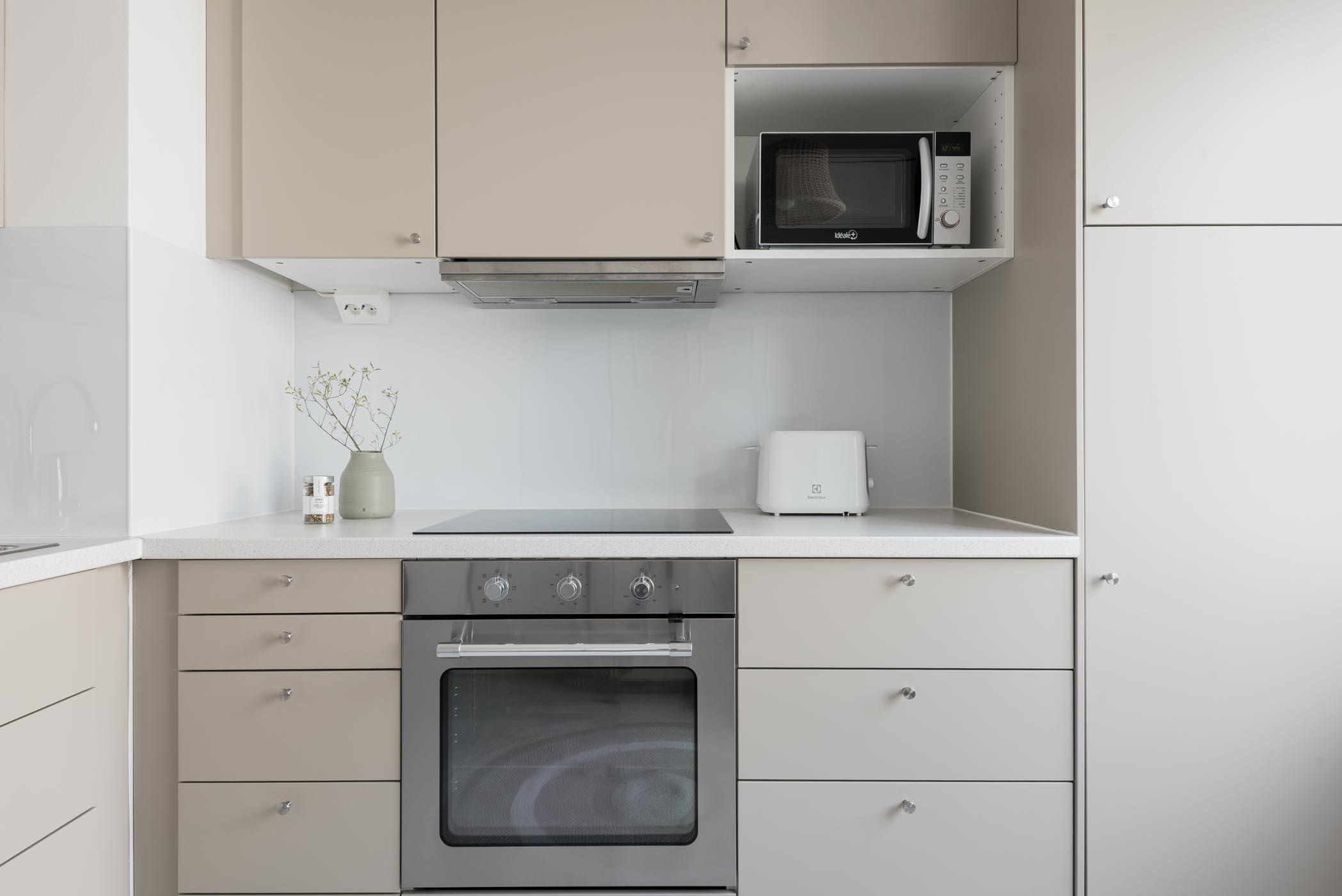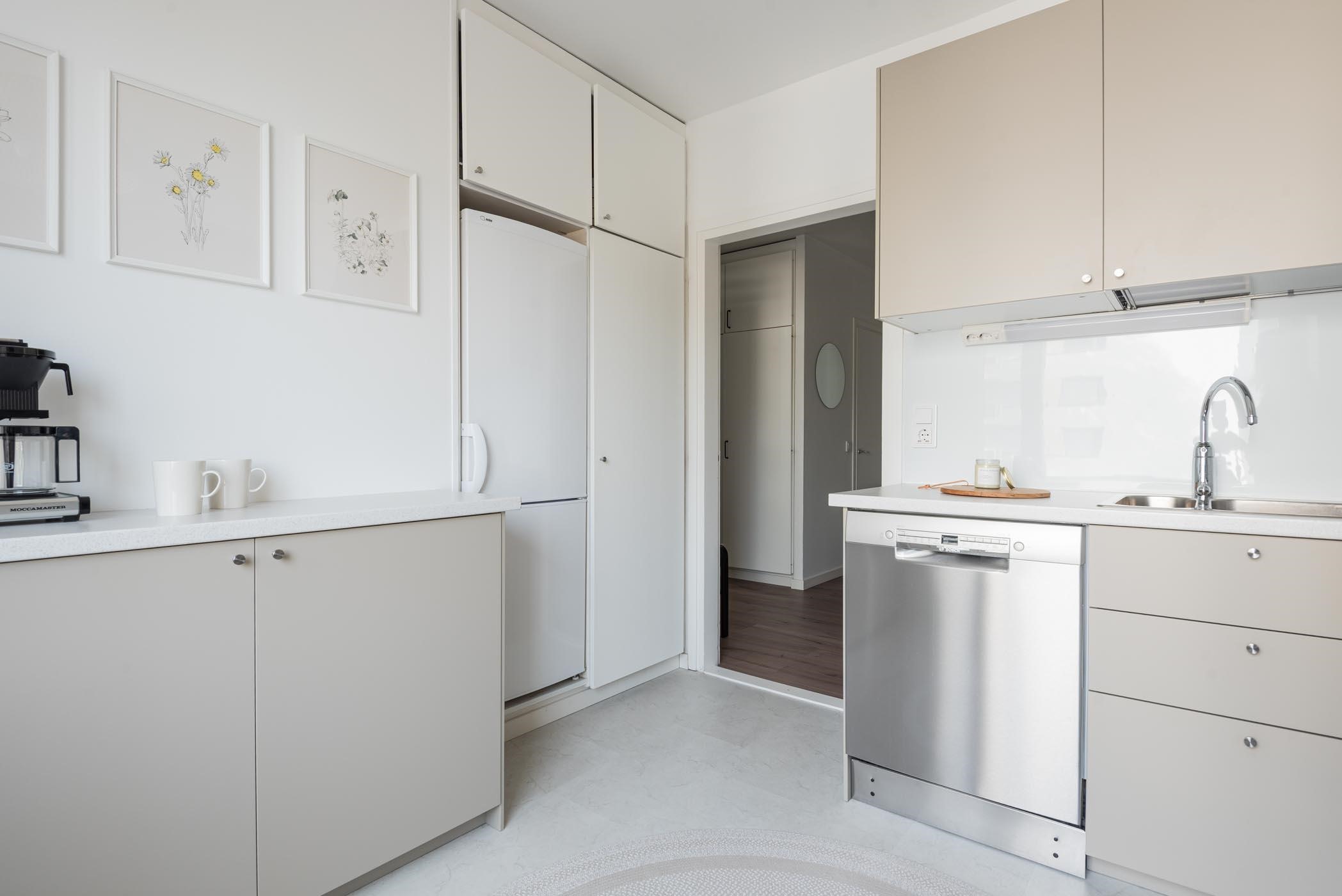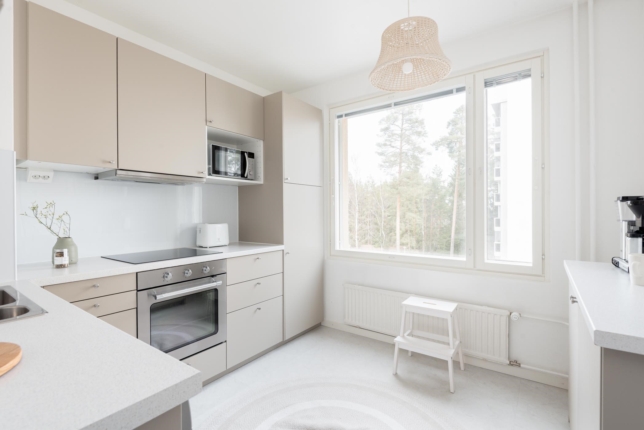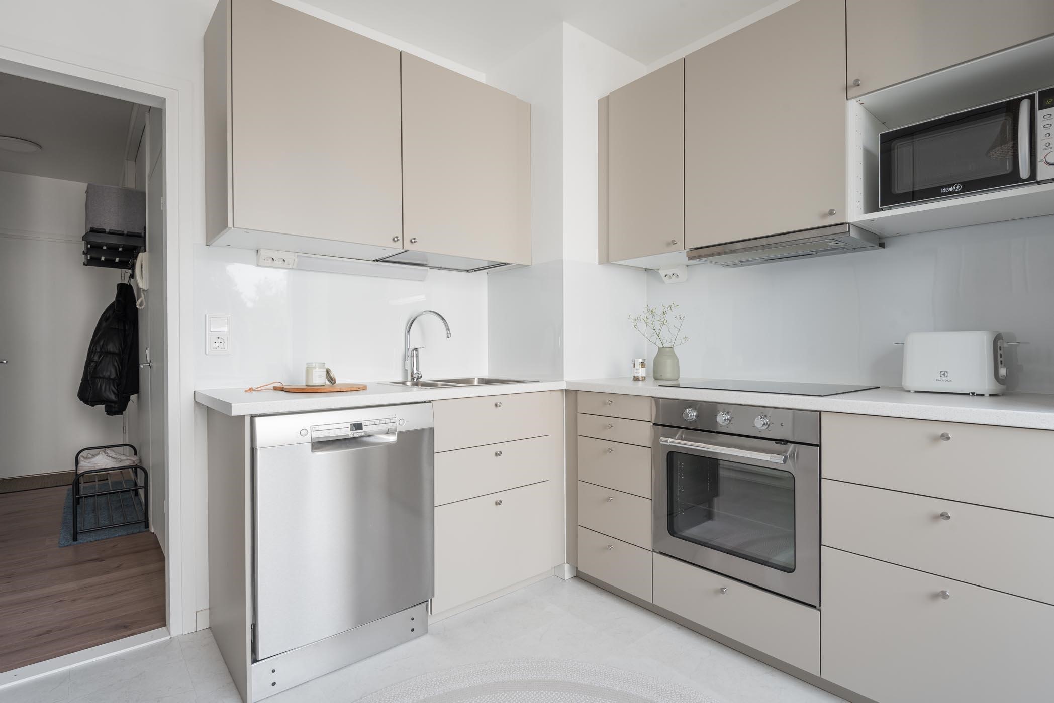 - Keittiössä : Jääkaappipakastin, integroitu erillisuuni, liesikupu, integroitu keraaminen liesitaso, astianpesukone kaapistot ja kiinteät valaisimet. Keittiössä mukavasti kaappi ja laskutilaa. Keittiöremontti tehty 2023.