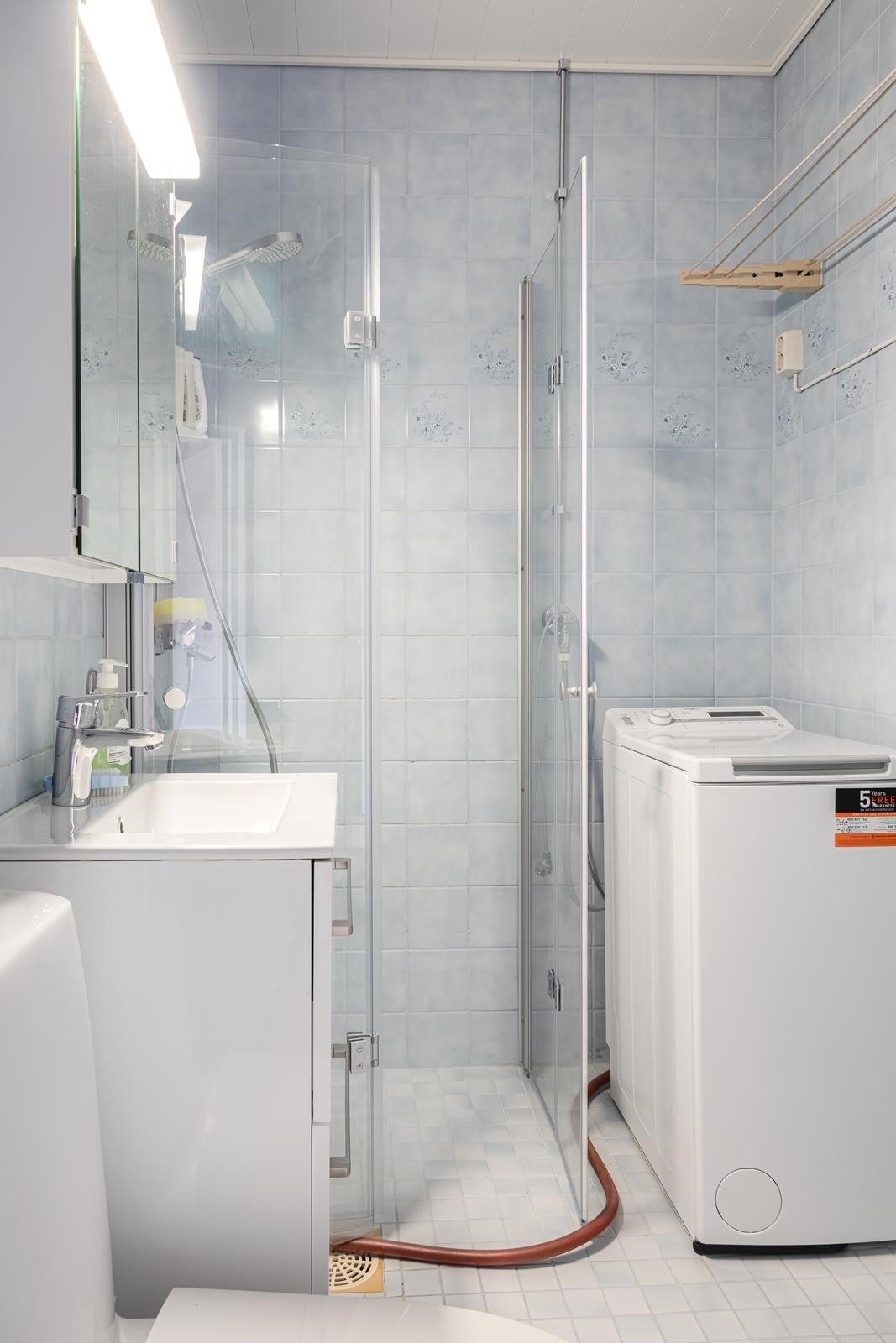 - Suihku, suihkukaappi, peilikaappi, allaskaappi, pesukoneliitäntä.