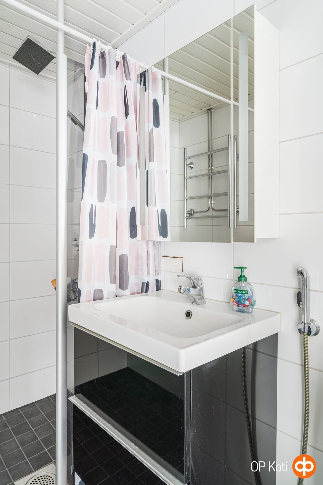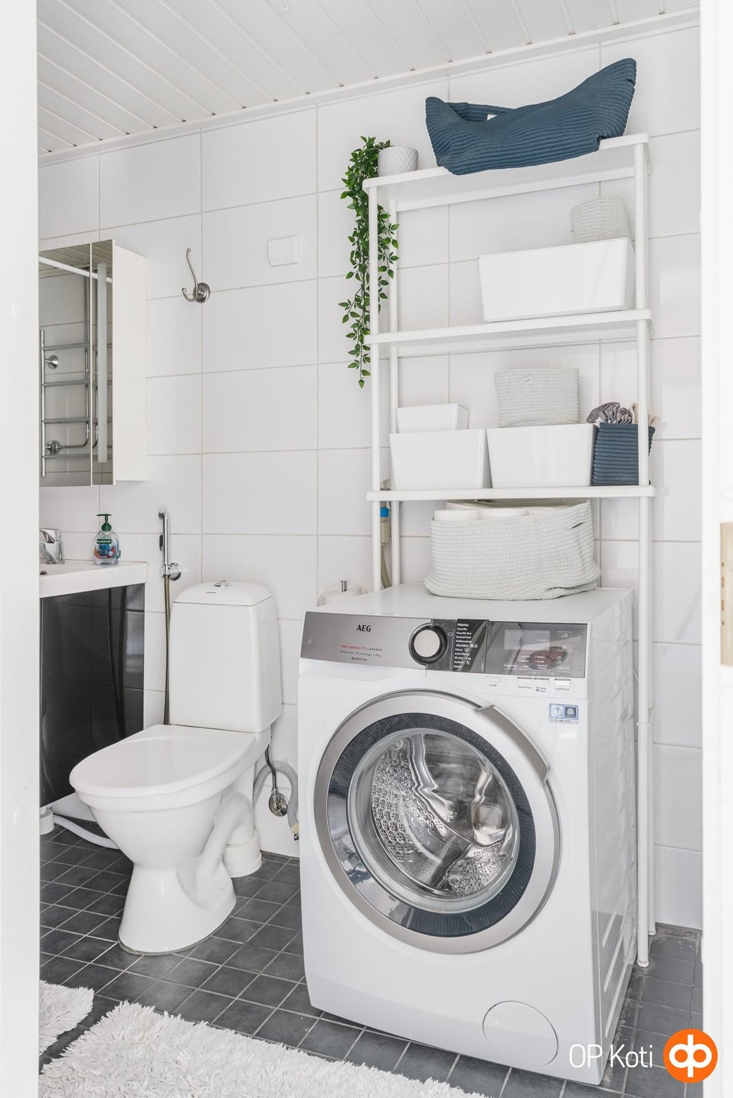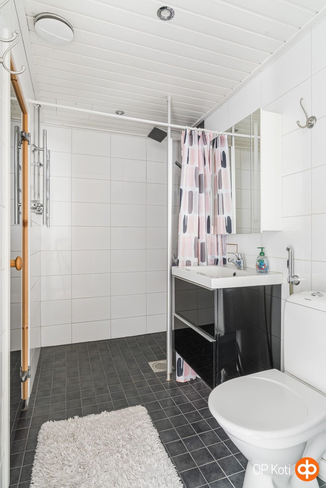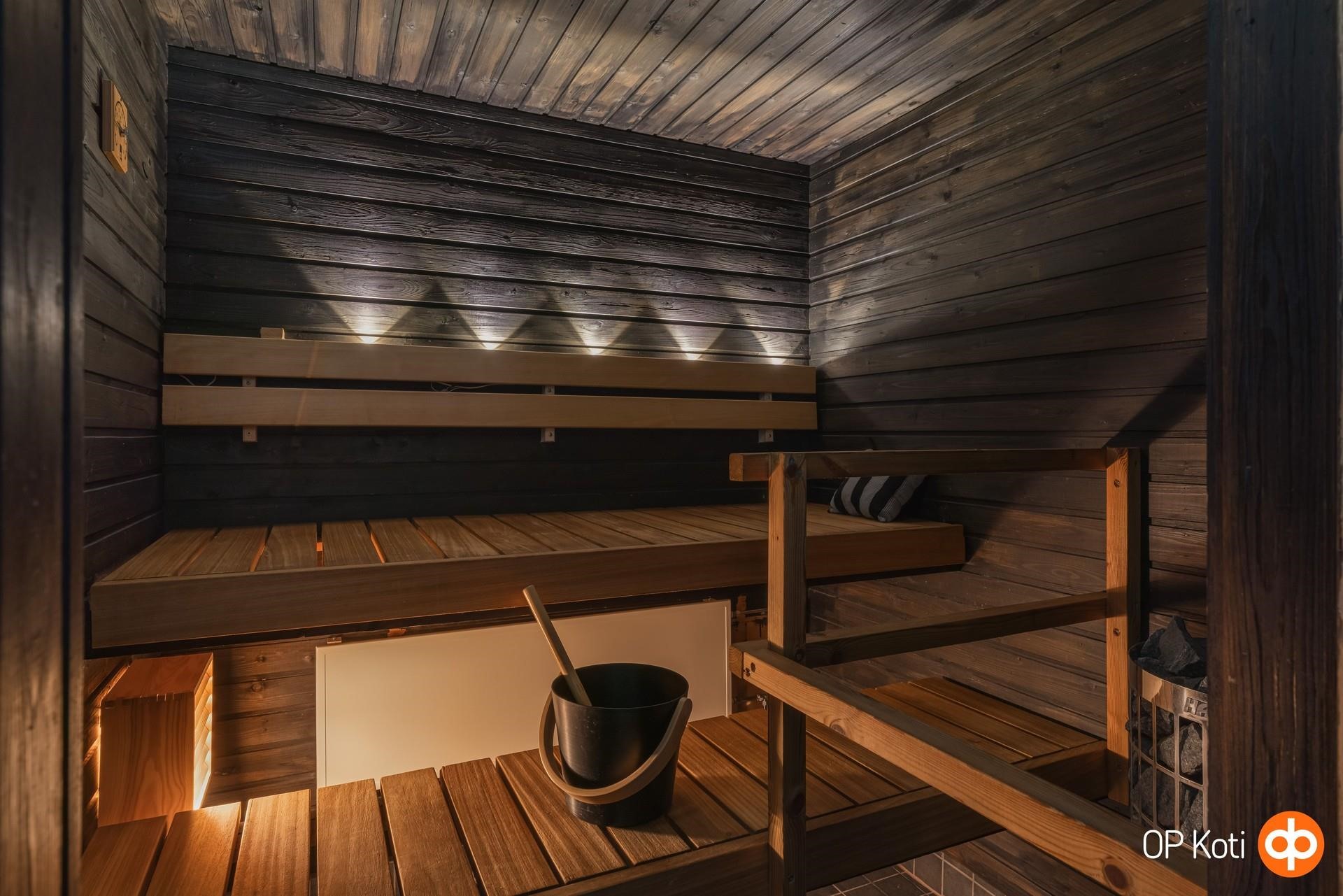 - Sauna, sähkökiuas, kylpyhuone, suihku, suihkuseinä, peilikaappi, allaskaappi, pesukoneliitäntä, kiinteät valaisimet. Pyyhepatteri (vesikiertonen)