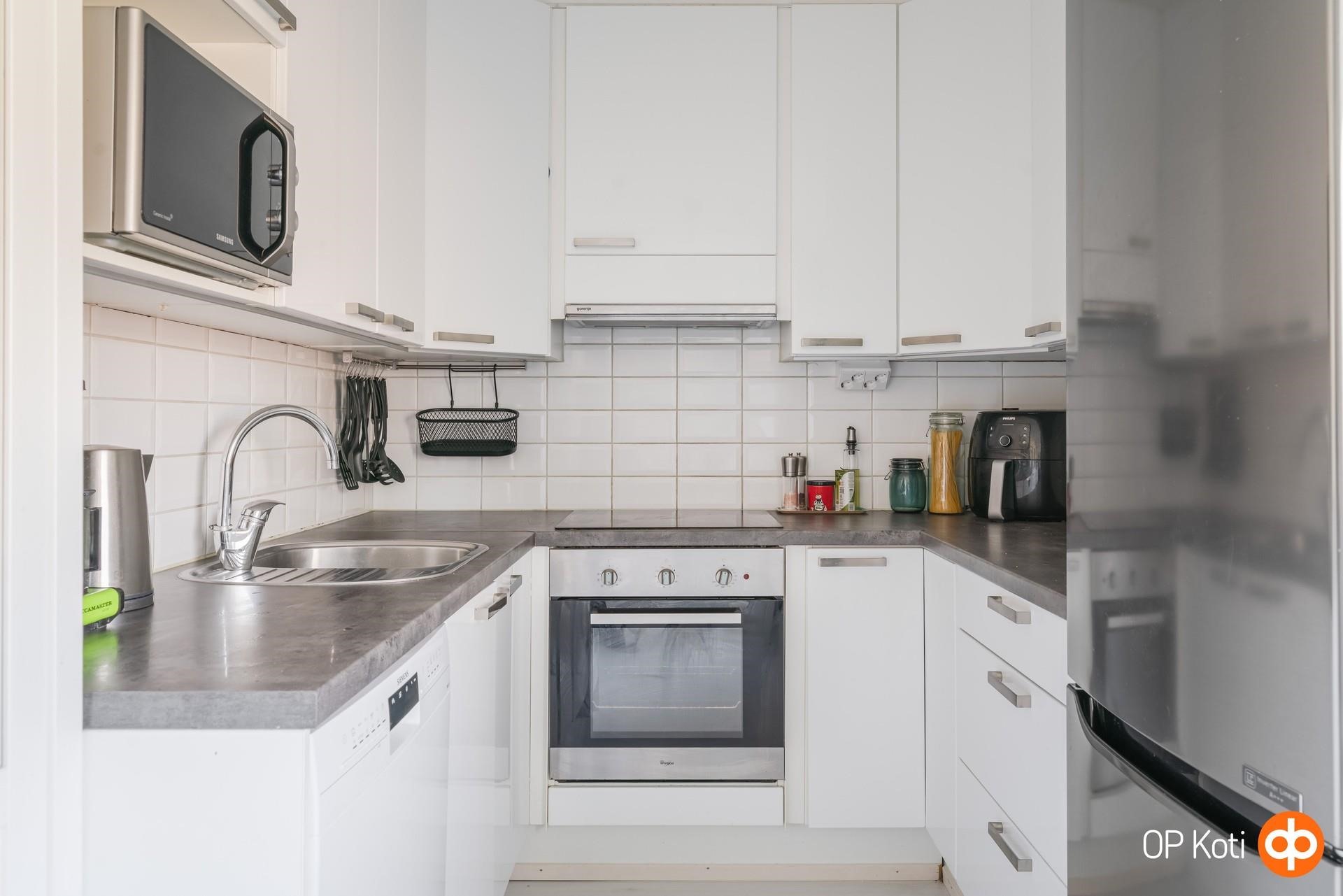 - Jääkaappipakastin, erillisuuni, induktioliesi, liesituuletin, astianpesukone, kaapistot, kiinteät valaisimet.