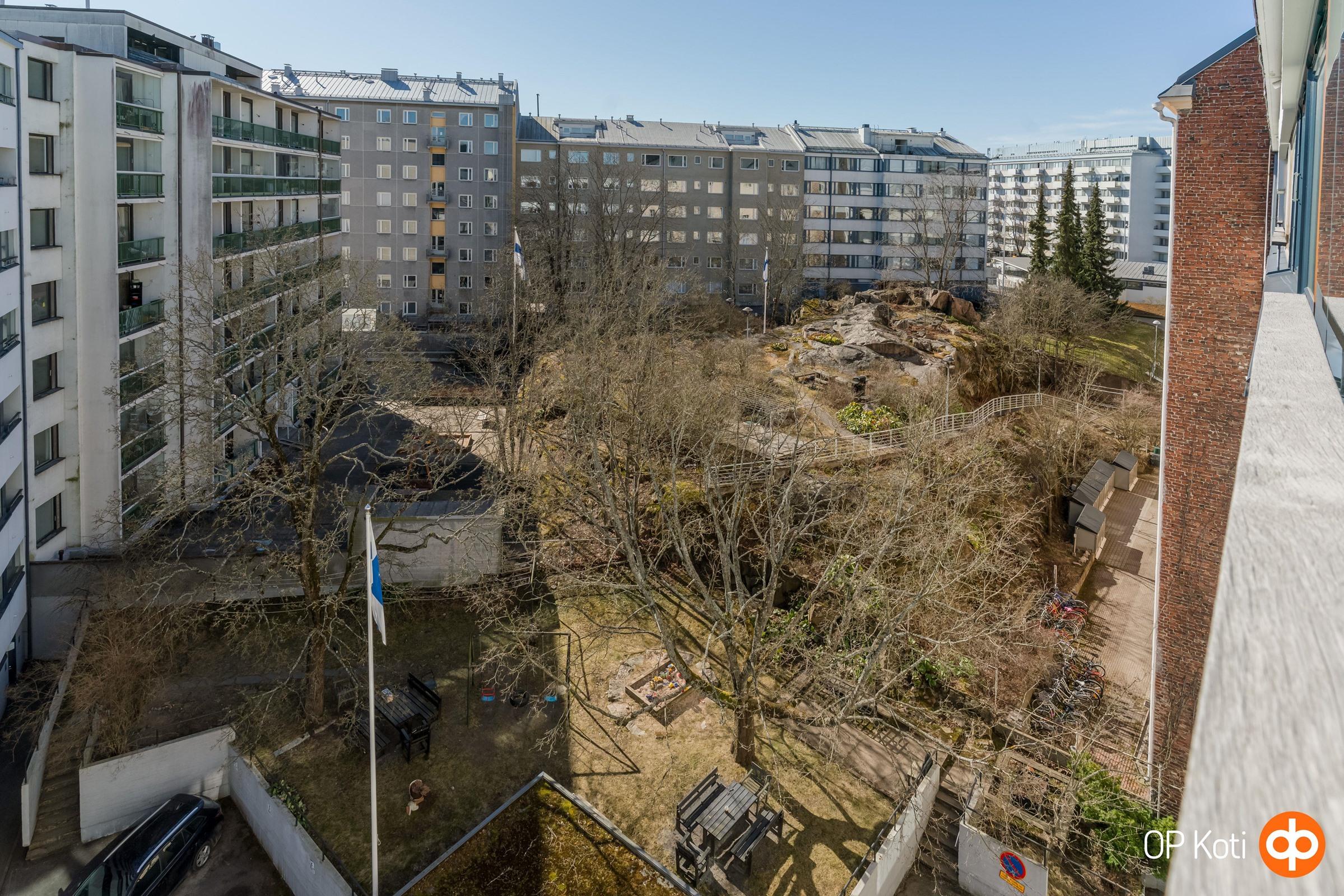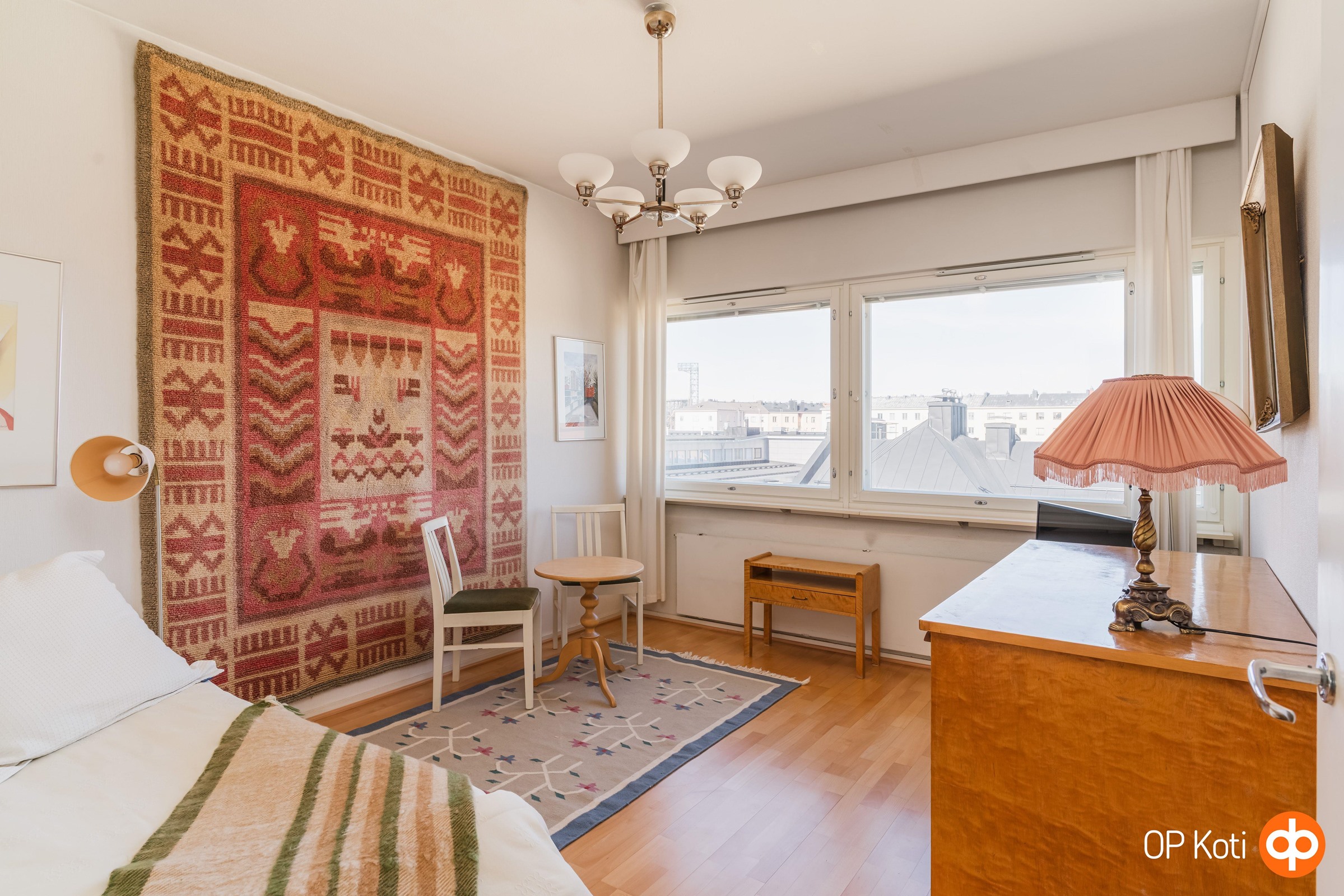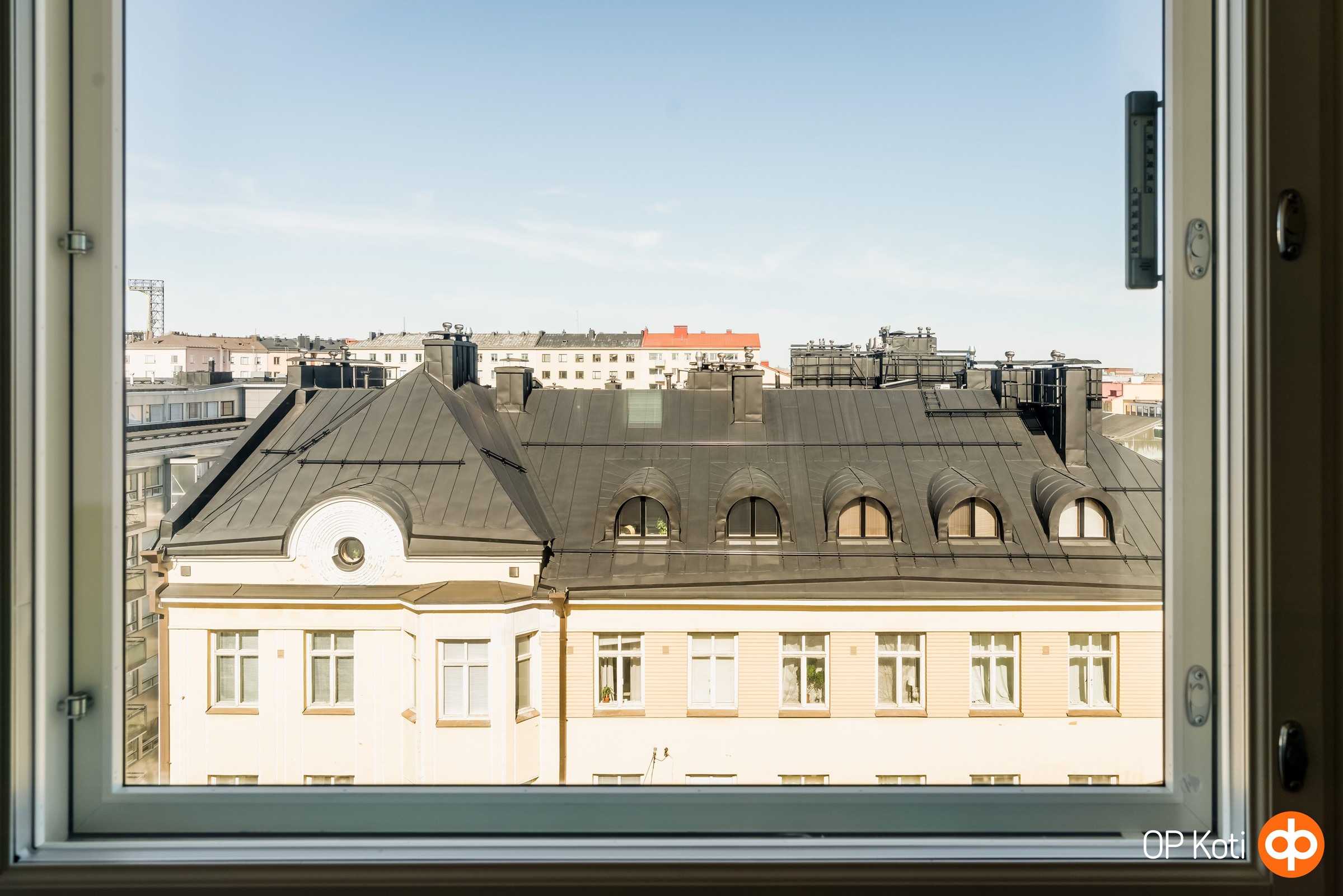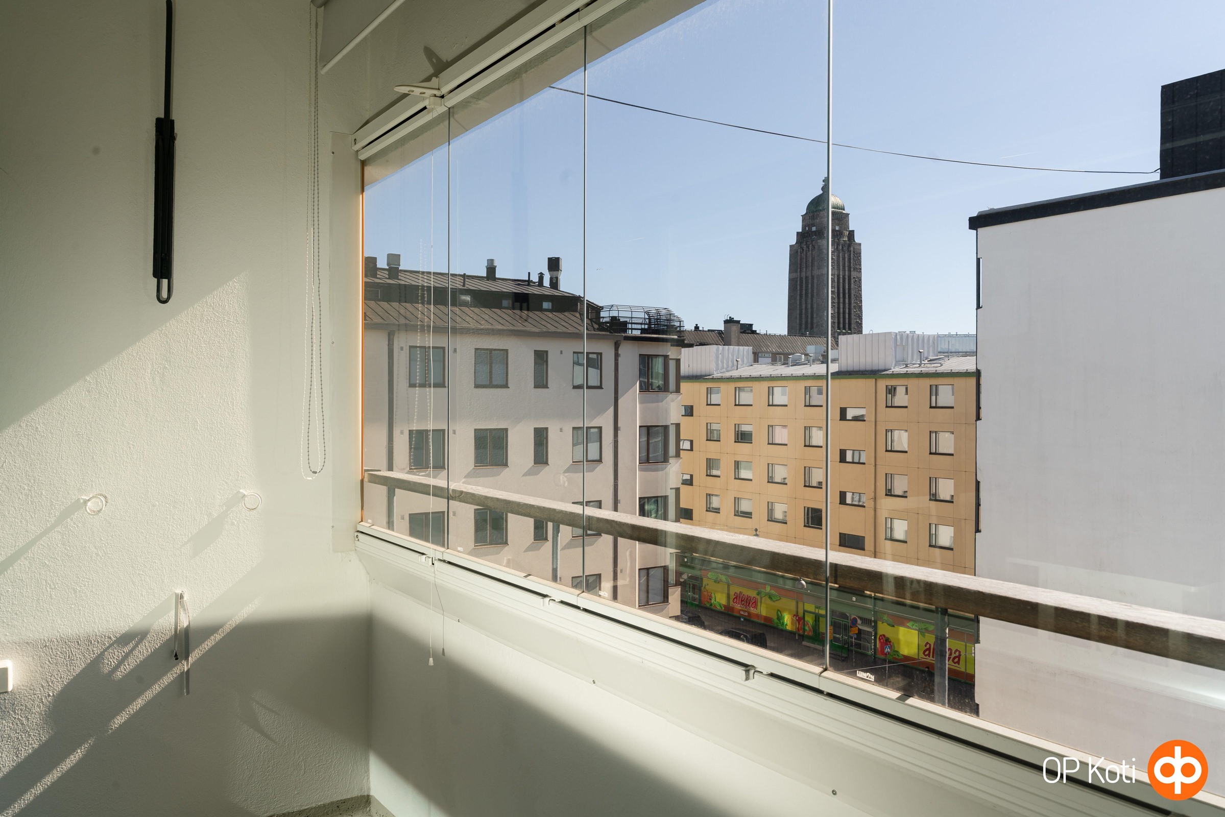 Tilava kalliolainen kaksio korkealta, yhtiön ylimmästä asuinkerroksesta. Olohuoneen jatkeena avautuva lasitettu parveke tarjoaa upeat etelänäkymät Kallion kirkolle. Läpitalon pohjan ansiosta makuuhuoneesta ja keittiöstä avautuvat näkymät Linnanmäen suuntaan.