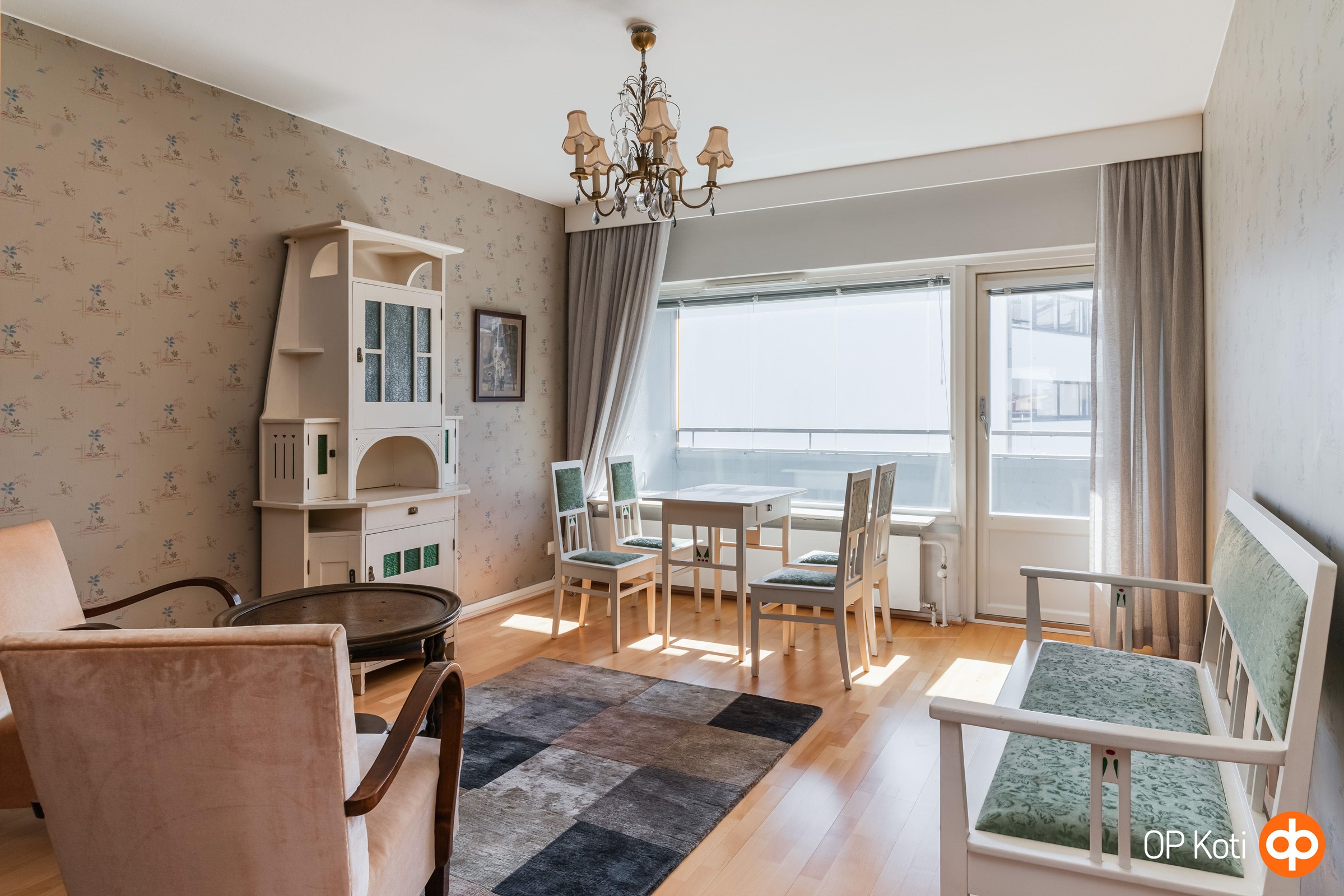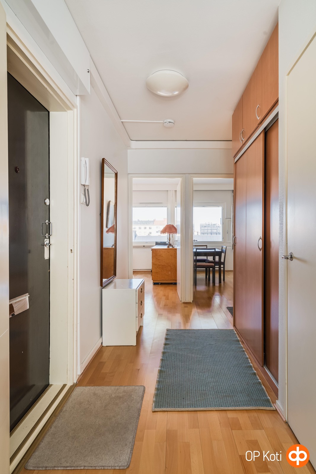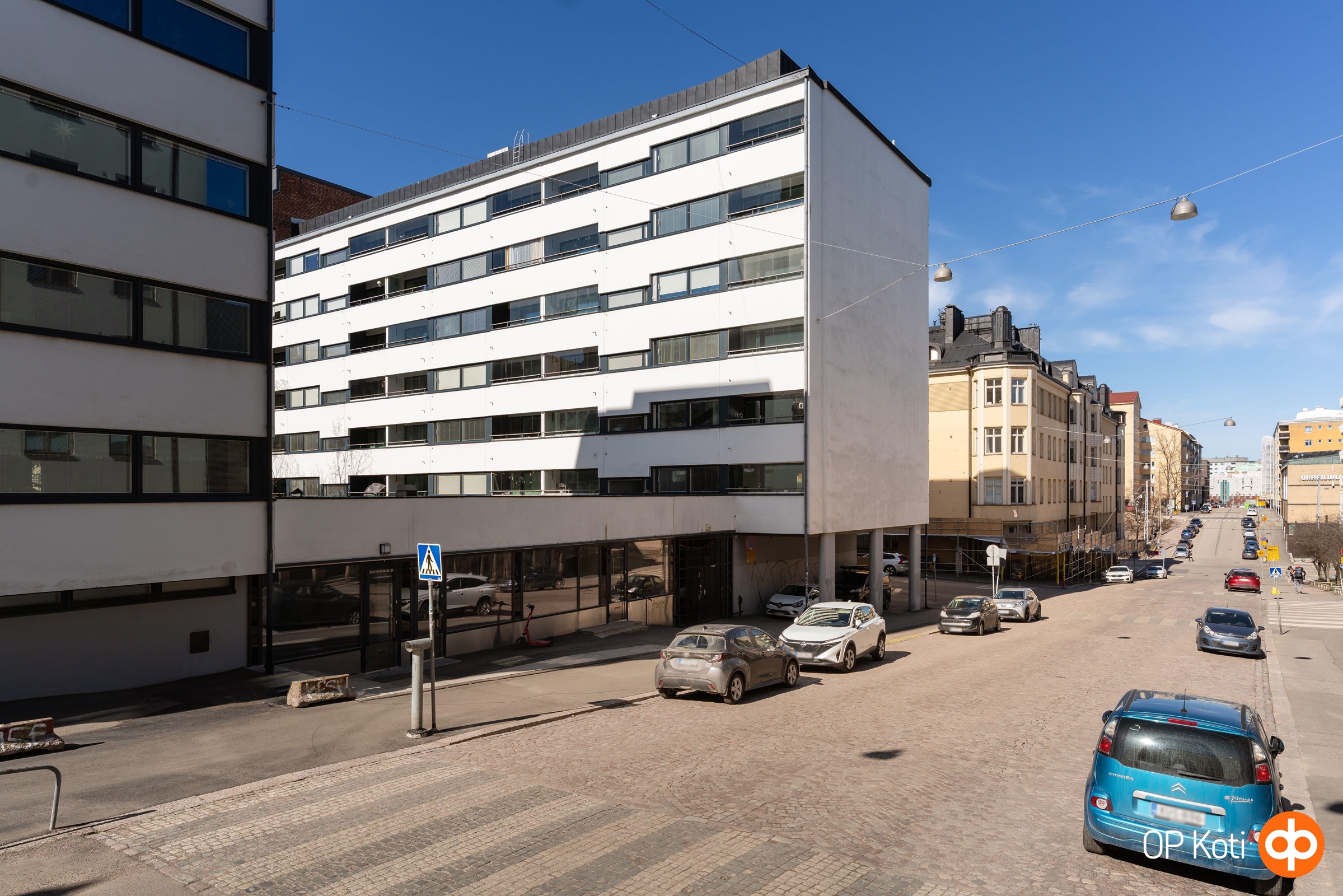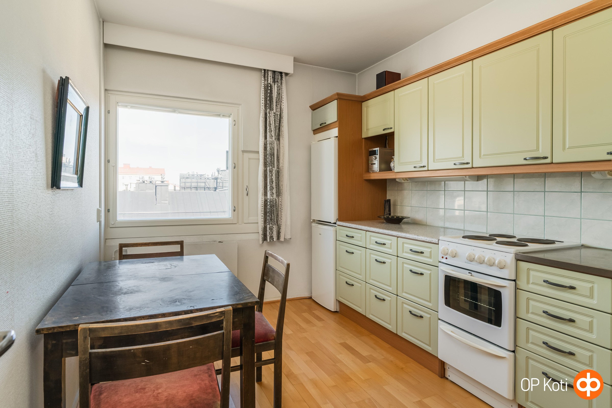 Tilava kalliolainen kaksio korkealta, yhtiön ylimmästä asuinkerroksesta. Olohuoneen jatkeena avautuva lasitettu parveke tarjoaa upeat etelänäkymät Kallion kirkolle. Läpitalon pohjan ansiosta makuuhuoneesta ja keittiöstä avautuvat näkymät Linnanmäen suuntaan.