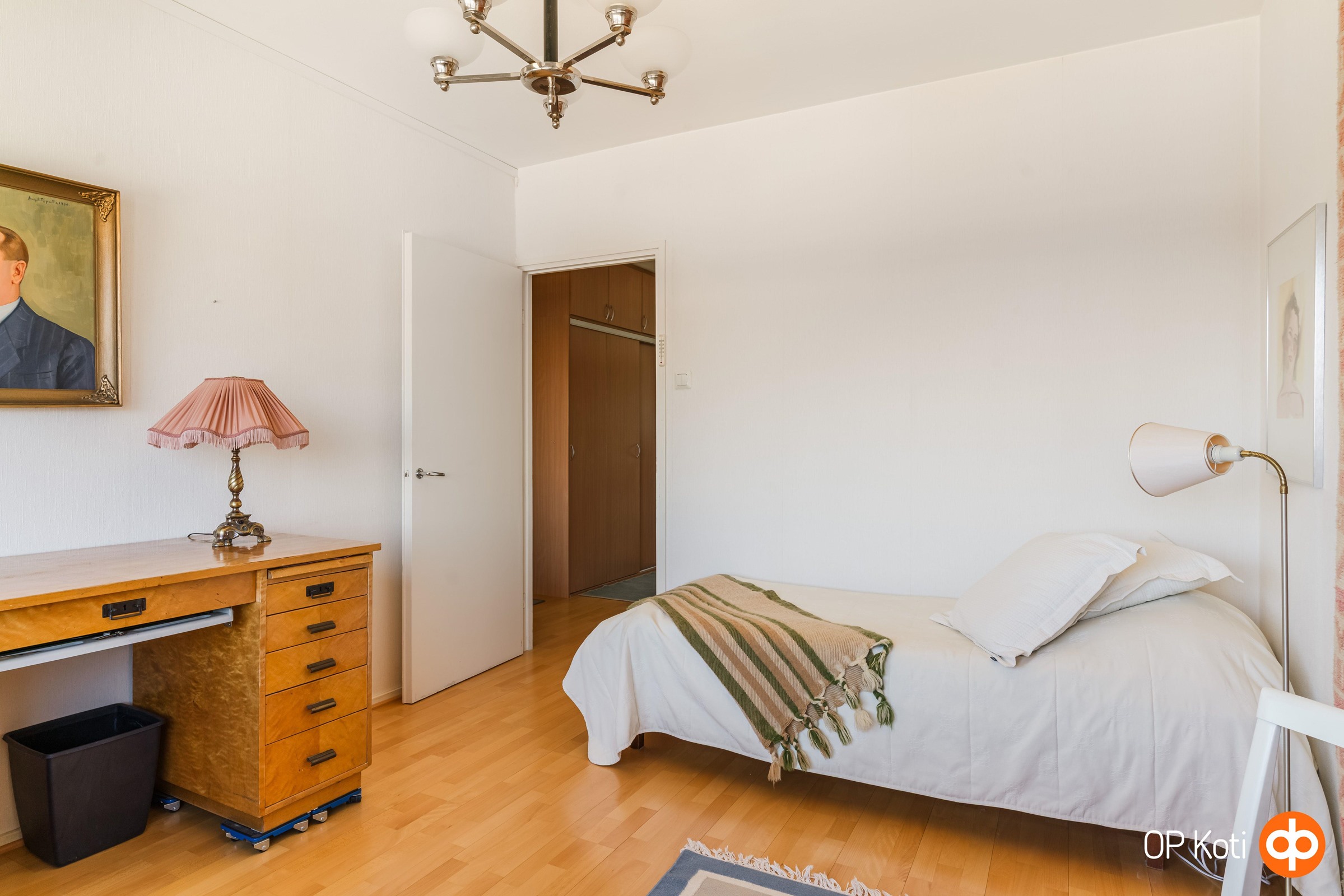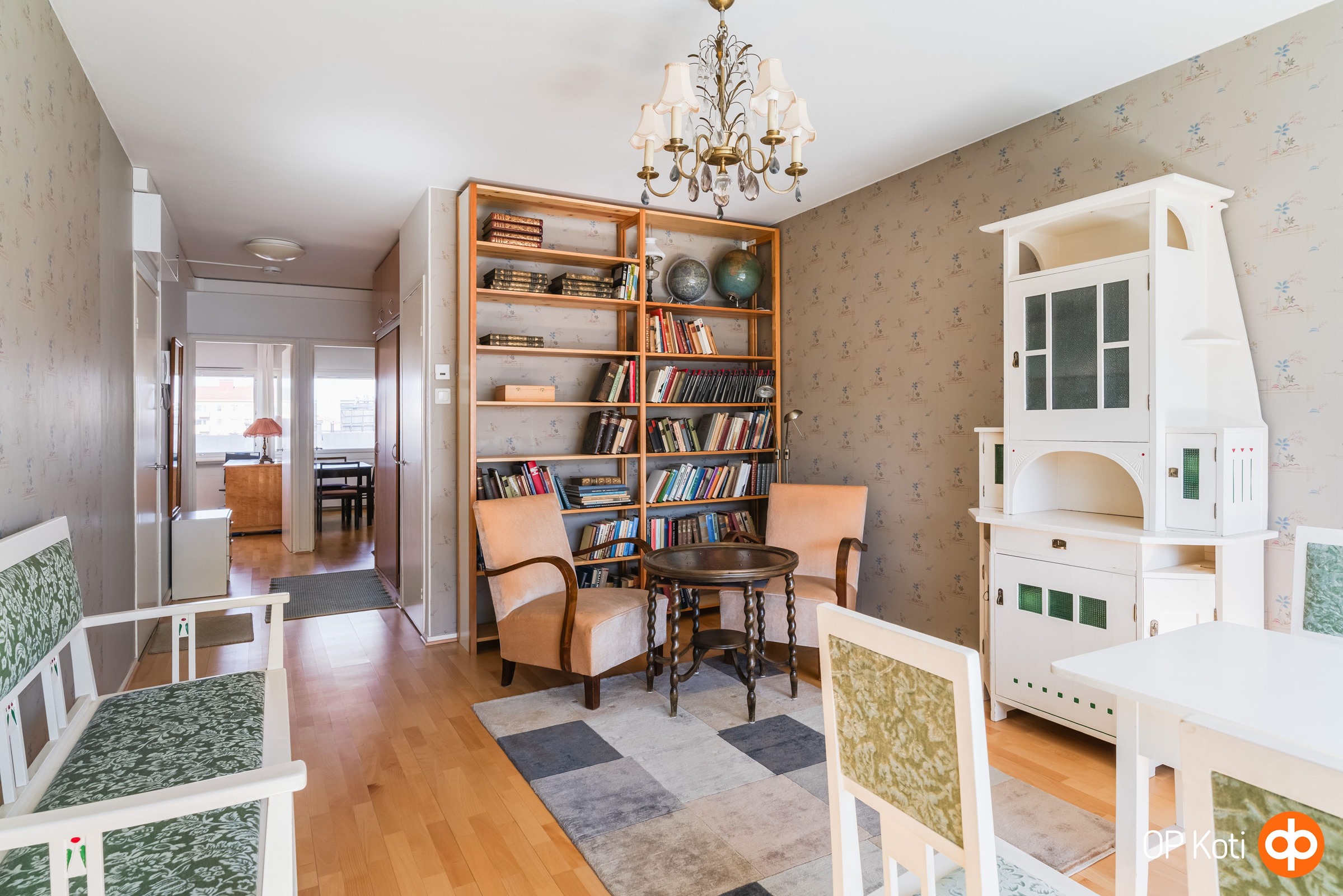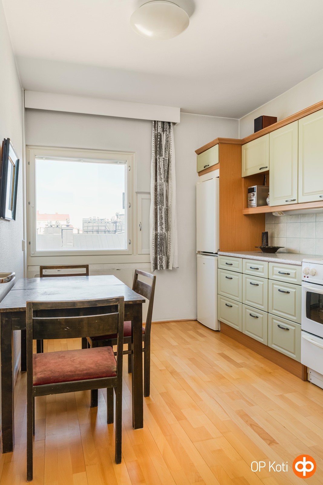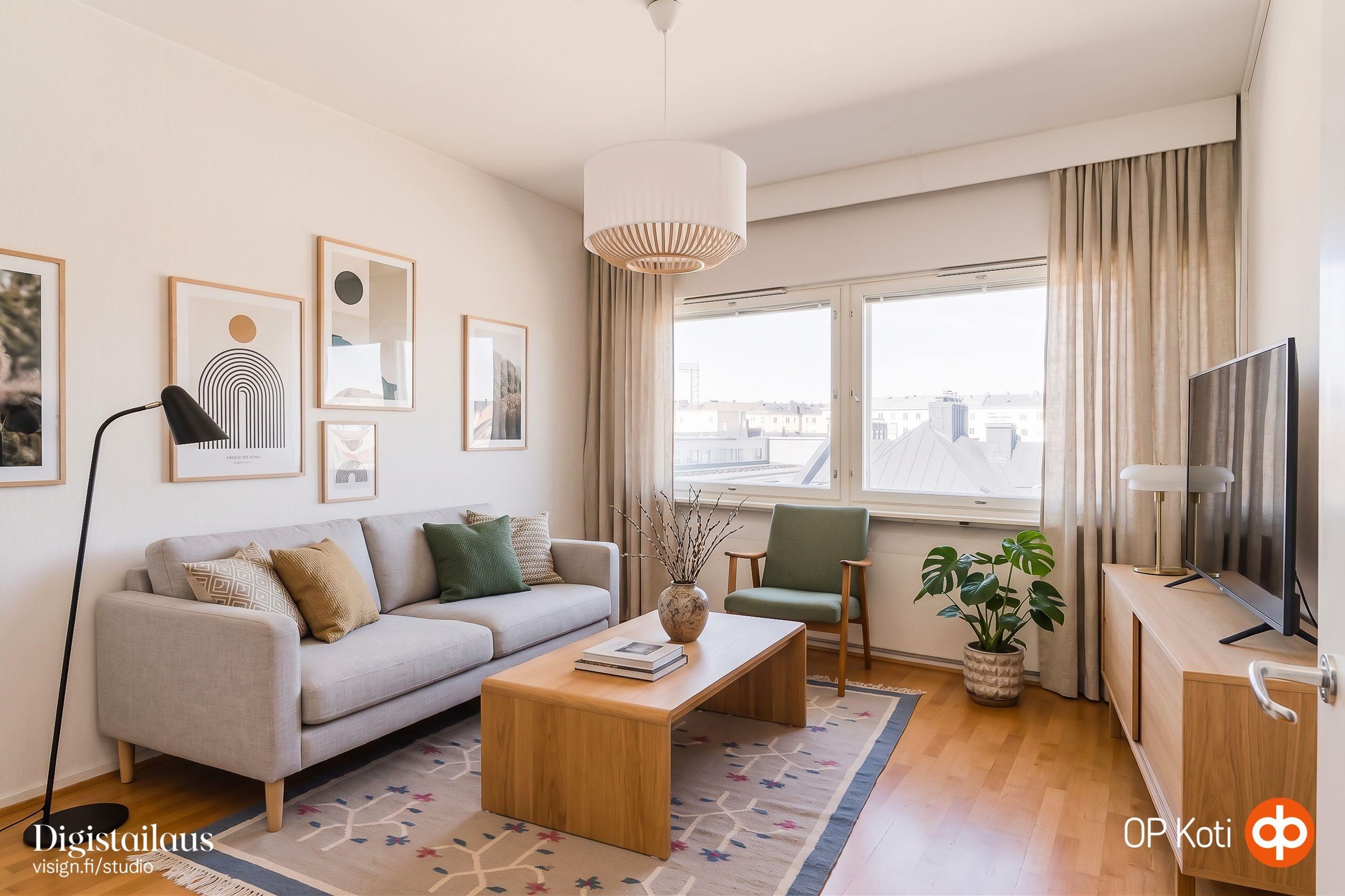 Tilava kalliolainen kaksio korkealta, yhtiön ylimmästä asuinkerroksesta. Olohuoneen jatkeena avautuva lasitettu parveke tarjoaa upeat etelänäkymät Kallion kirkolle. Läpitalon pohjan ansiosta makuuhuoneesta ja keittiöstä avautuvat näkymät Linnanmäen suuntaan.