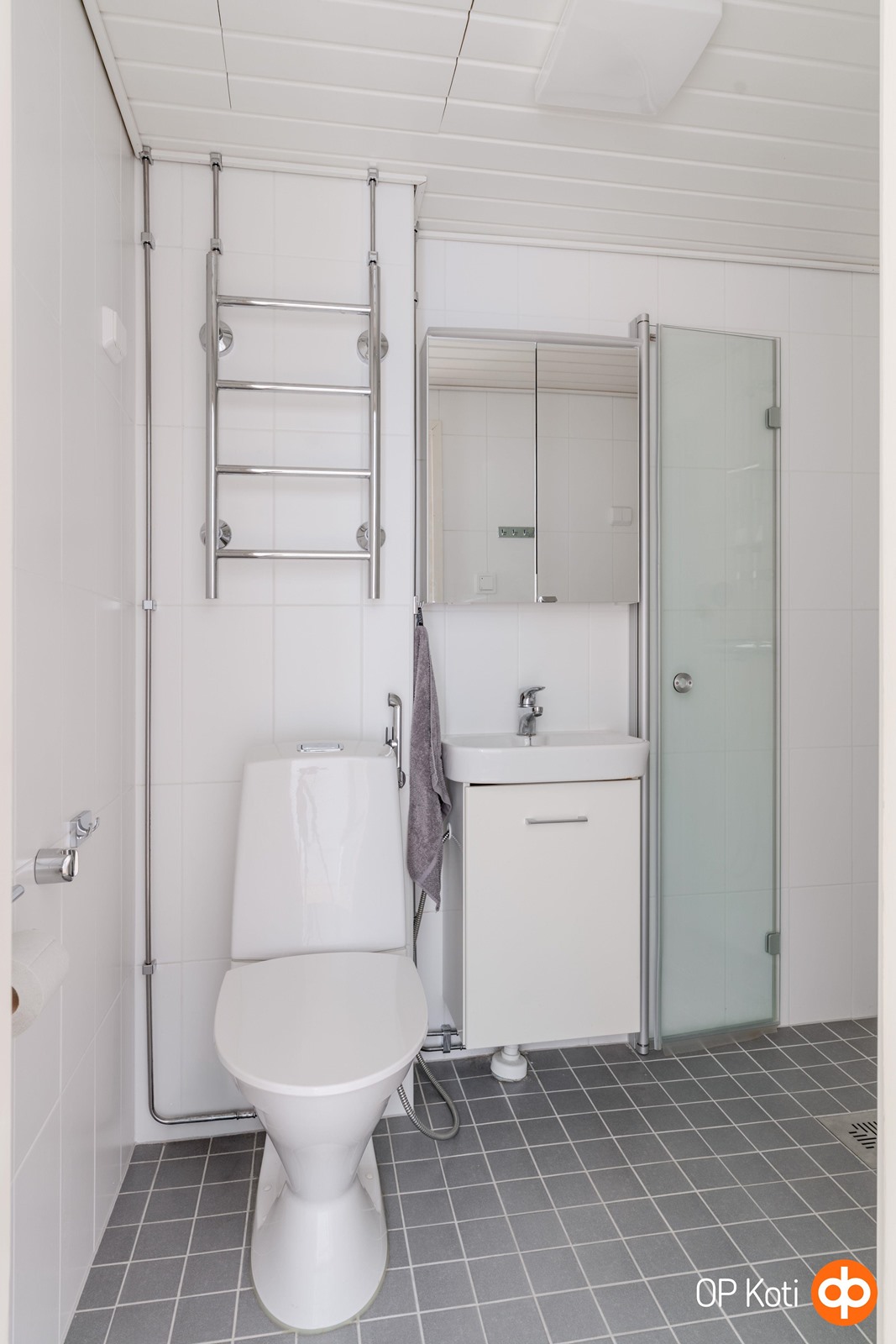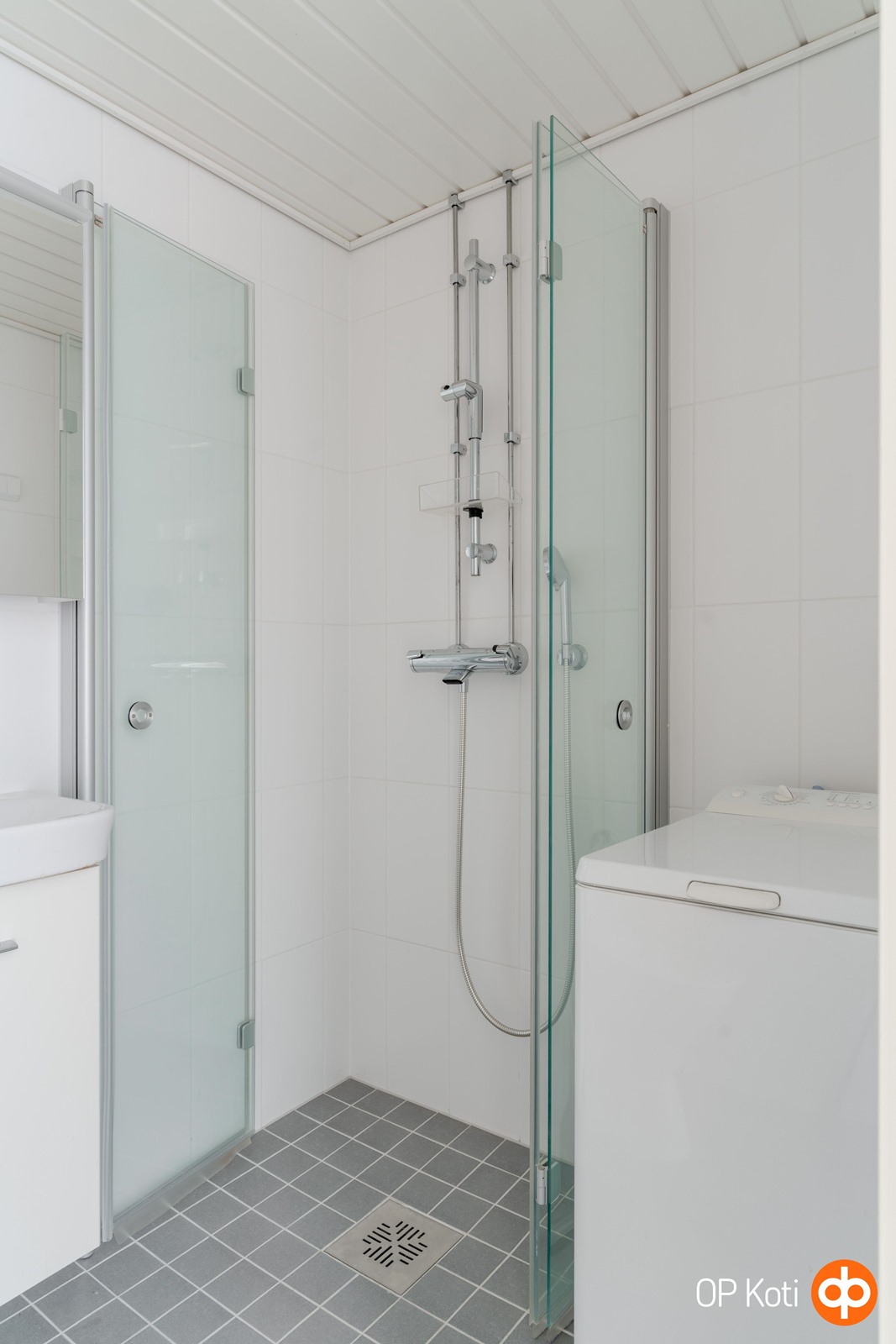 - Kylpyhuone, suihku suihkunurkka, peilikaappi, allaskaappi, pesukoneliitäntä, lattialämmitys sähkötoiminen, kiinteät valaisimet. pyyhekuivain vesikiertoinen