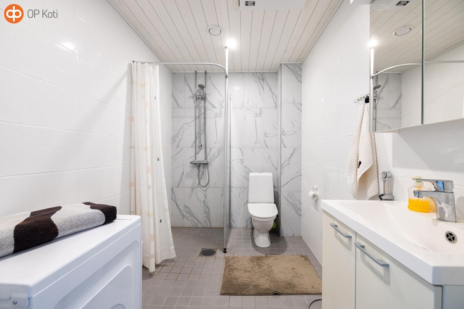 - Suihku, suihkuseinä, peilikaappi, allaskaappi, pesukoneliitäntä, lattialämmitys.