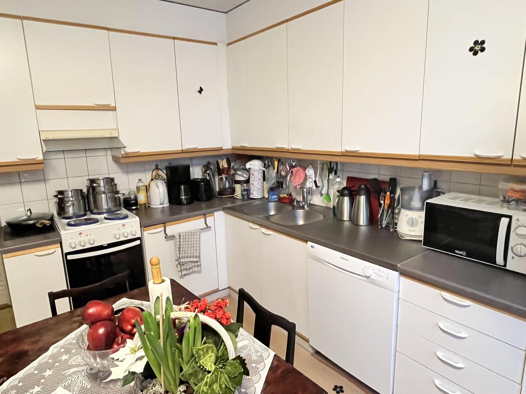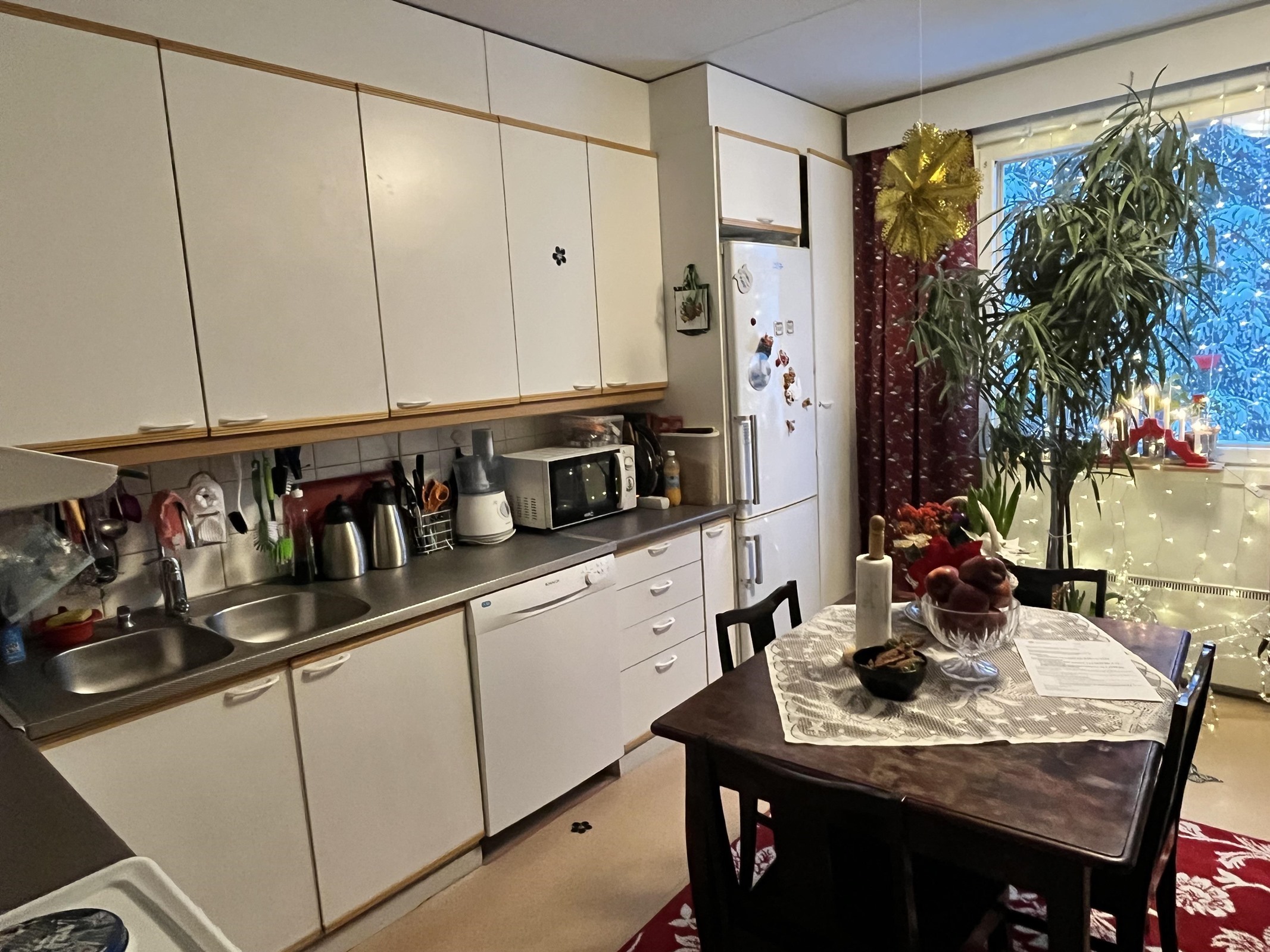 - Jääkaappipakastin, sähköliesi, liesituuletin, astianpesukone, kaapistot, kiinteät valaisimet.
