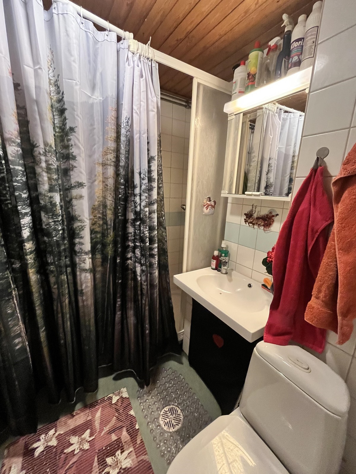 - Kylpyhuone, suihku, suihkukaappi, peilikaappi, kiinteät valaisimet. Pyyhepatteri