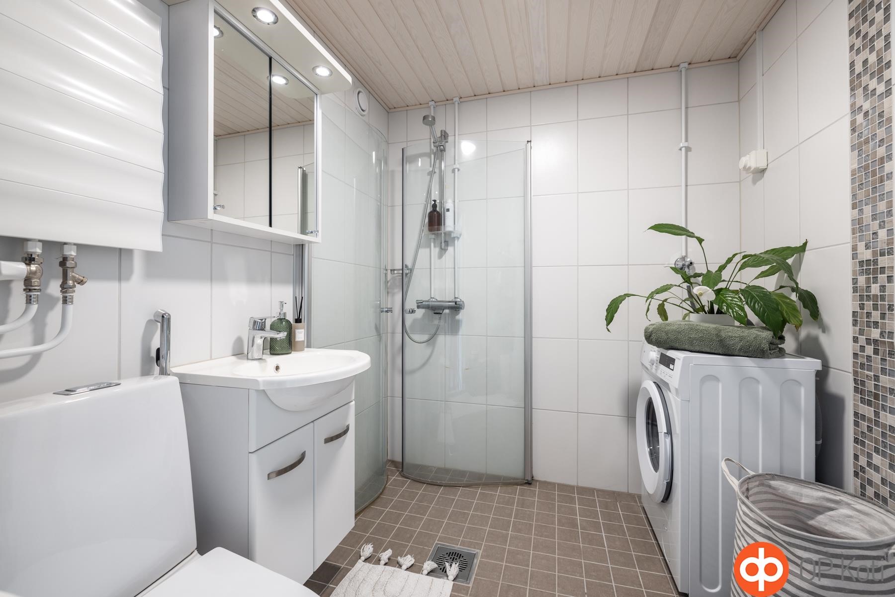 - Suihku, suihkuseinä, peilikaappi, allaskaappi, pesukoneliitäntä, kiinteät valaisimet.