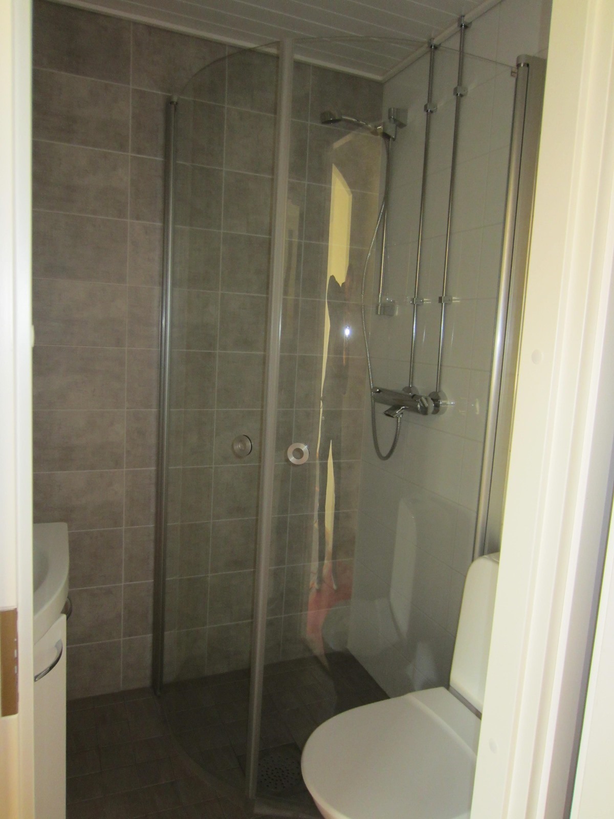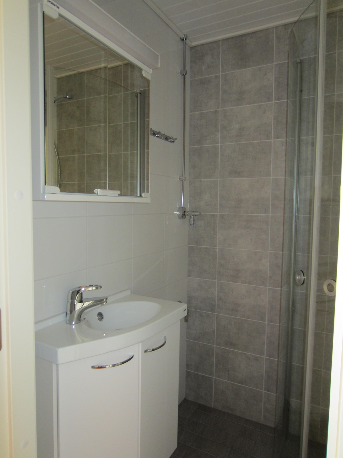 - Kylpyhuone, suihku, suihkuseinä, peilikaappi, allaskaappi, pesukoneliitäntä, kiinteät valaisimet.