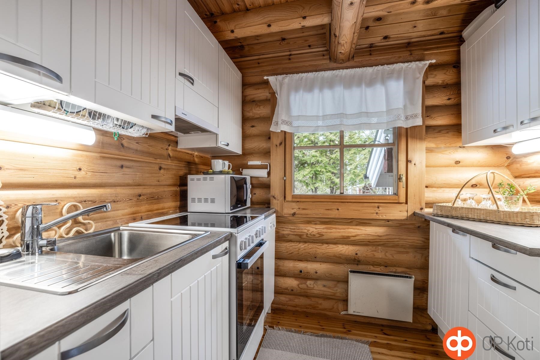 - Jääkaappi saunalla, jääkaappipakastin, induktioliesi, liesituuletin, mikroaaltouuni, astianpesukone, kiinteät valaisimet.