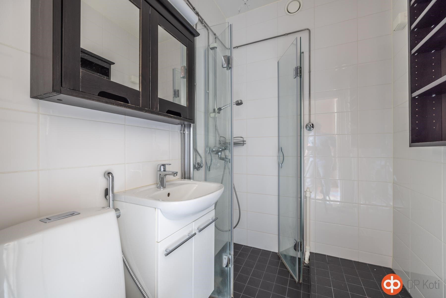 - Kylpyhuone, suihku, suihkuseinä kääntyvä, peilikaappi, allaskaappi, pesukoneliitäntä, lattialämmitys, kiinteät valaisimet. Pyyhepatteri