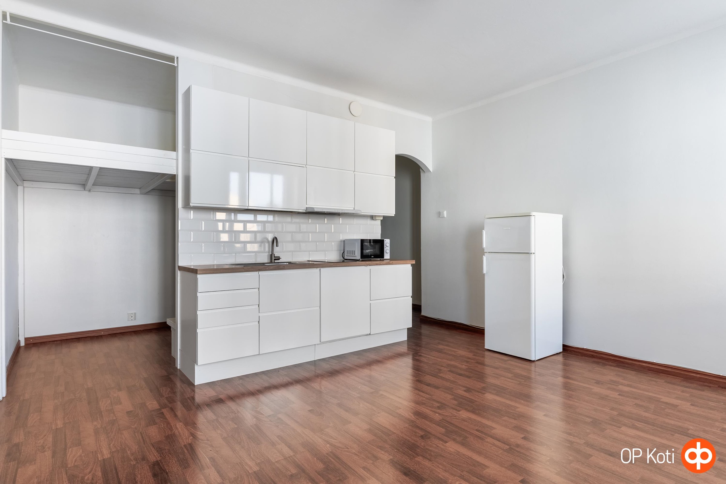 Korkea huonetila tuo avaruutta, ja asunnon fiksu pohjaratkaisu tekee arjesta sujuvaa. Huoneen ja alkovi-parviratkaisun ansiosta tilat on helppo jäsentää oleskeluun, työskentelyyn ja lepoon.