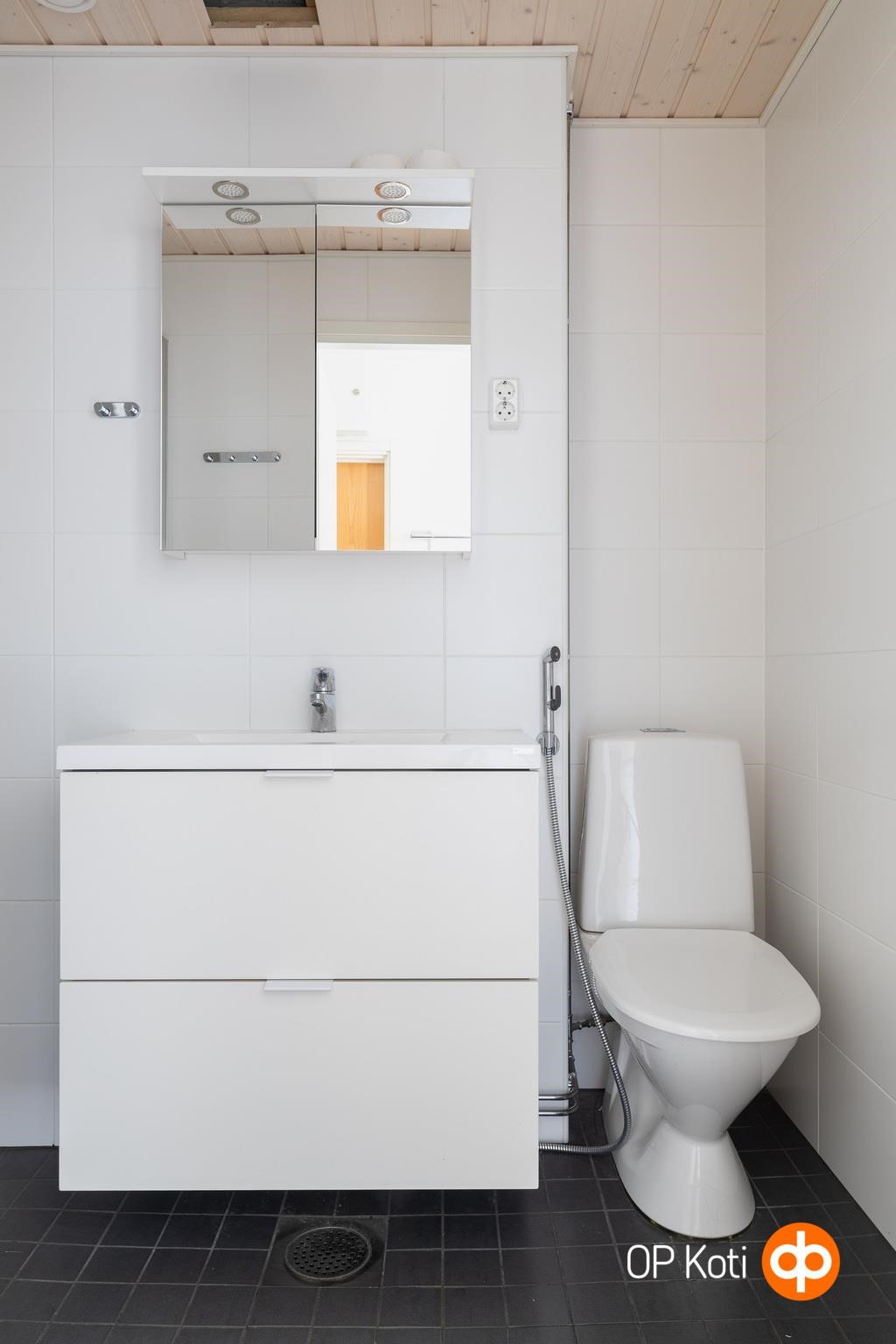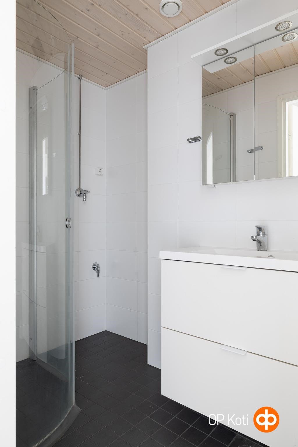 - Kylpyhuone, suihku, suihkuseinä (kääntyvät ovet), kaapit, pesukoneliitäntä. Kph uusittu taloyhtiön linjasaneerauksen yhteydessä 2019.