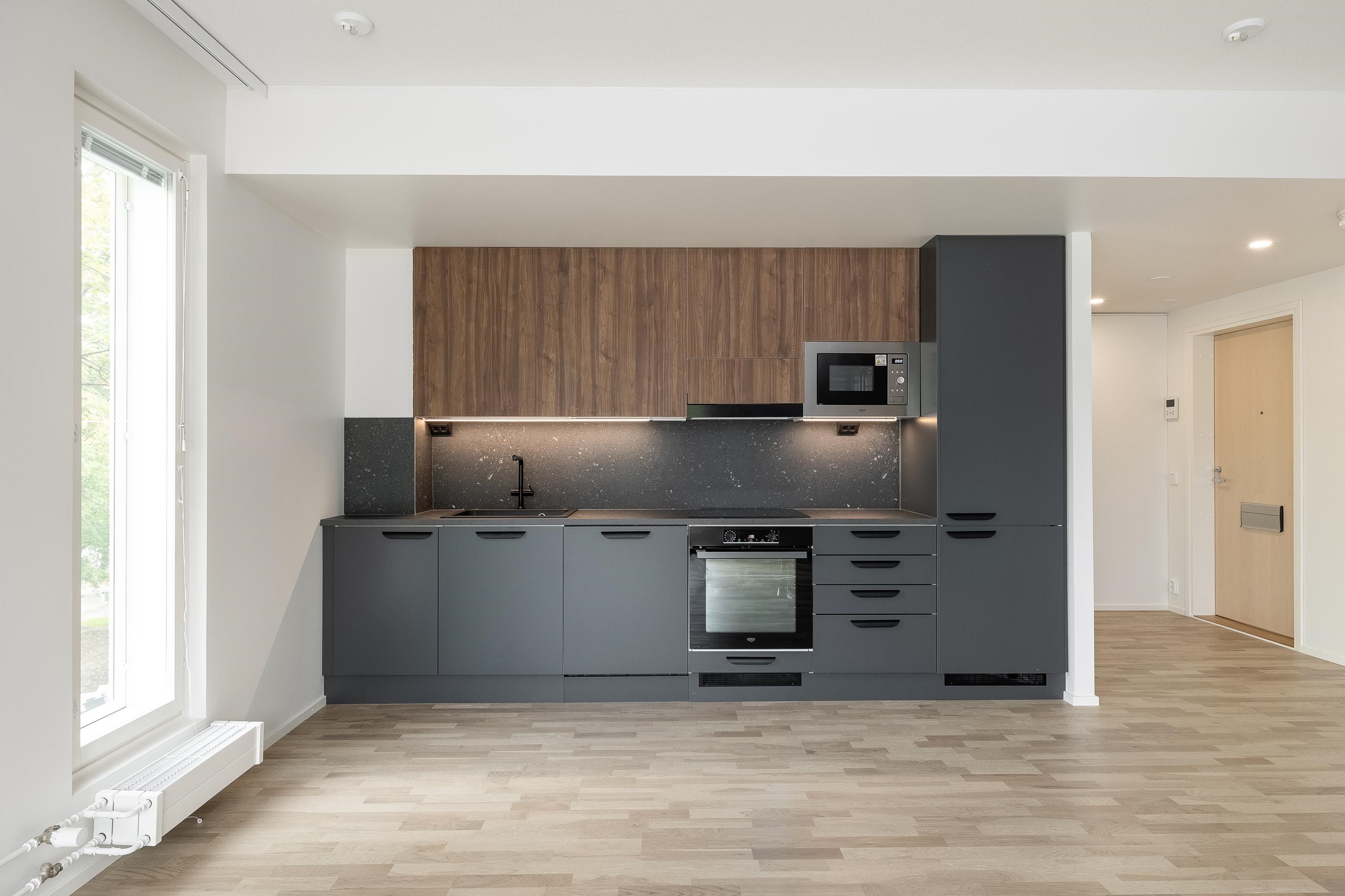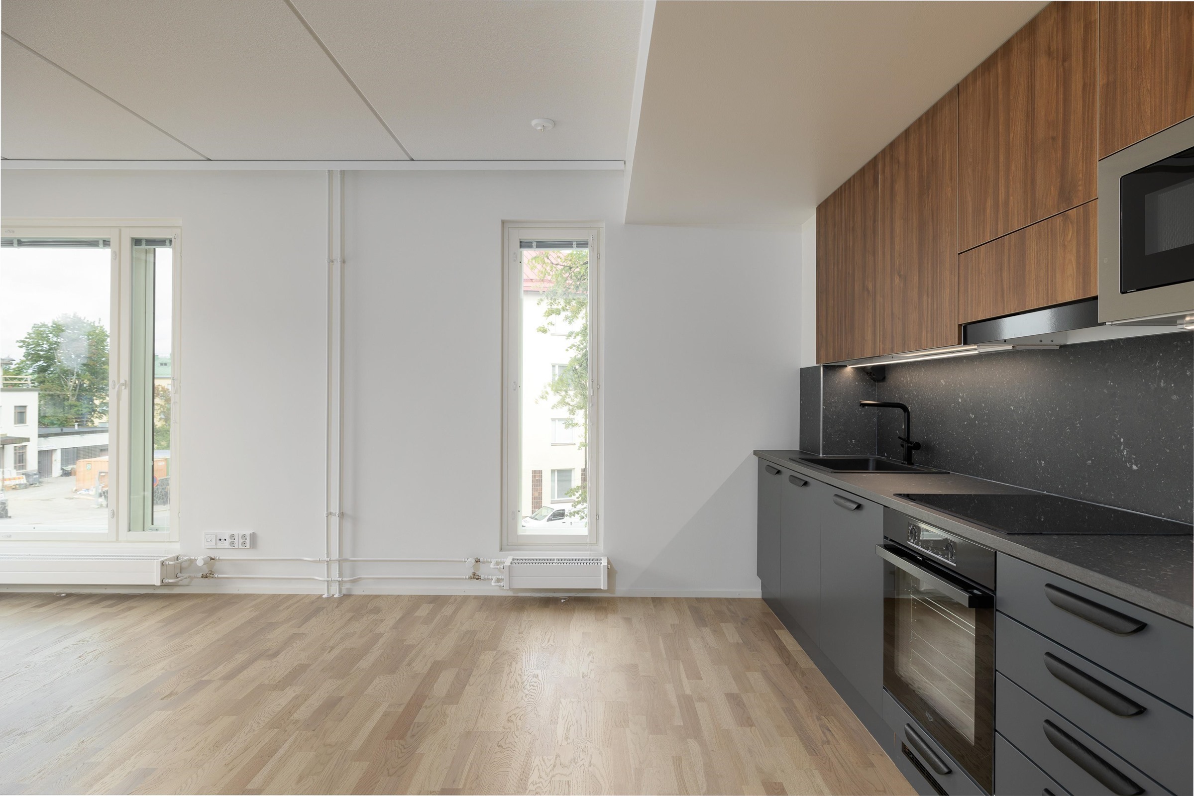 - Keittiöissä on kalusteuuni ja keraaminen induktiokeittotaso. Keittotason päällä on liesikupu, jossa on huoneiston LTO-koneen ohjaus. Keittiöissä on 60 cm leveä astianpesukone. Kylmäkalusteet: Jää-pakastinkaappi tai jääkaappipakastin yhdistelmä. Tilavaraus kalusteisiin sijoitettavalle mikroaaltouunille.
