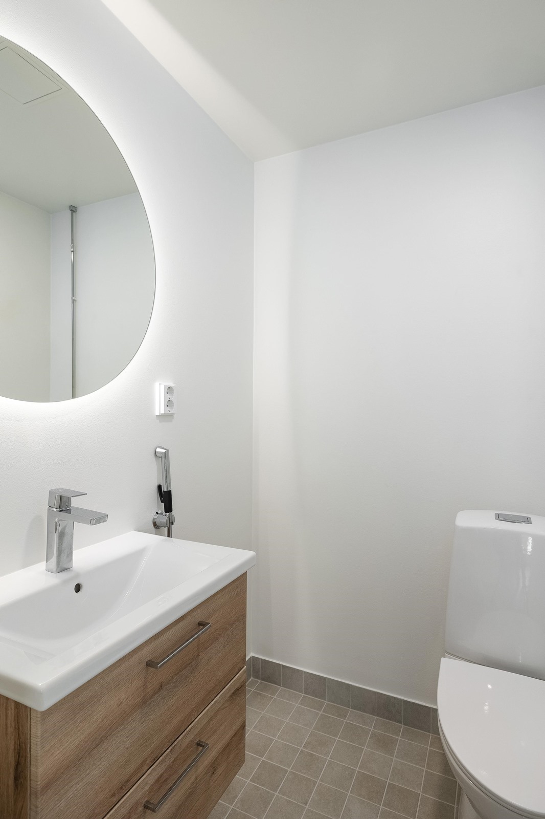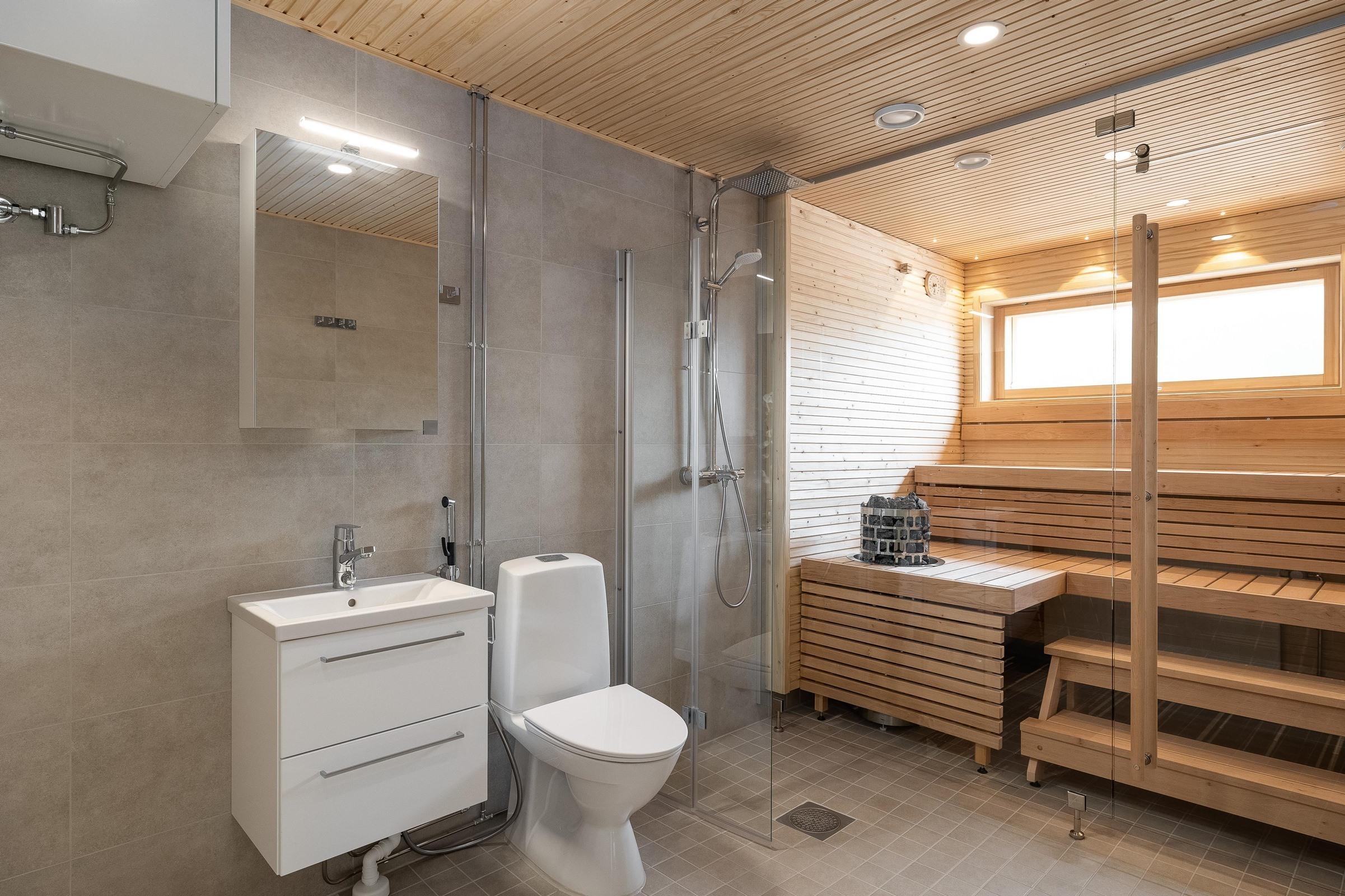 - Kylpyhuone Kylpyhuoneissa on suunnitelmien mukaisesti peilikaappi, allas, allaskaappi. Kylpyhuoneissa on suihkuseinä. Kylpyhuoneissa on pyykinpesukoneliitäntä tai pesuallashana pesukoneliitännällä ja varaus kuivausrummulle. Kylpyhuoneissa on mukavuuslattialämmitys sähköllä. Asuntosaunat: Laudetasot ovat tervaleppää, tukirakenteena höylätty havupuu. Seinät ja katto kuusipaneelia. Vesijohtokalusteet Sekoittajat ovat yksiotesekoittajia, suihkuissa on termostaattihanat.