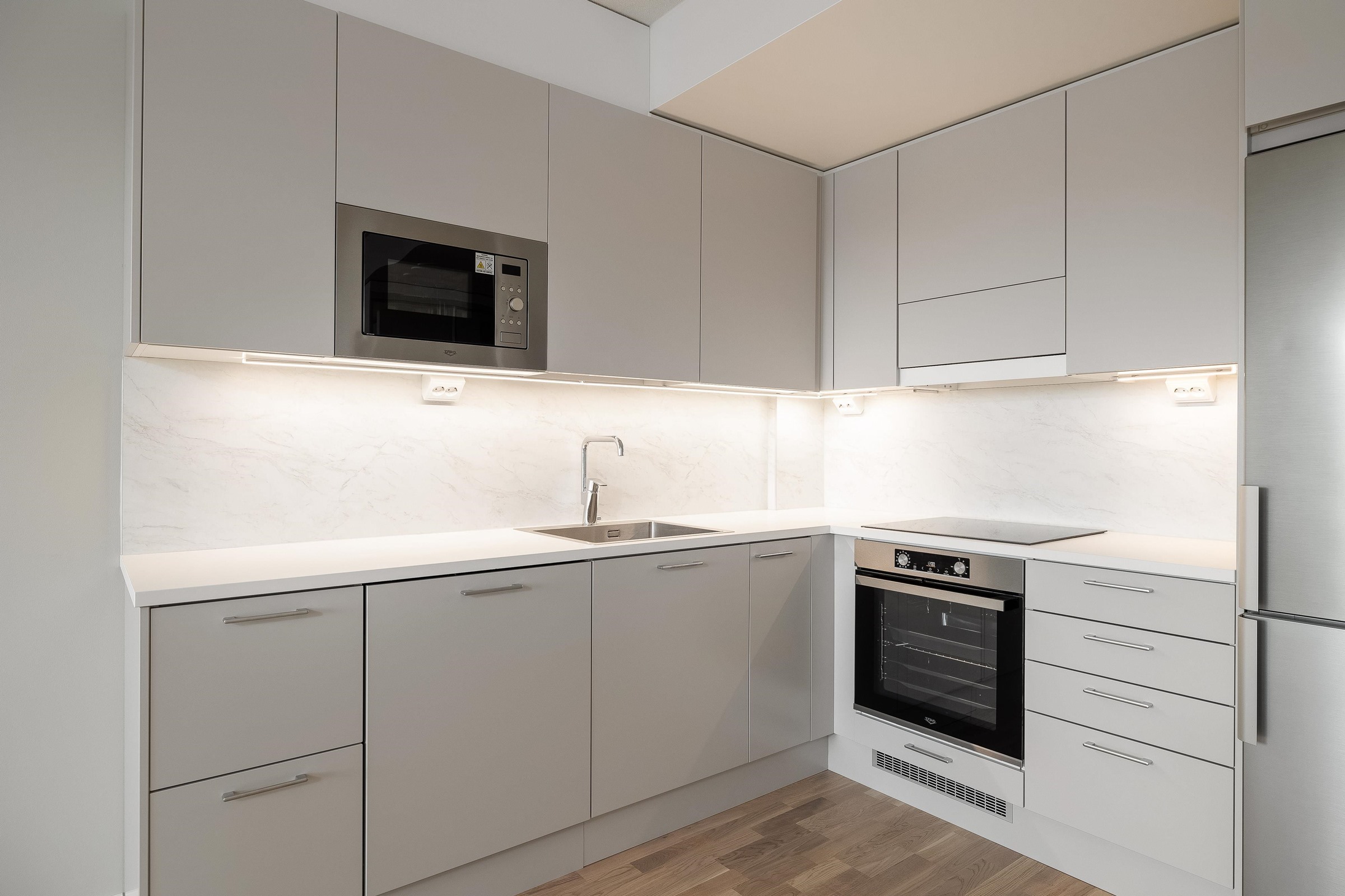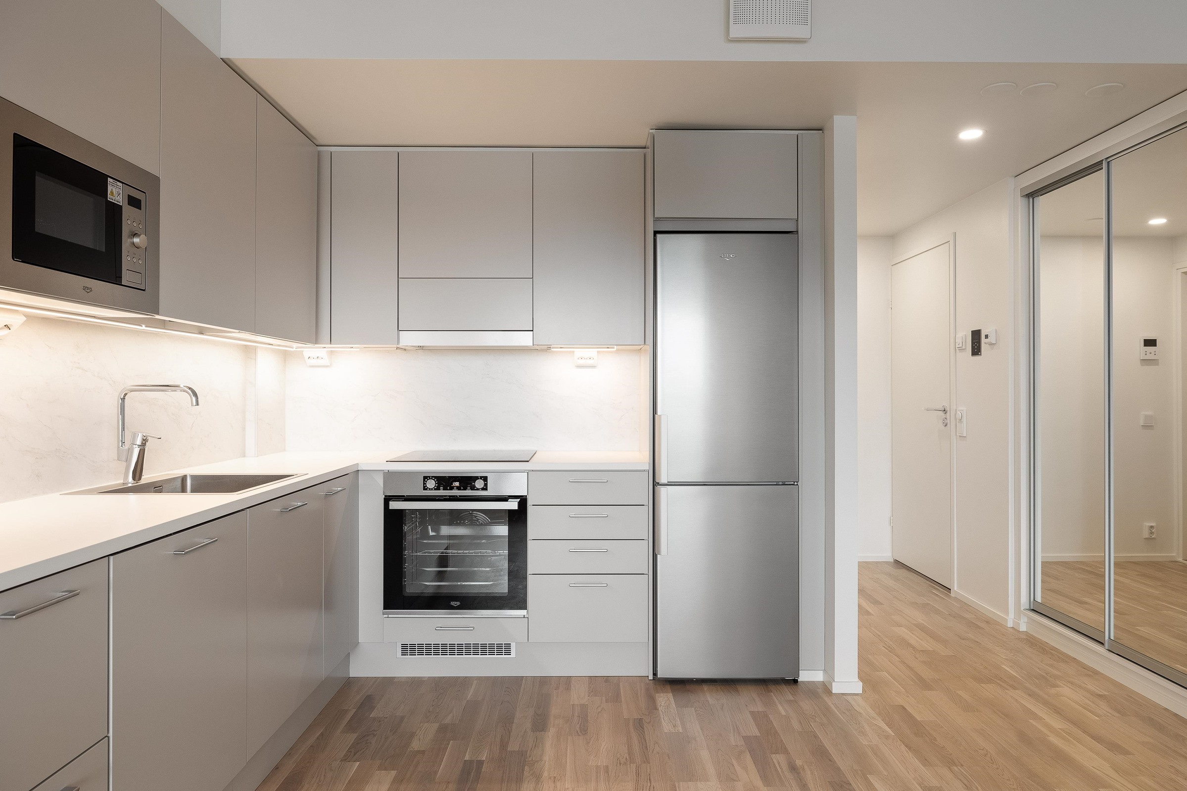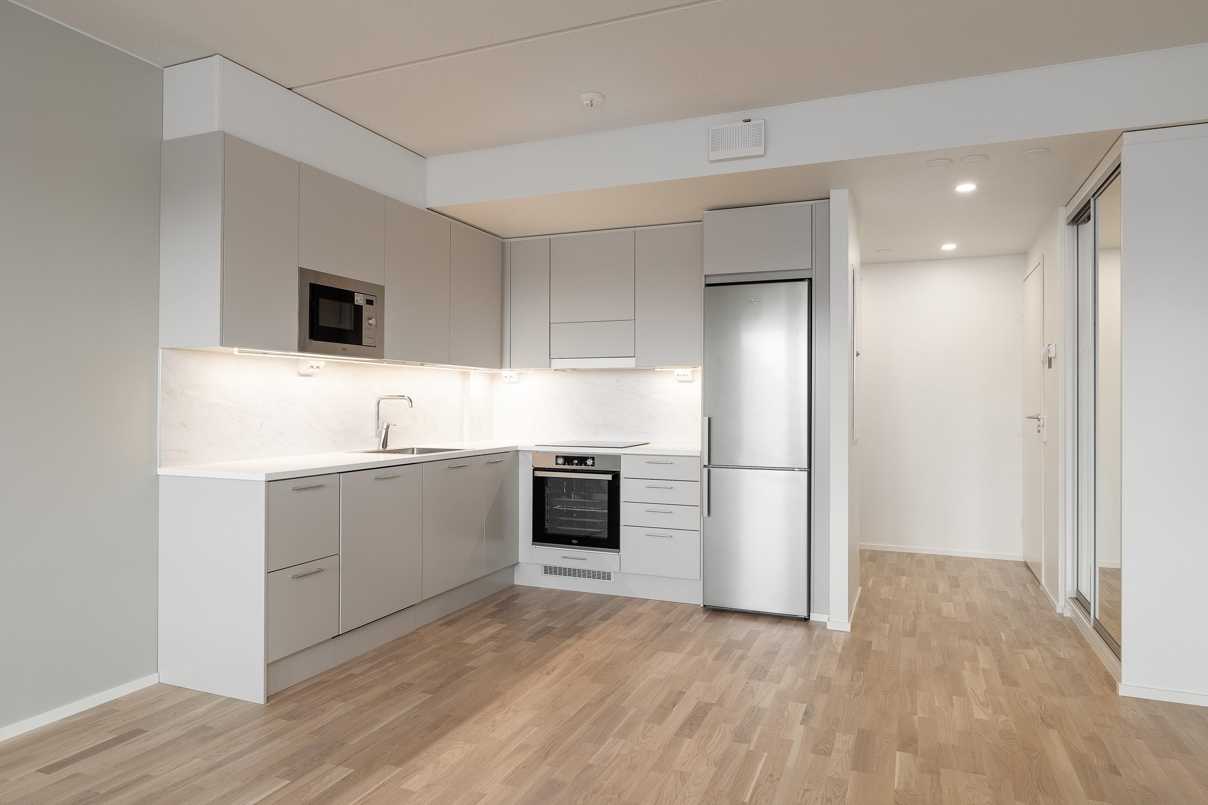 - Keittiöissä on kalusteuuni ja keraaminen induktiokeittotaso. Keittotason päällä on liesikupu, jossa on huoneiston LTO-koneen ohjaus. Keittiöissä on 60 cm leveä astianpesukone. Kylmäkalusteet: Jää-pakastinkaappi tai jääkaappipakastin yhdistelmä. Tilavaraus kalusteisiin sijoitettavalle mikroaaltouunille.