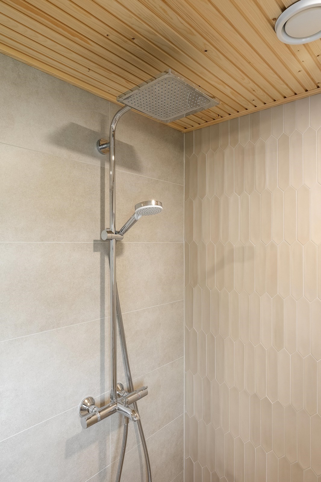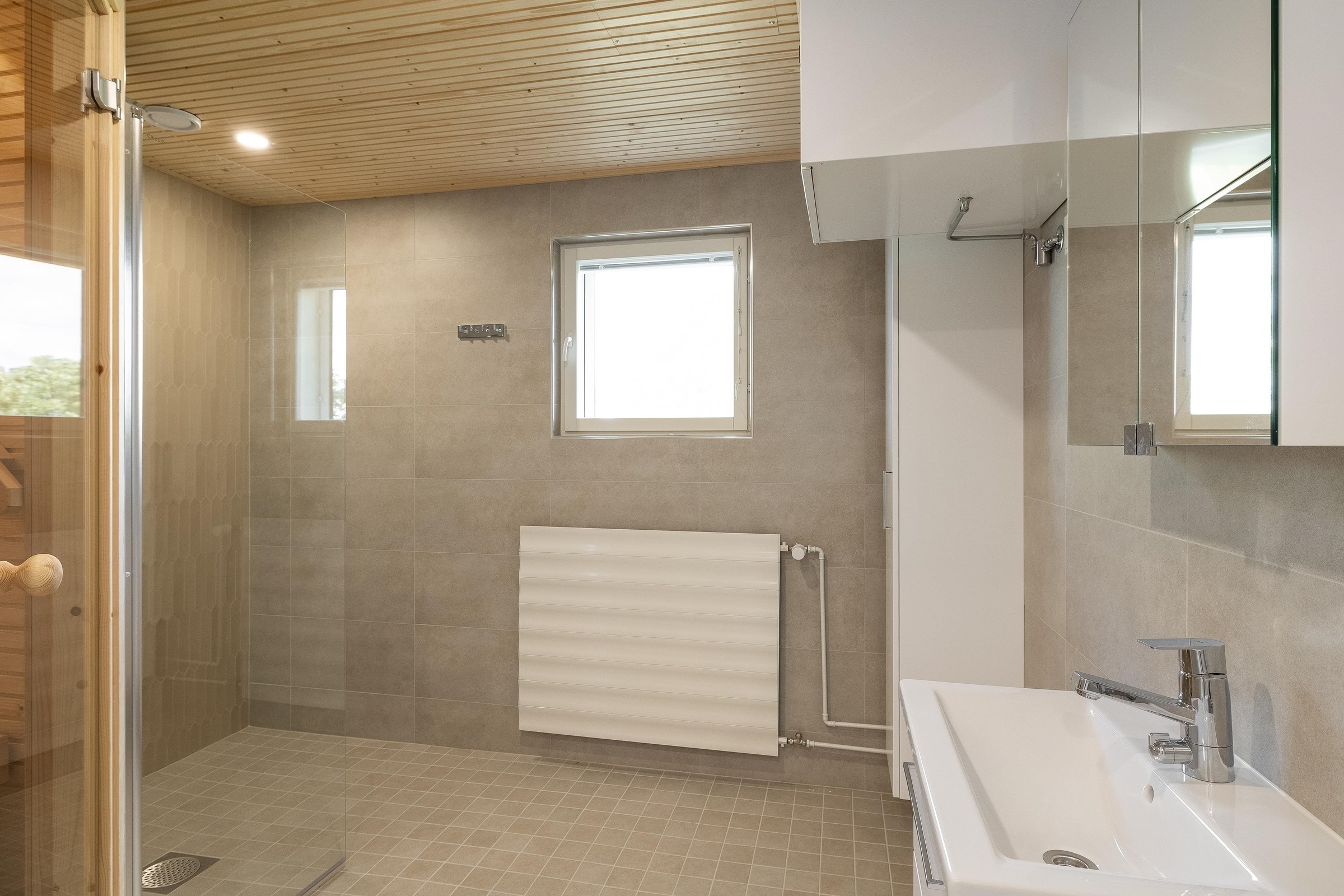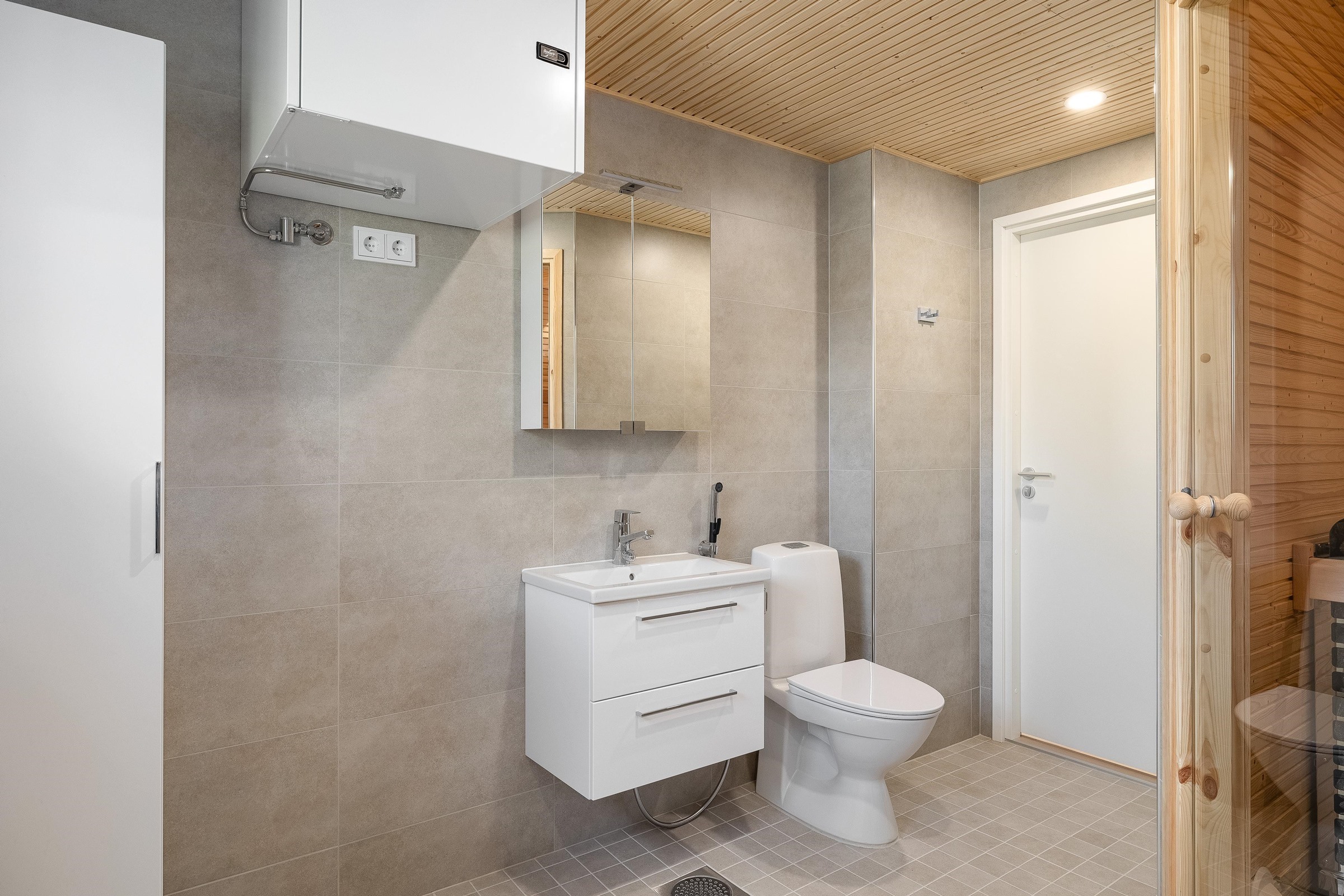 - Kylpyhuone Kylpyhuoneissa on suunnitelmien mukaisesti peilikaappi, allas, allaskaappi. Kylpyhuoneissa on suihkuseinä. Kylpyhuoneissa on pyykinpesukoneliitäntä tai pesuallashana pesukoneliitännällä ja varaus kuivausrummulle. Kylpyhuoneissa on mukavuuslattialämmitys sähköllä. Asuntosaunat: Laudetasot ovat tervaleppää, tukirakenteena höylätty havupuu. Seinät ja katto kuusipaneelia. Vesijohtokalusteet Sekoittajat ovat yksiotesekoittajia, suihkuissa on termostaattihanat.