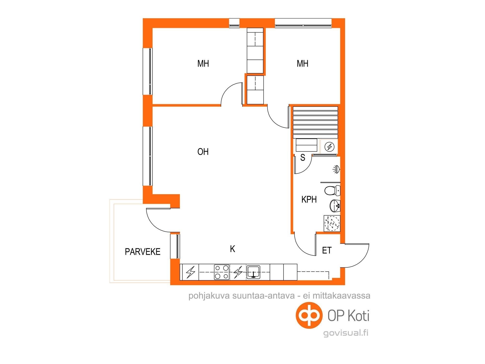 - Olohuone, parveke ja makuuhuone itään, toinen makuuhuone etelään