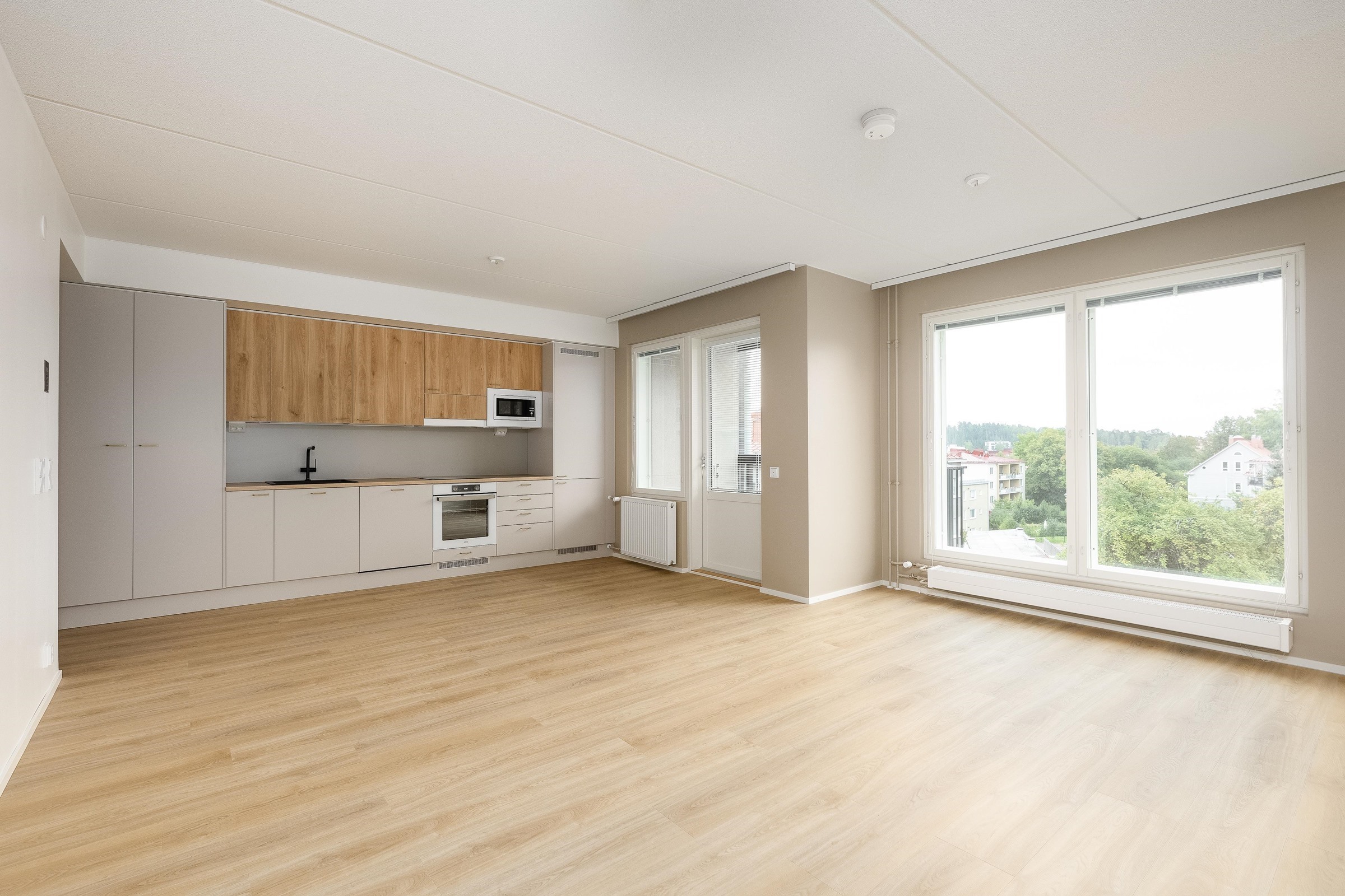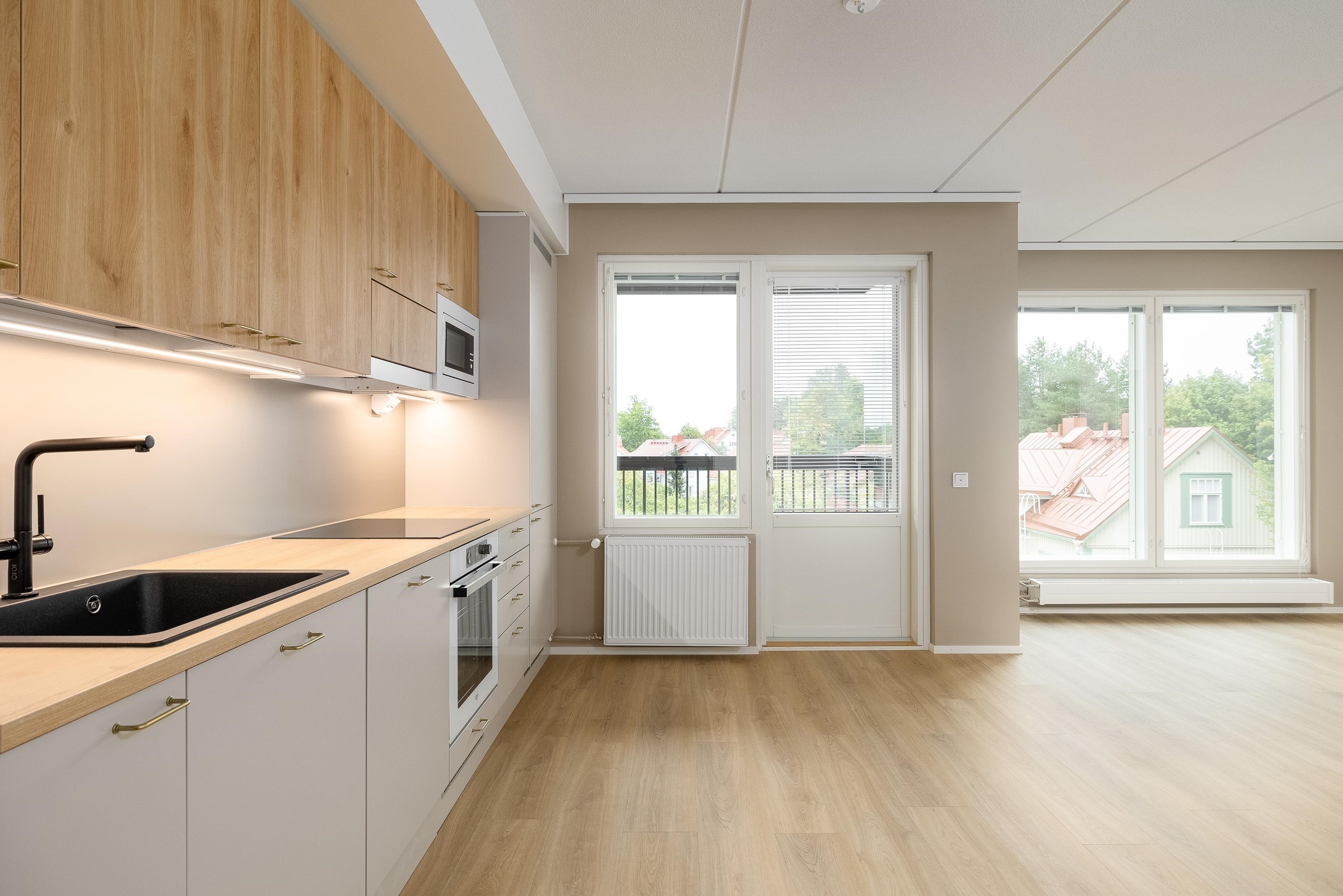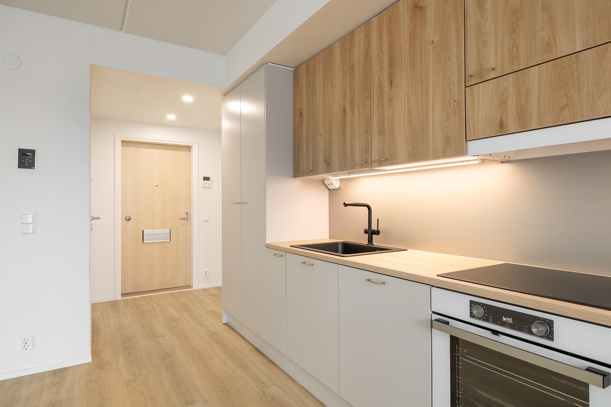 - Keittiöissä on kalusteuuni ja keraaminen induktiokeittotaso. Keittotason päällä on liesikupu, jossa on huoneiston LTO-koneen ohjaus. Keittiöissä on 60 cm leveä astianpesukone. Kylmäkalusteet: Jää-pakastinkaappi tai jääkaappipakastin yhdistelmä. Tilavaraus kalusteisiin sijoitettavalle mikroaaltouunille.
