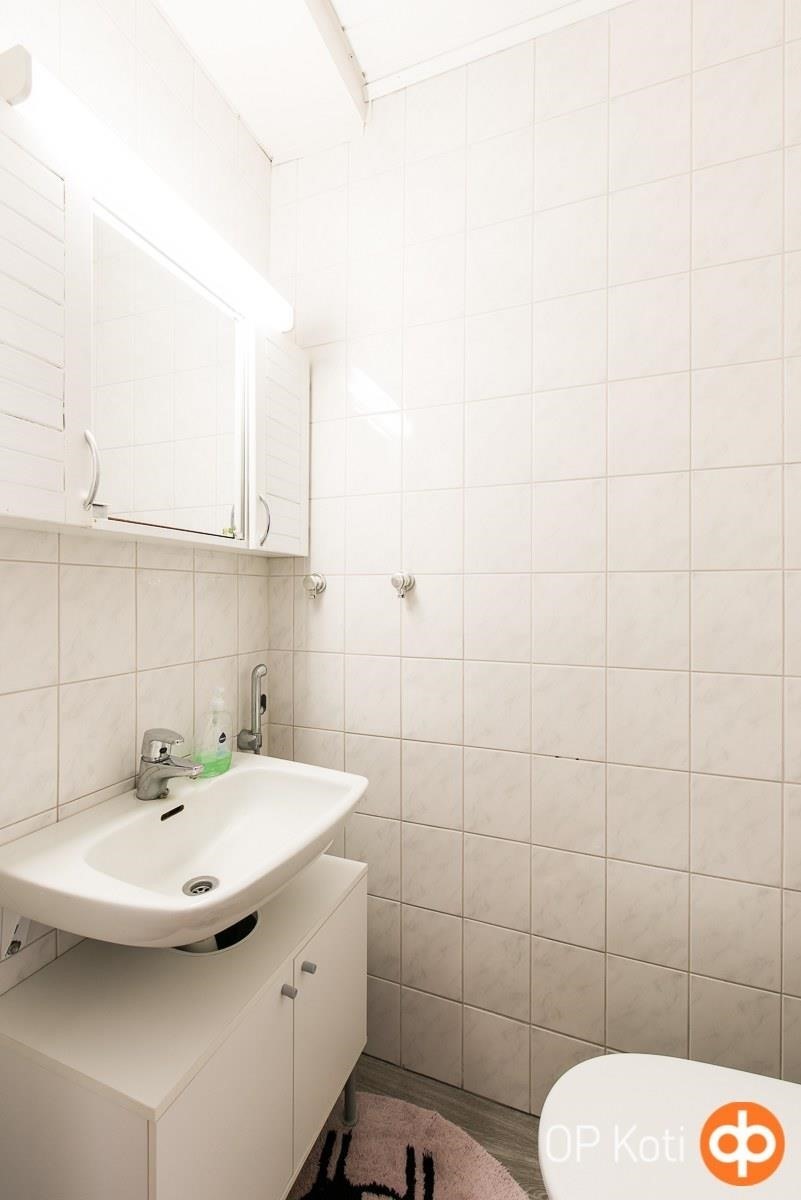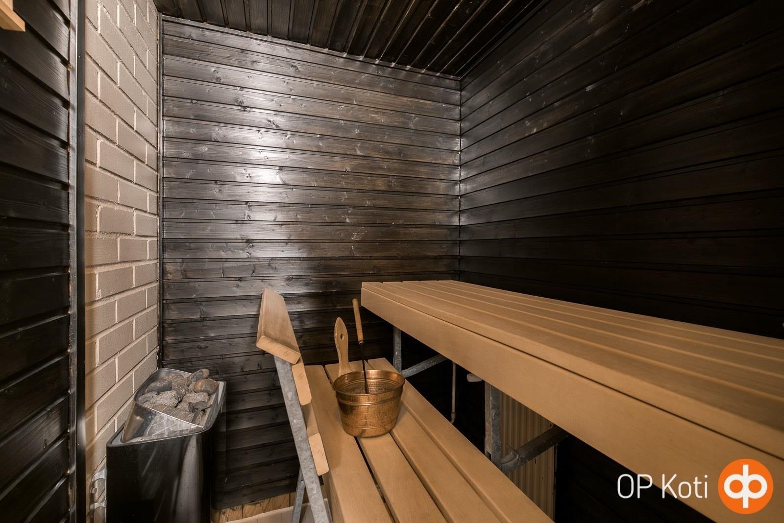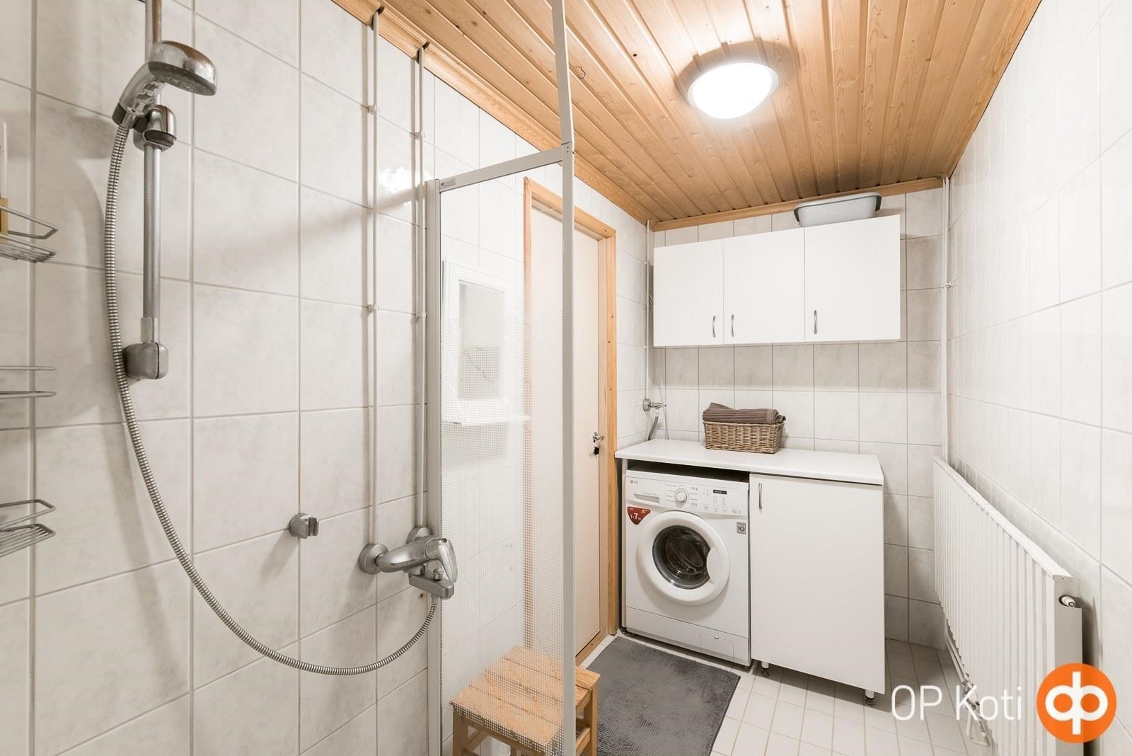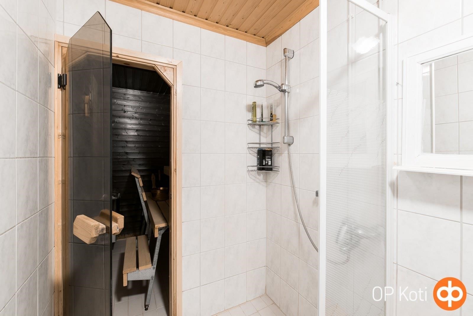 - Sauna, sähkökiuas, kylpyhuone, erillinen wc, suihku, suihkuseinä, peilikaappi, pesukoneliitäntä.