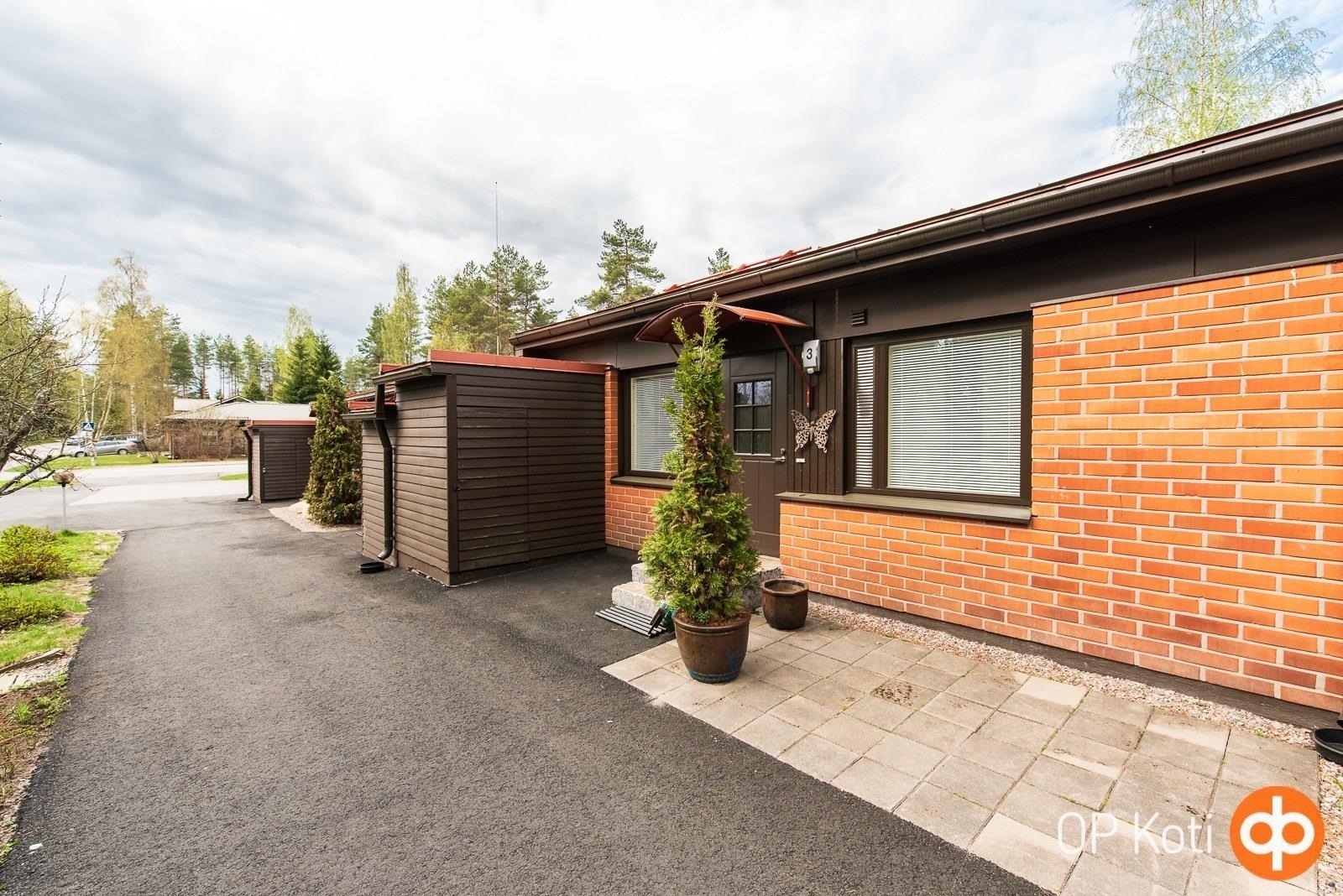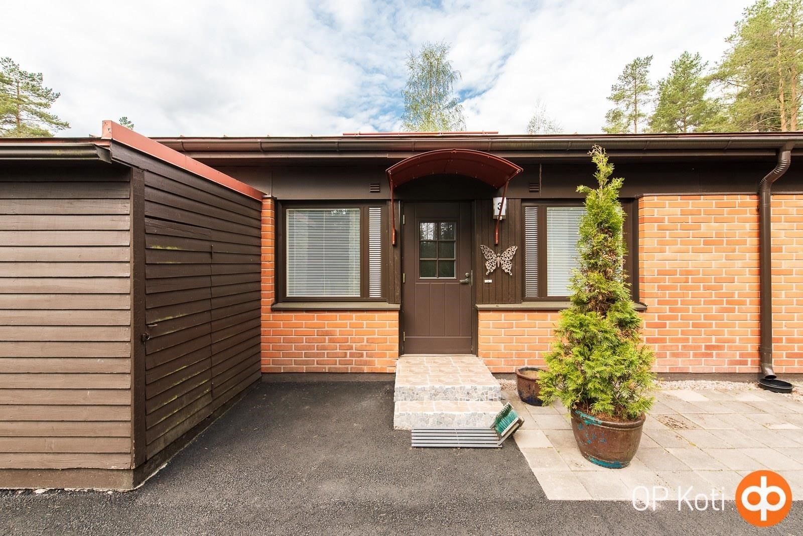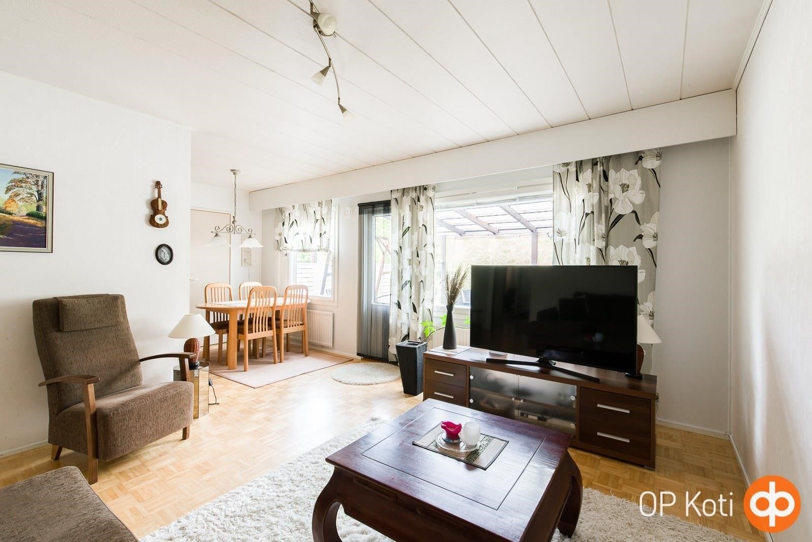 Tässä kodissa on mukavasti tilaa yhdessä tasossa, reilunkokoiset makuuhuoneet, joihin mahtuu muutakin kuin sänky. Olohuoneessa parkettilattia. Saunan pinnat trendikkään tummat. Takapihalla katettu terassi. Autolle paikka autokatoksessa.