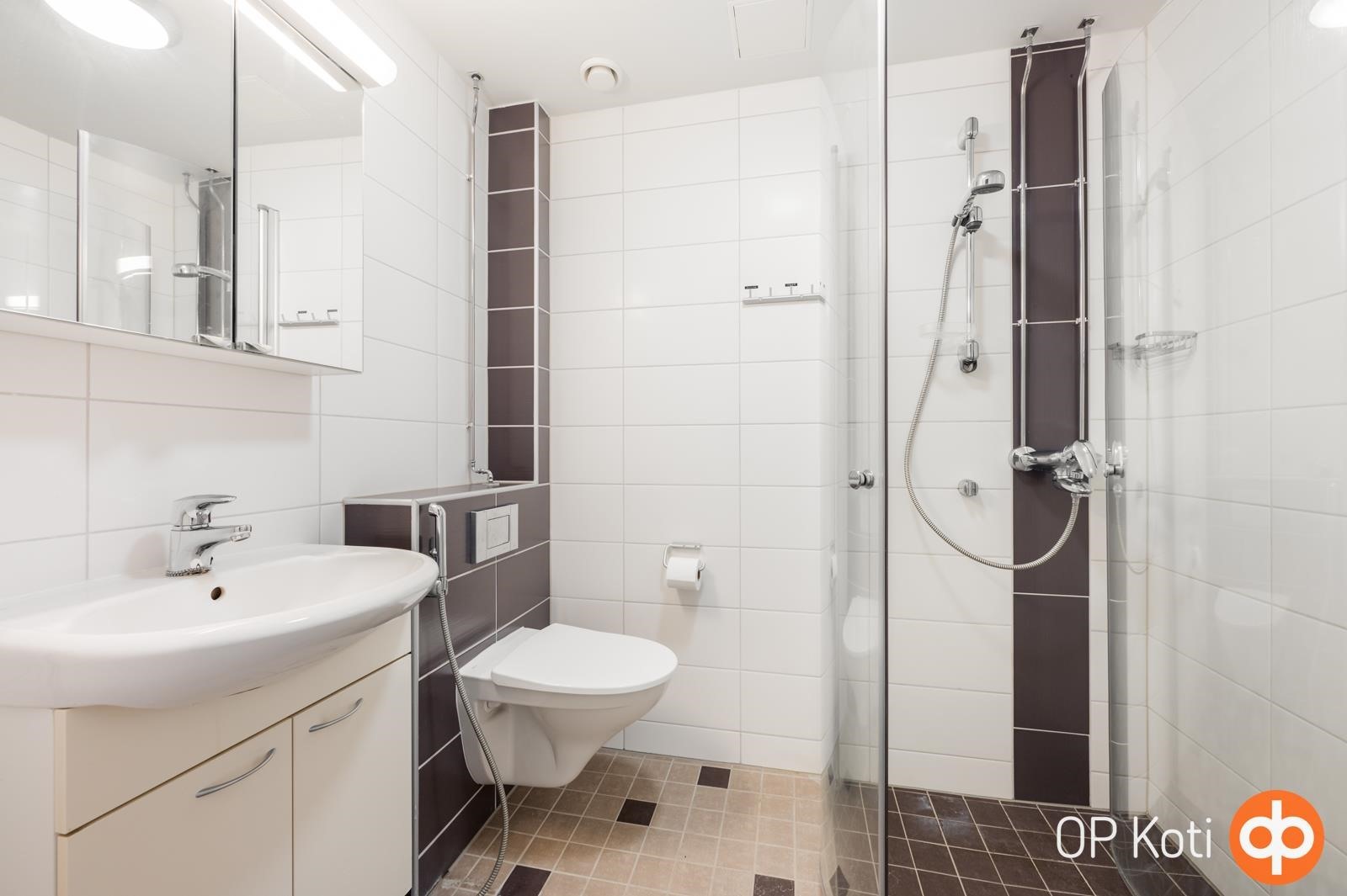 - Kylpyhuone, suihku, suihkukaappi, peilikaappi, allaskaappi, pesukoneliitäntä, kiinteät valaisimet.