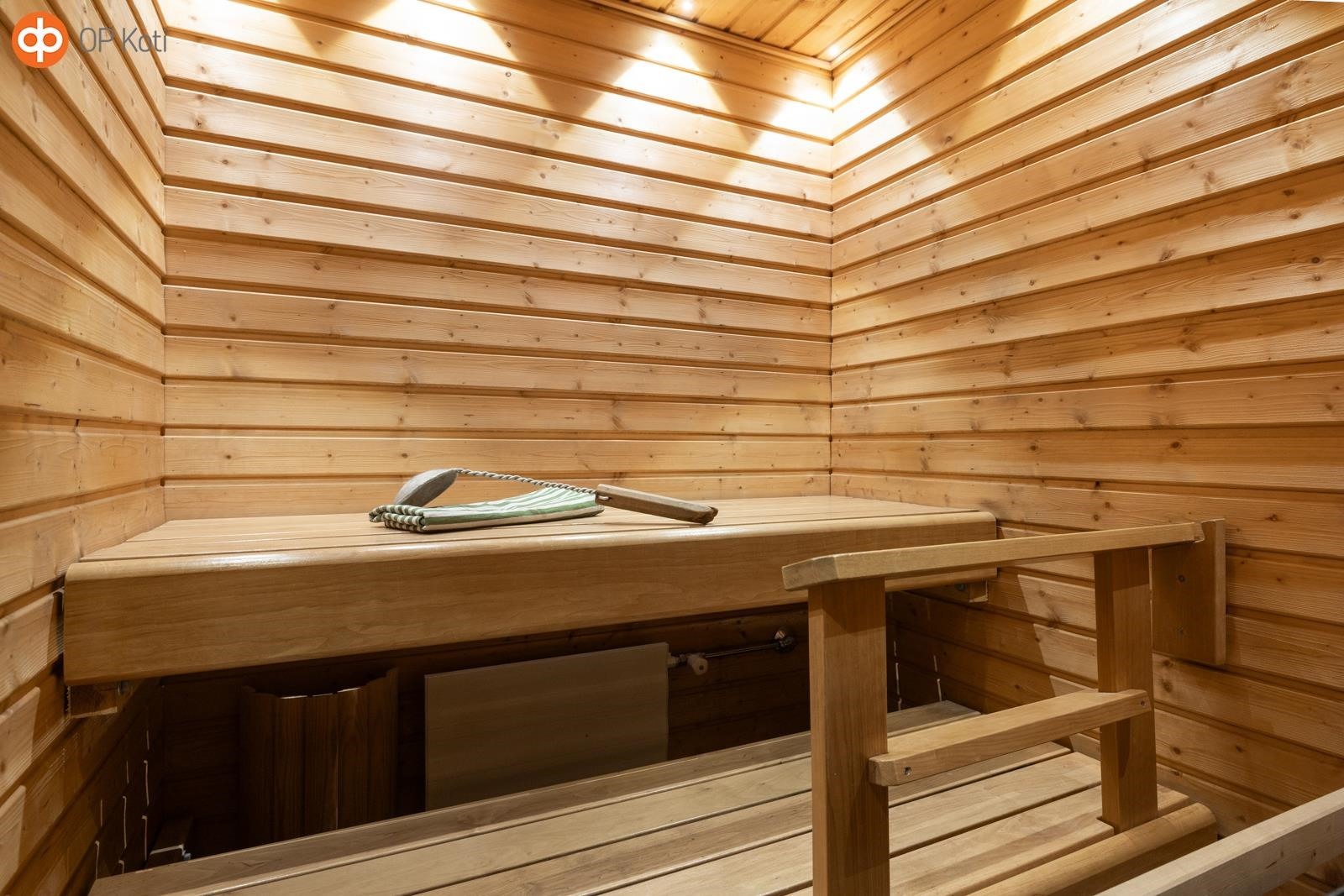 - Sauna, sähkökiuas, kylpyhuone, erillinen wc, suihkuseinä, peilit, peilikaappi, pesukoneliitäntä, lattialämmitys, kiinteät valaisimet.