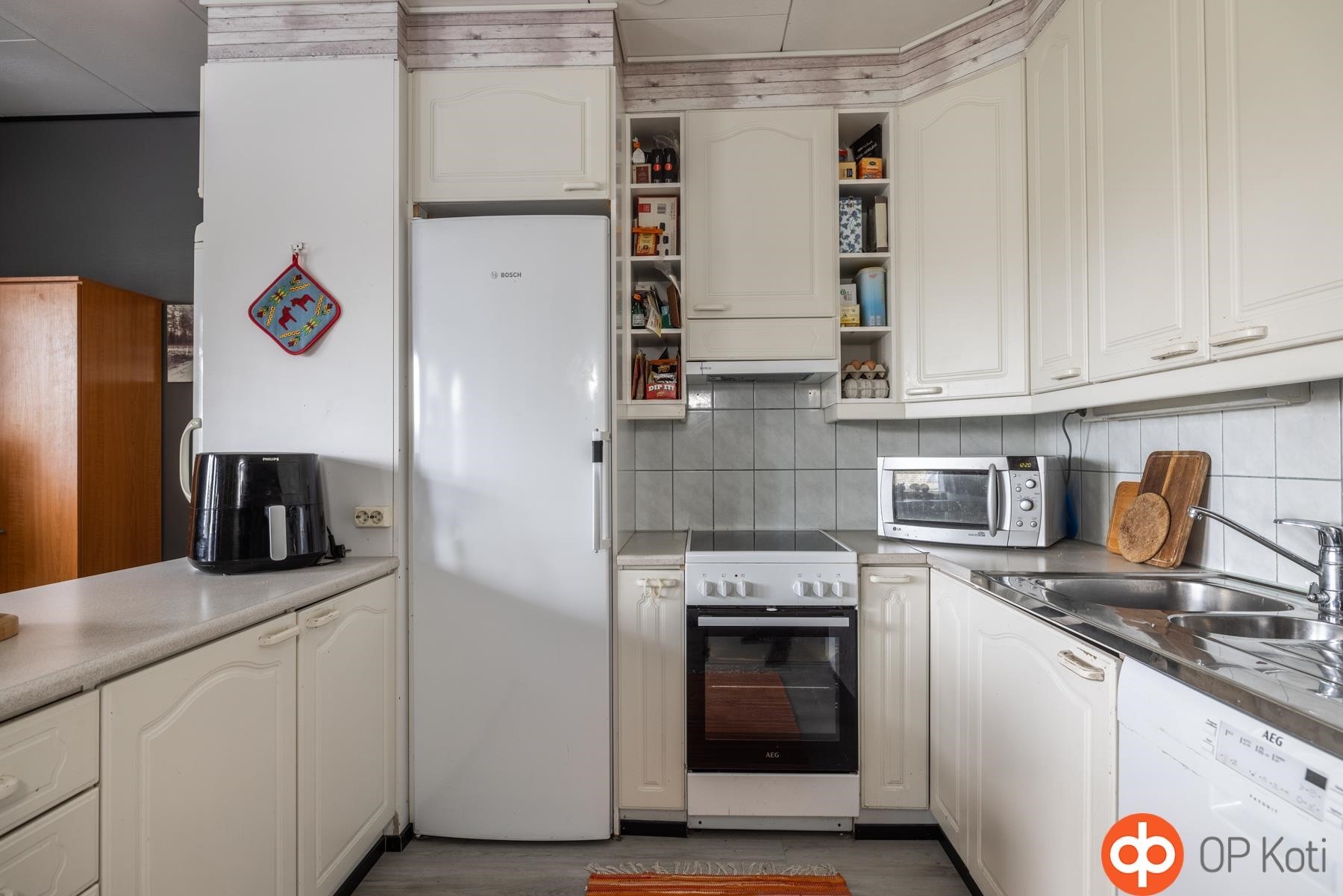 - Jääkaappi, pakastekaappi, induktioliesi ostettu 01/2022, liesituuletin, astianpesukone ostettu 01/2022, kiinteät valaisimet.