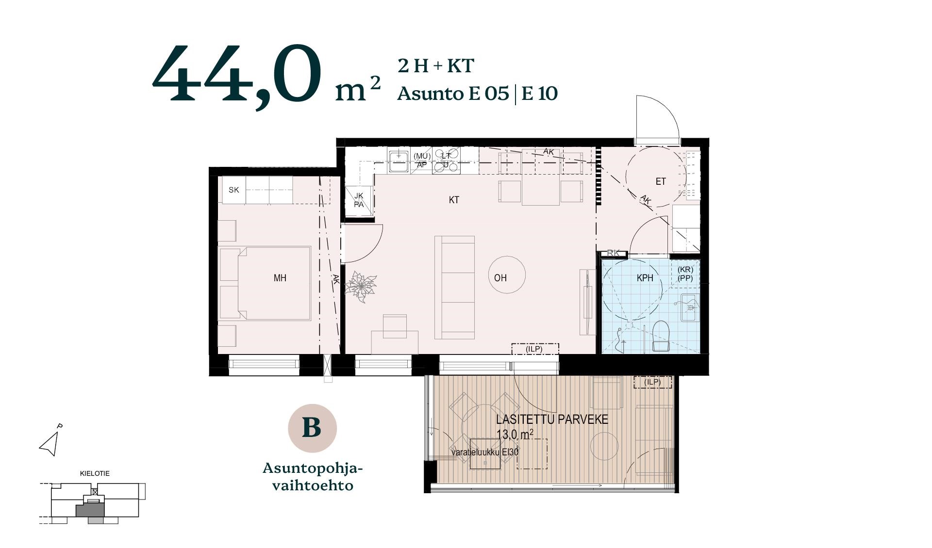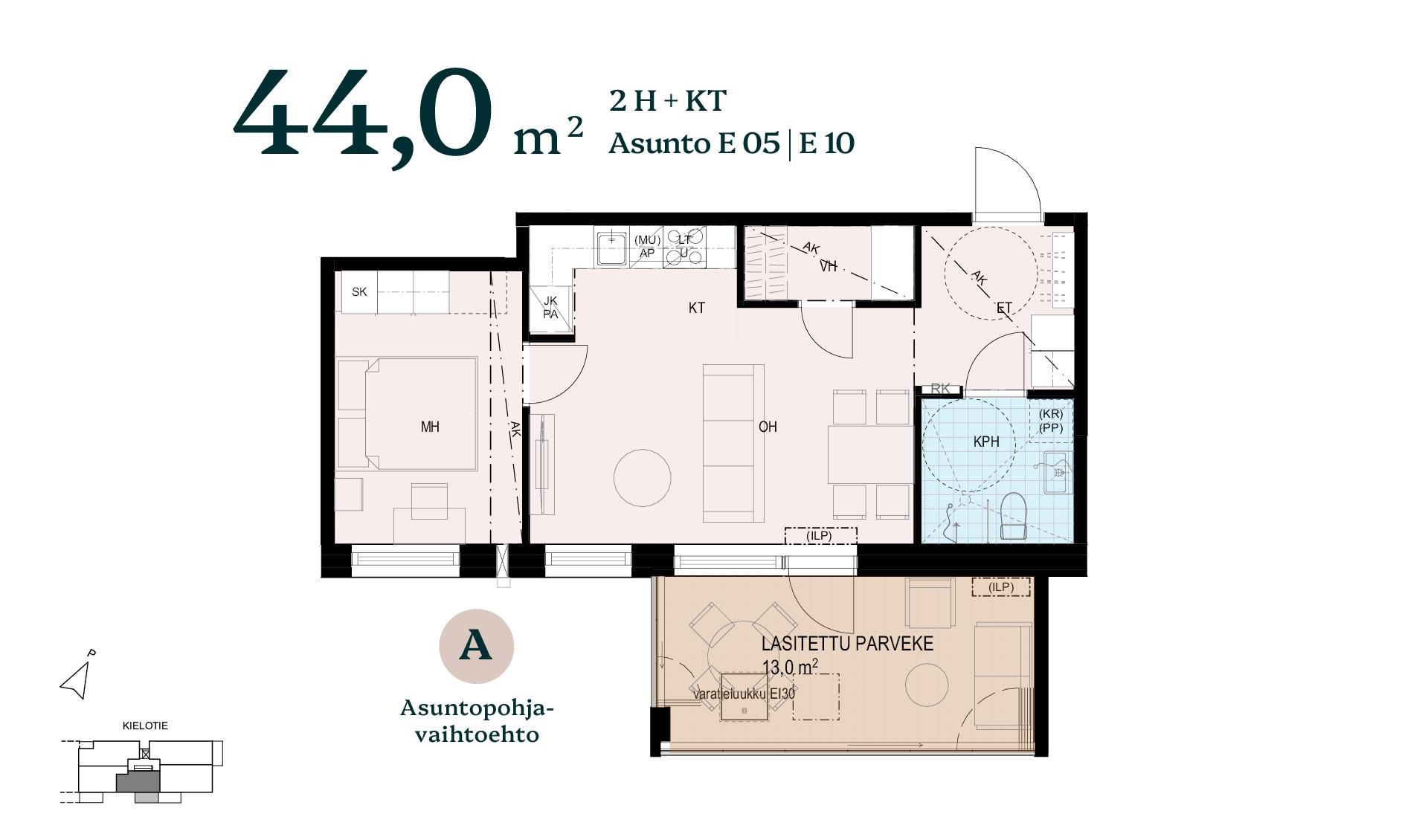 Muokkaa tämän 44m2:n kodin tilat arkeesi sopivaksi. Vaihtoehdossa A asunnossa on erillinen vaatehuone, ja työpiste on sijoitettu rauhallisesti makuuhuoneen yhteyteen. Vaihtoehdossa B eteinen on rajattu tyylikkäällä rimaseinällä, ja olohuoneeseen muodostuu luonteva sekä valoisa paikka työpisteelle.