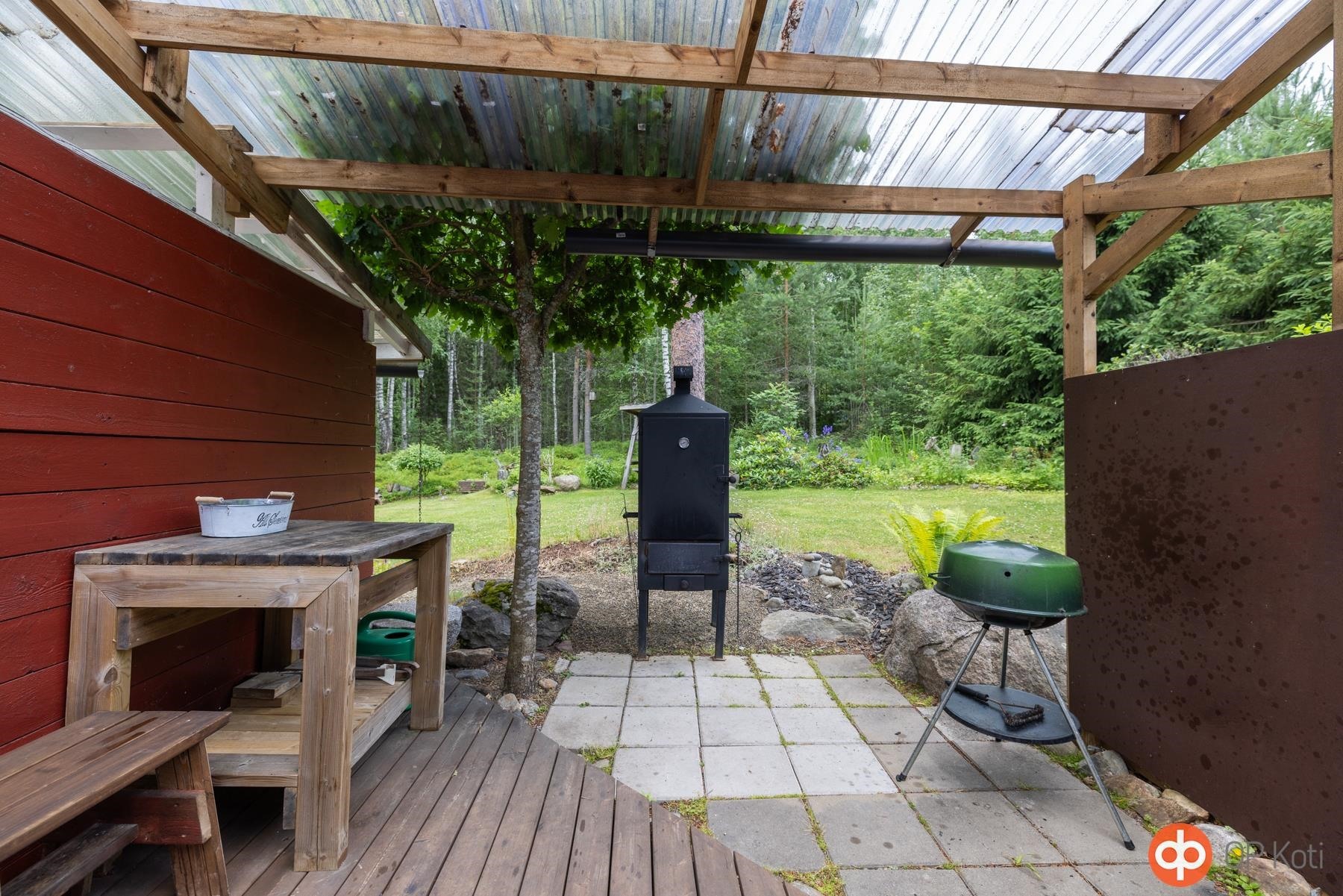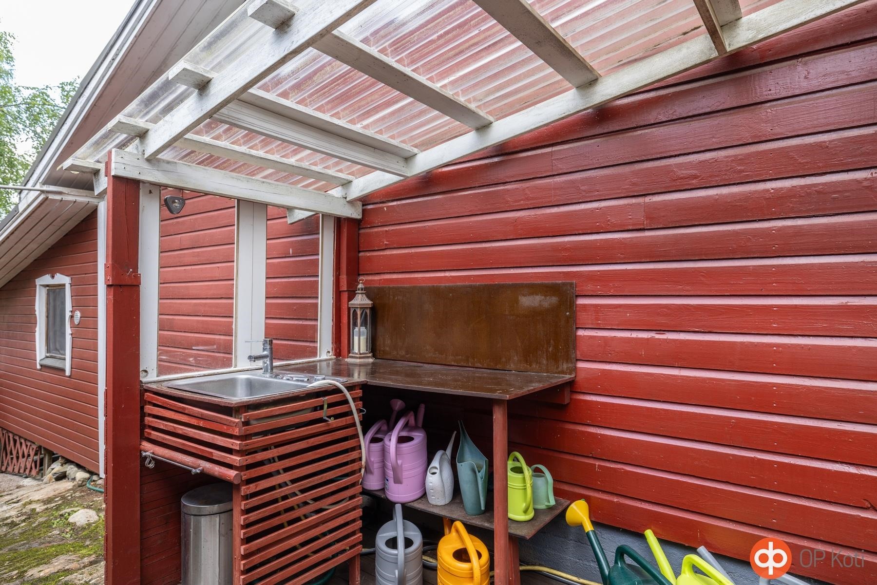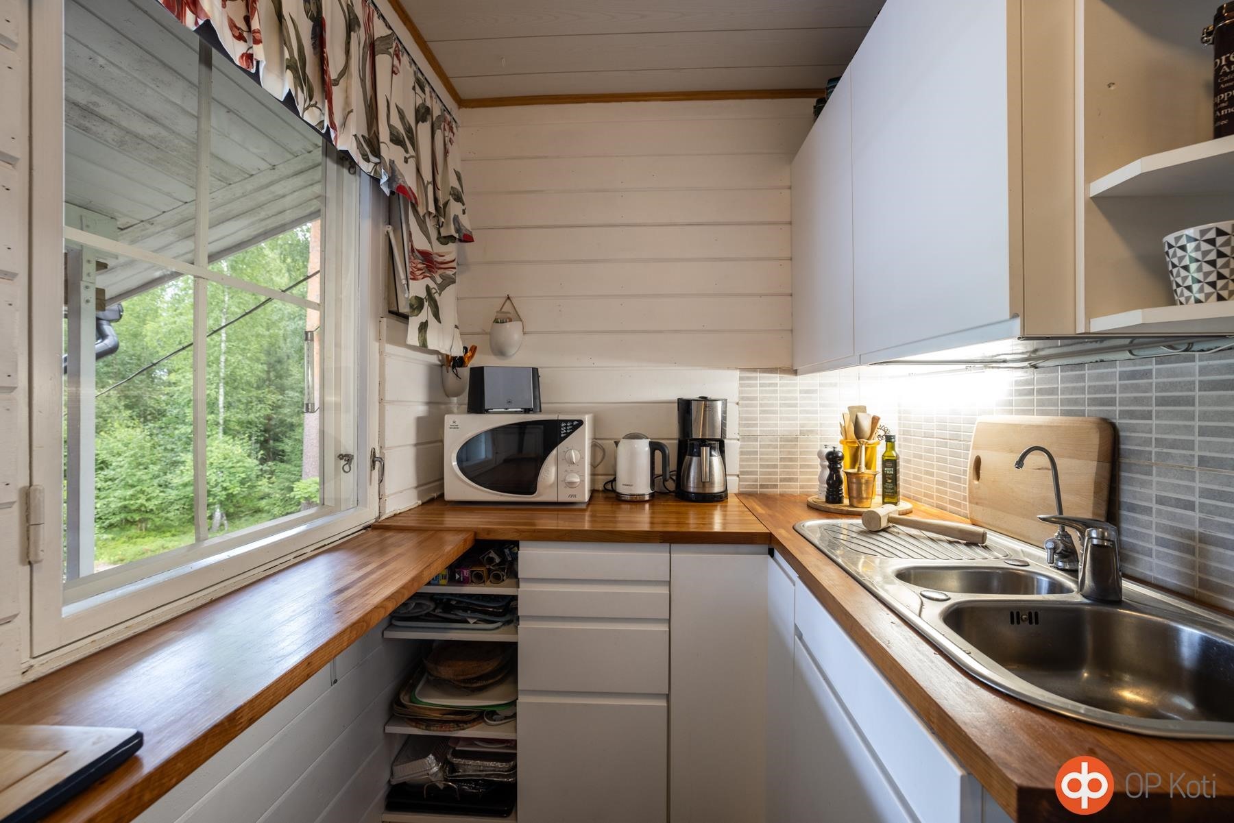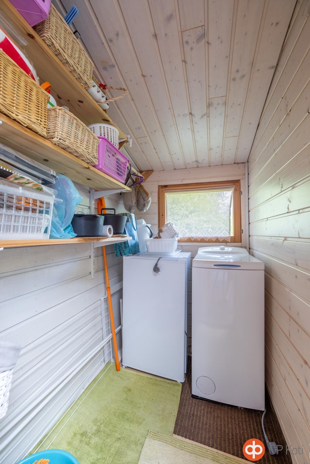 - Jääkaappipakastin, sähköliesi seinäventtiili lieden päällä, mikroaaltouuni. Keittiön kaapistot v.2020. Kaikki valaisimet. Ulkona apukeittiö/varasto, jossa jääkaappi ja pesukoneliitäntä.