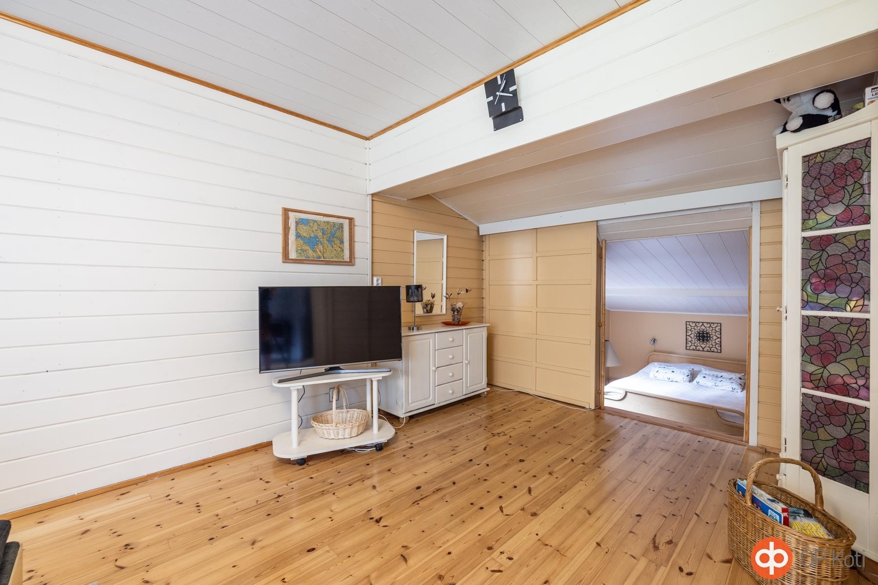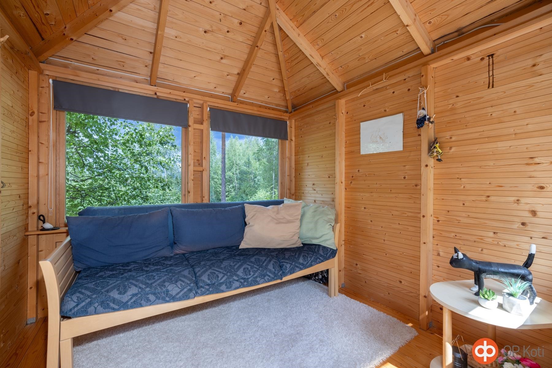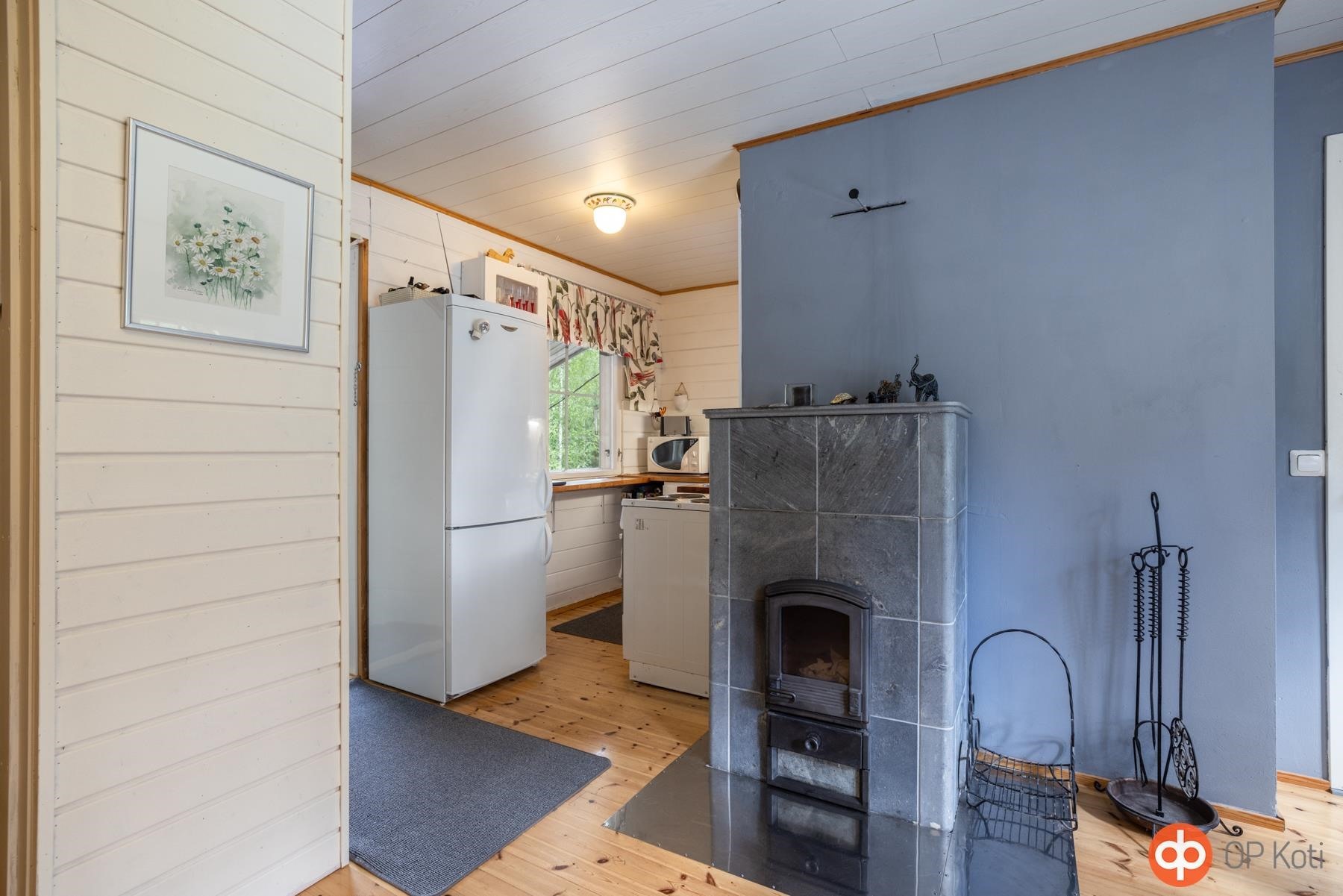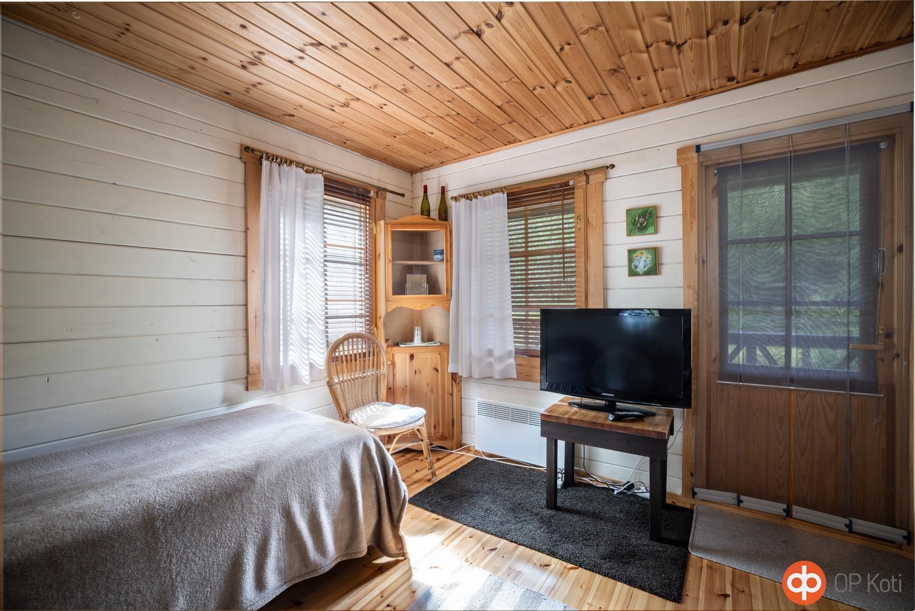 Keittiö: lattia puuta, välitila laattaa, seinät puuta. Olohuone: lattia ja seinät puuta. Makuuhuone 1: lattia laminaattia, seinillä maalattua kipsilevyä. Wc: lattia puuta, seinillä laattaa, puuta ja betonia.