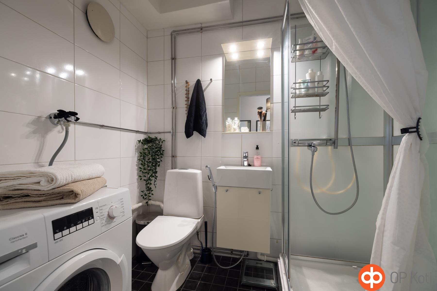 - Suihku, suihkukaappi, peilit, allaskaappi, pesukoneliitäntä. Irrallinen kapea korkea kaappi