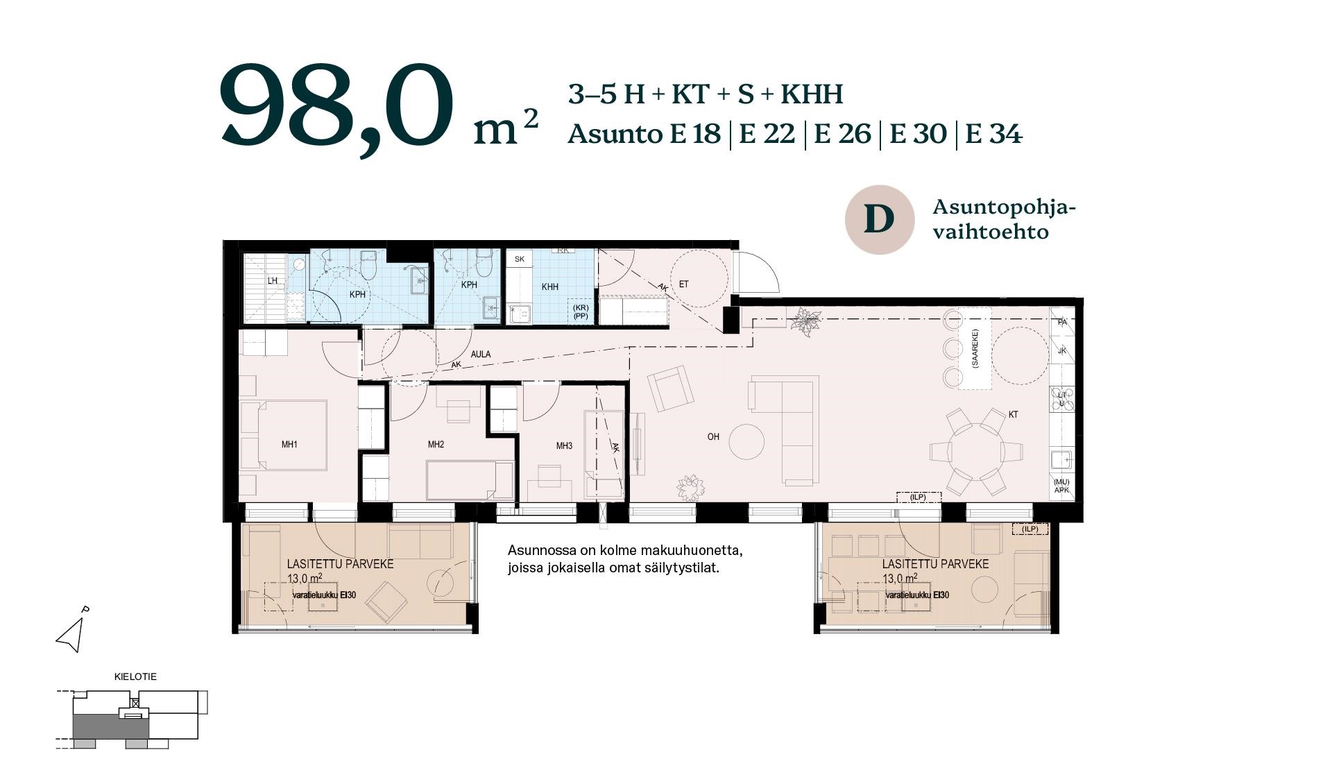 Tässä poikkeuksellisen valoisassa 98m2:n kodissa avaruus, linjakas pohjaratkaisu ja pitkälle kantavat näkymät muodostavat harmonisen kokonaisuuden. Kahdelta parvekkeesta avautuvat aina Heurekalle, Keravanjoen luontoon ja kaupunkimaiset maisemat kauppakeskus Dixiin saakka. Tämän huoneiston parvekkeet suuntautuvat kaakkoon. Näkymät, jotka tekevät arjesta astetta ylellisempää.