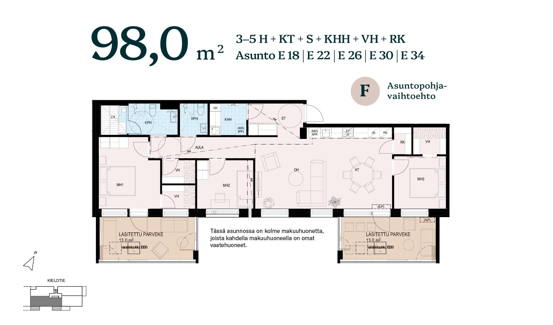 Asunnon muunneltava pohjaratkaisu vastaa vaativankin asukkaan toiveisiin. Koti on toteutettavissa kahden, kolmen tai jopa neljän makuuhuoneen kokonaisuutena, mahdollistaen sekä edustavan että perheystävällisen asumisen.