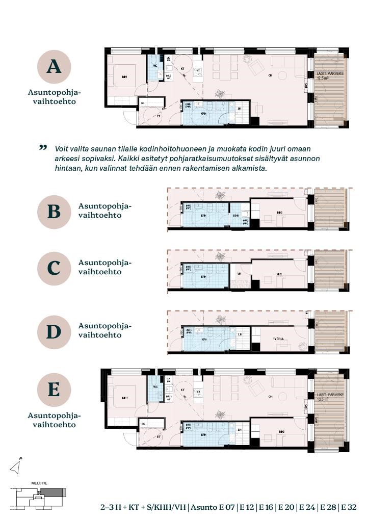 Ennakkomarkkinoinnin aikana varatessasi voit vaikuttaa huonejärjestykseen ja muokata kotiasi tarpeidesi mukaan - esimerkiksi valita saunan tilalle kodinhoitohuoneen tai vaatehuoneen. Kaikki valmiiksi suunnitellut muutokset sisältyvät asunnon hintaan.