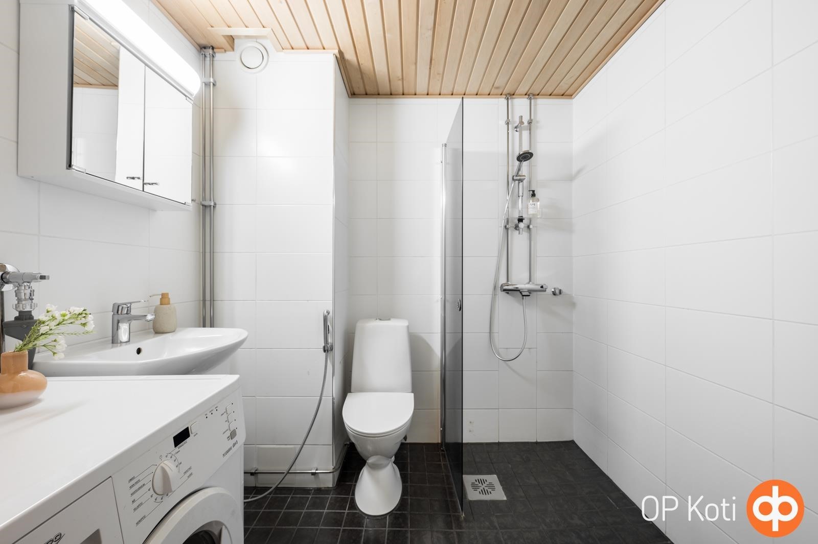 - Kylpyhuone, suihku, suihkuseinä, peilikaappi, allaskaappi, pesukoneliitäntä, kiinteät valaisimet.