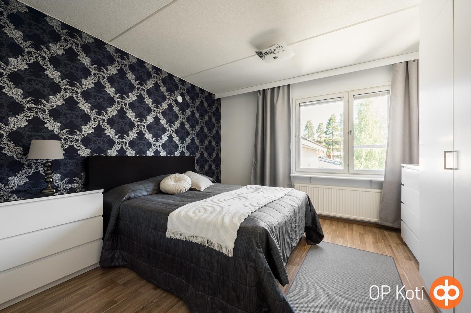 Keittiö: laminaatti/tapetti/maali. Olohuone: laminaatti/maali. Makuuhuone 1: laminaatti/tapetti/maali. Makuuhuone 2: laminaatti/tapetti/maali. Kylpyhuone: laatoitettu.