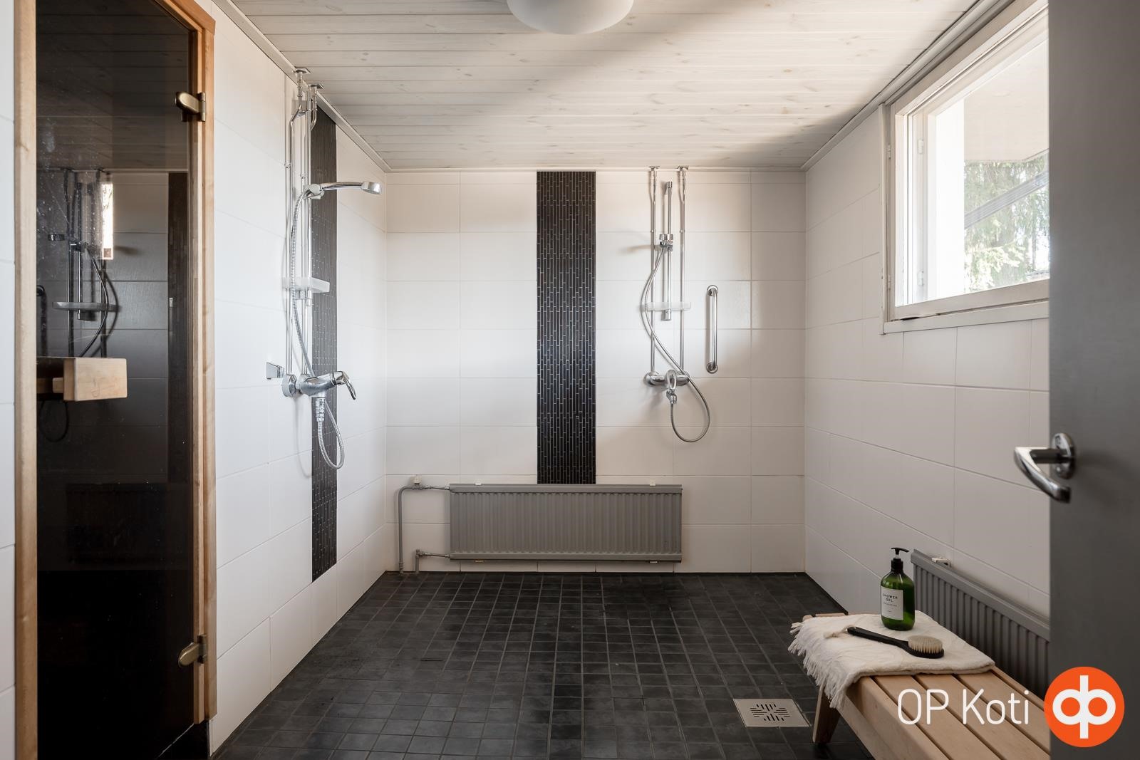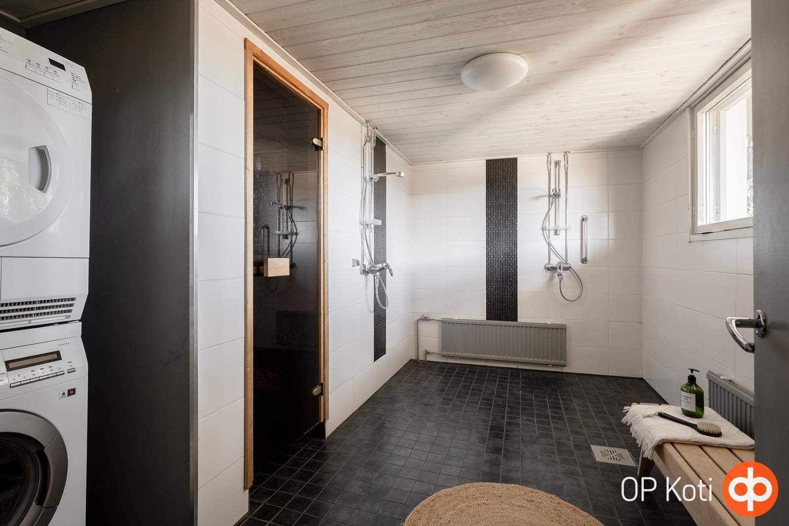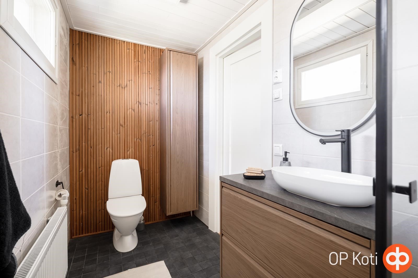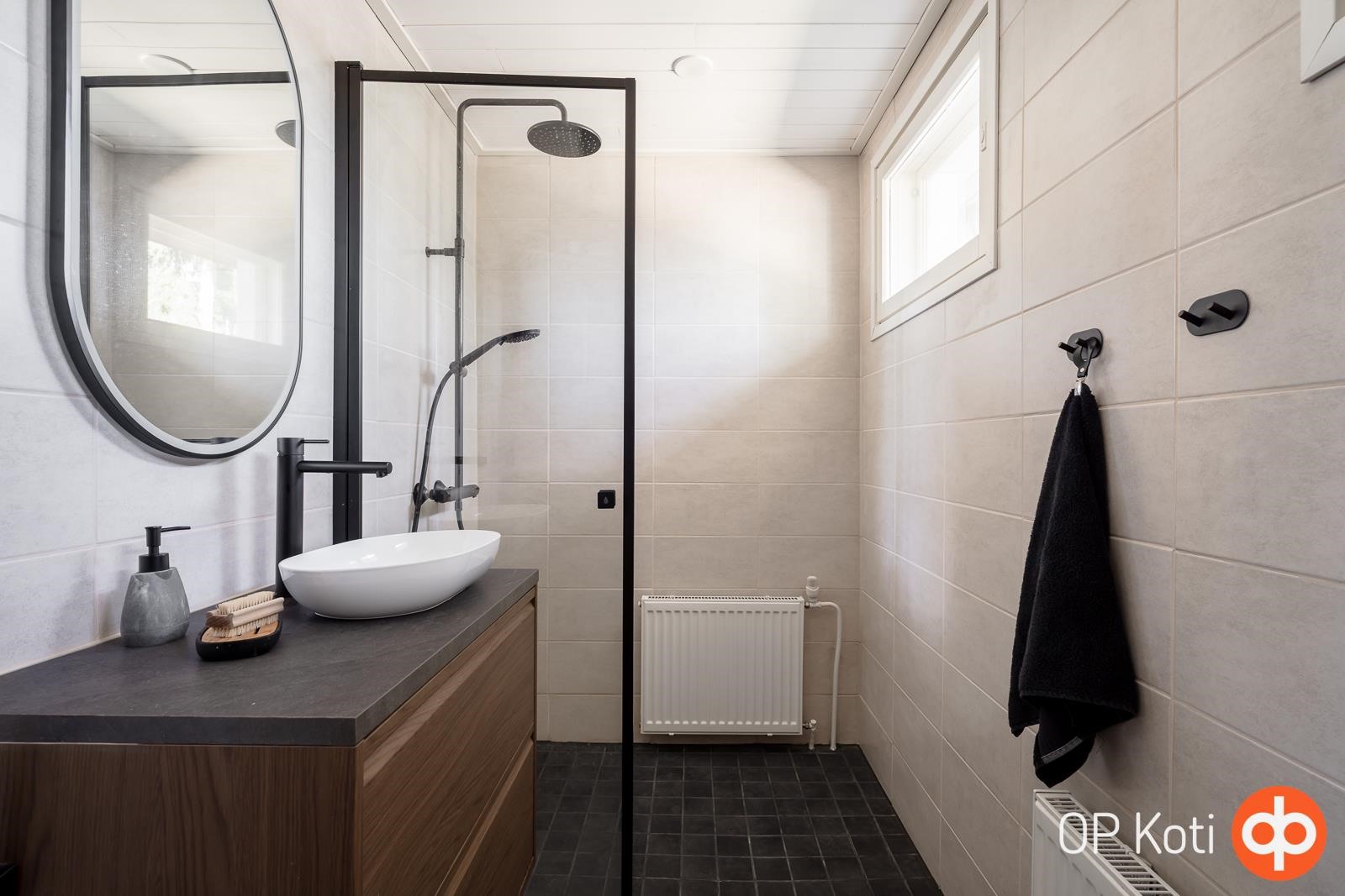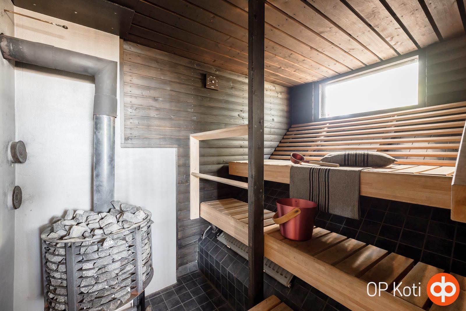 - Sauna, puukiuas, kylpyhuone x2, erillinen wc, suihku, peilit, allaskaappi, pesukoneliitäntä, lattialämmitys sähköllä kylpyhuoneissa, kiinteät valaisimet.