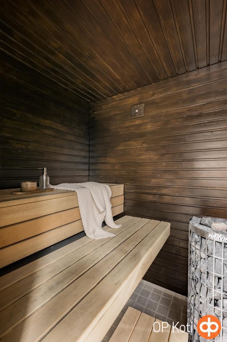 - Sauna (sähkökiuas), kylpyhuone, erillinen wc, suihku, suihkuseinä, peilit, kaapit, allaskaappi, pesukoneliitäntä, lattialämmitys, kiinteät valaisimet.