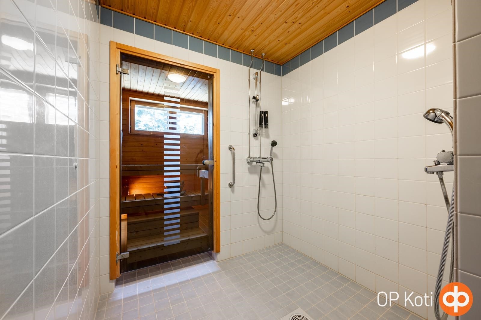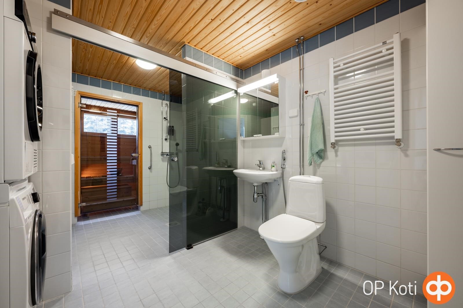 - Sauna, sähkökiuas, kylpyhuone, erillinen wc, suihku 2 kpl, peilikaappi erill wc ja kylpyhuone, pesukoneliitäntä kylpyhuone, lattialämmitys vesikiertoinen. kylpyhuoneessa 2 kpl suihkuja