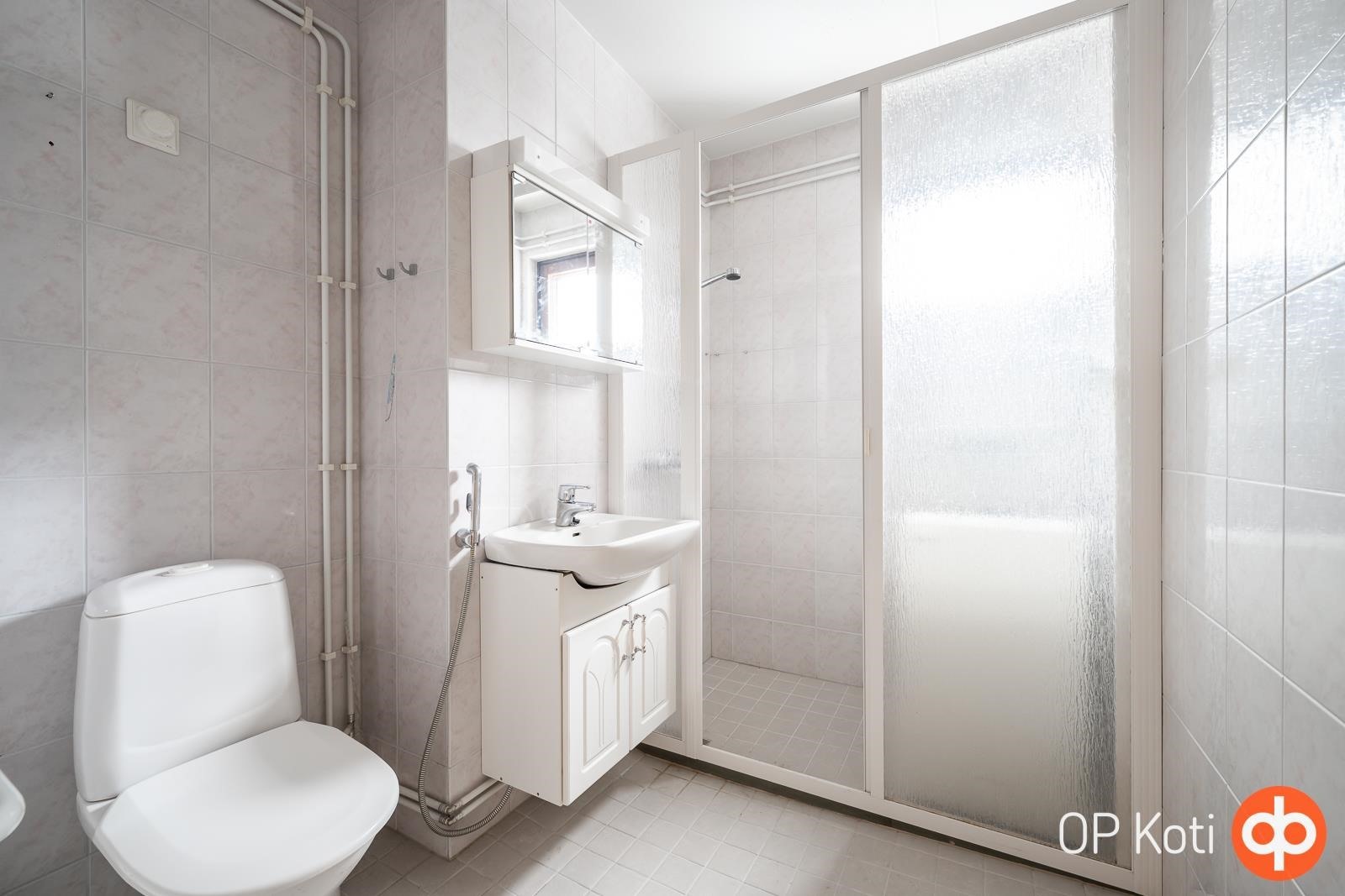 - Kylpyhuone, suihku, suihkuseinä, peilikaappi, allaskaappi, pesukoneliitäntä, lattialämmitys, kiinteät valaisimet.