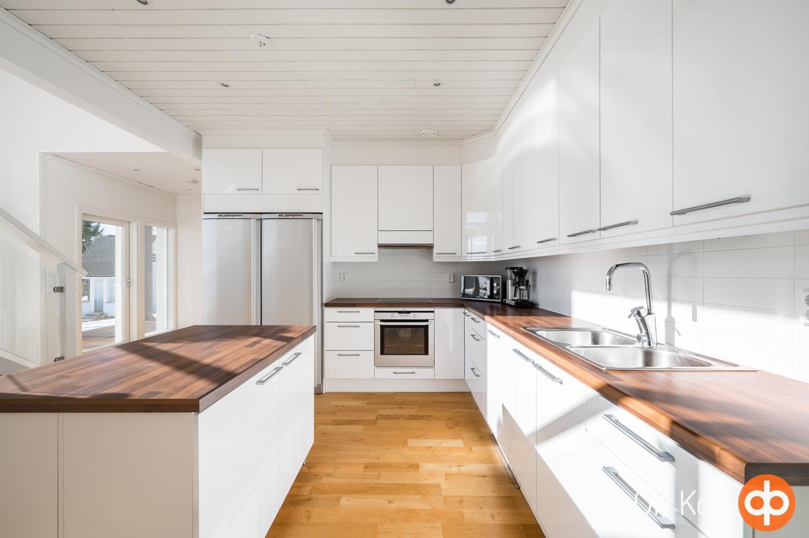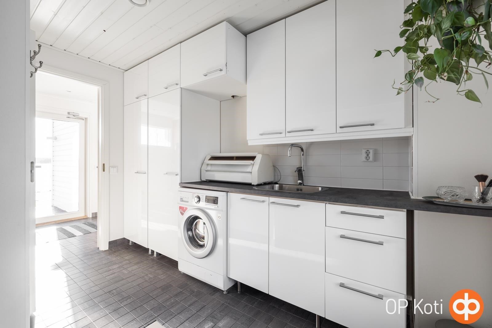 - Jääkaappi, pakastekaappi, keraaminen liesi, astianpesukone, kaapistot, irralliset saarekkeet, kiinteät valaisimet, pöytätasojen materiaali laminaatti.