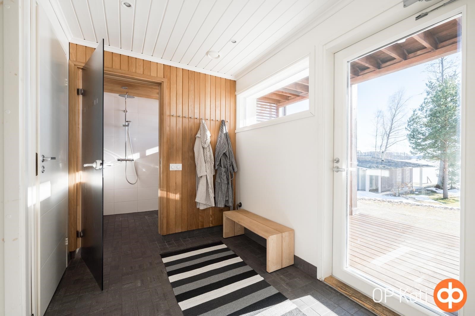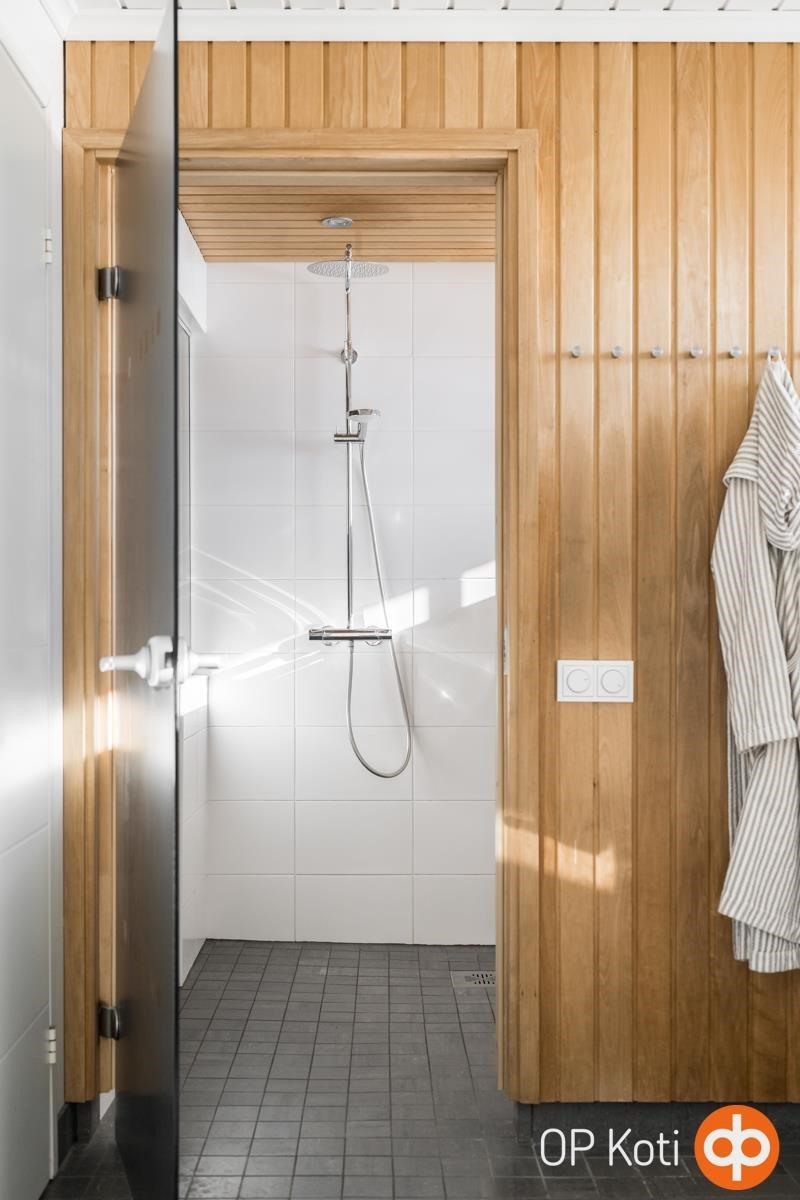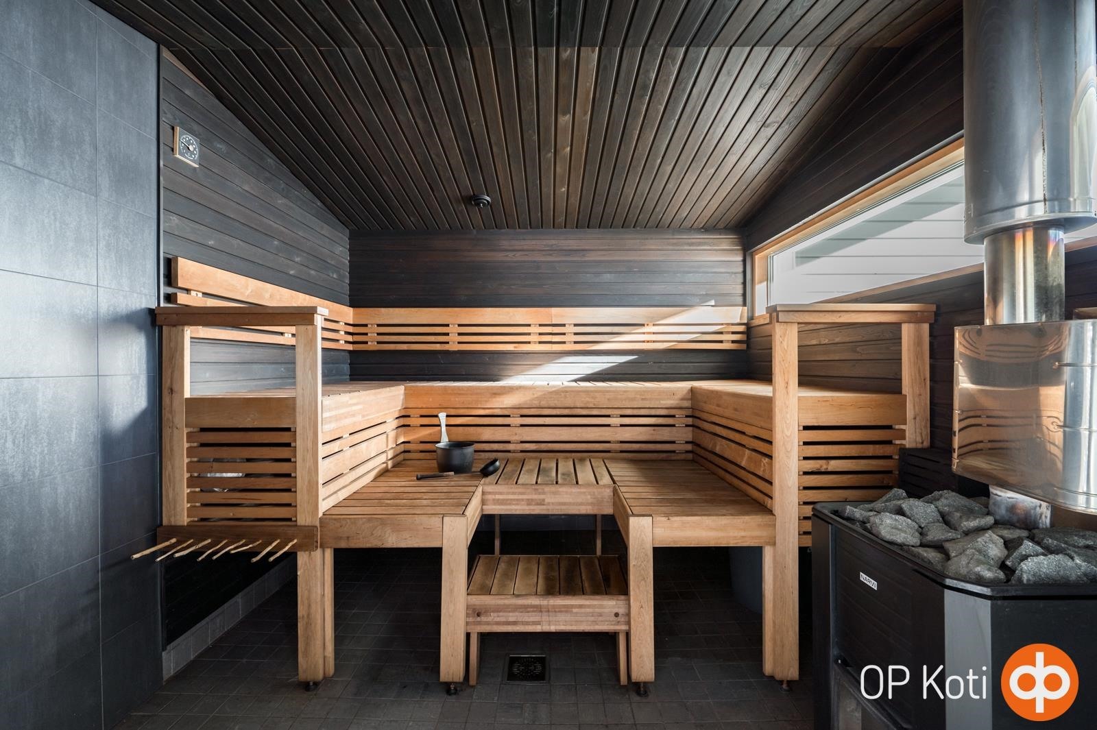 - Sauna, sähkökiuas, puukiuas, kylpyhuone, erillinen wc, suihku, pesukoneliitäntä, lattialämmitys, kiinteät valaisimet.