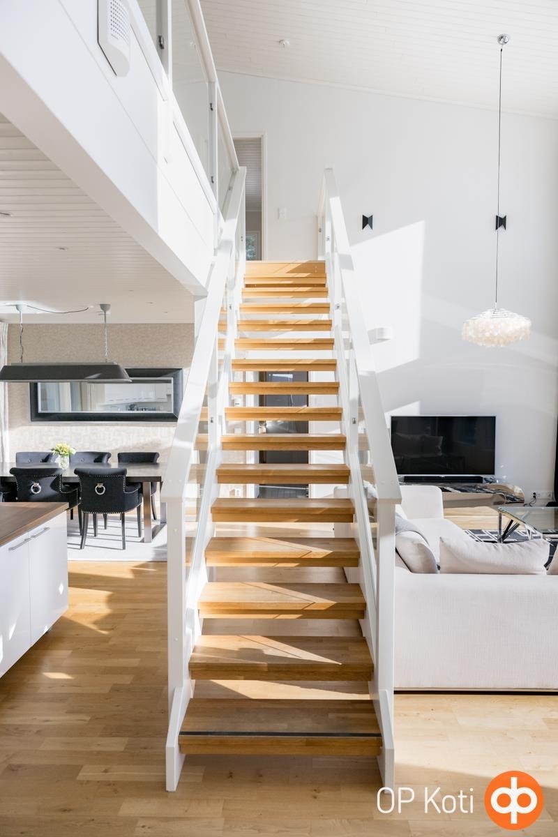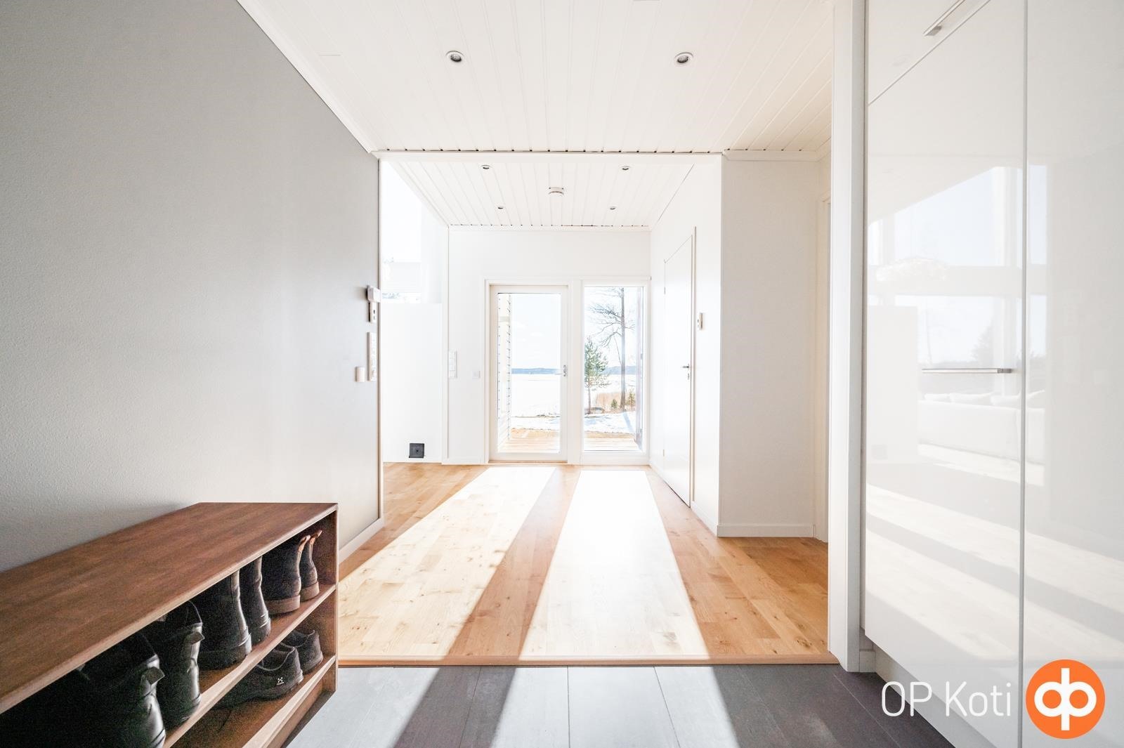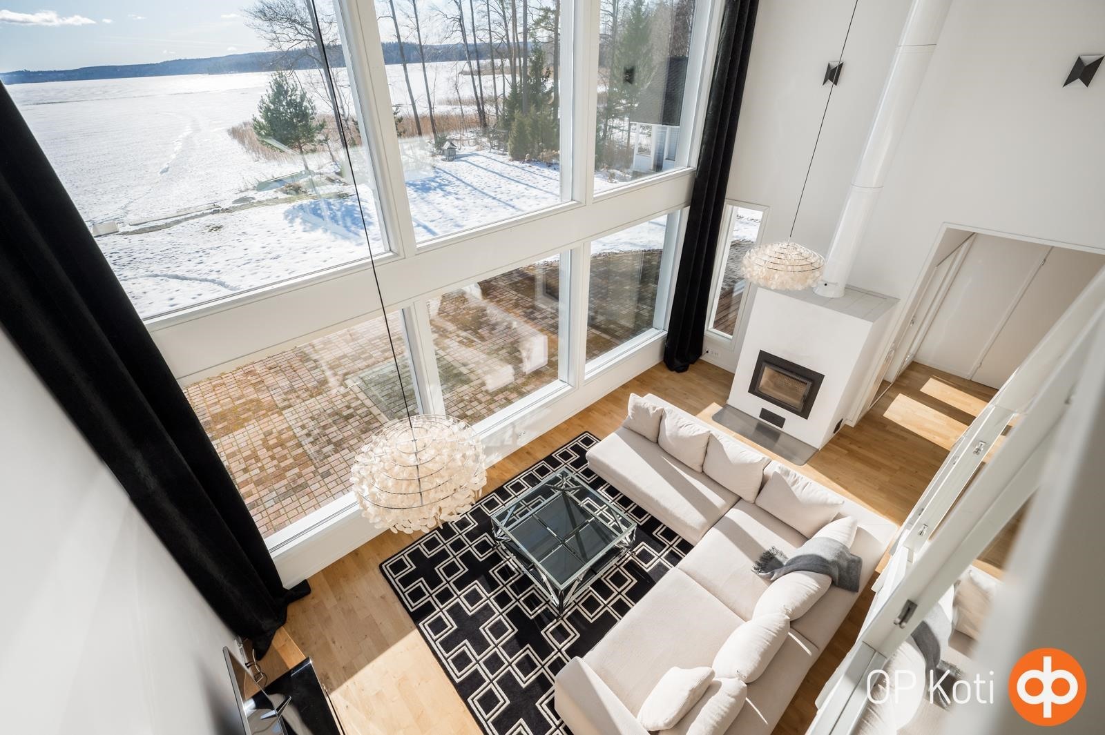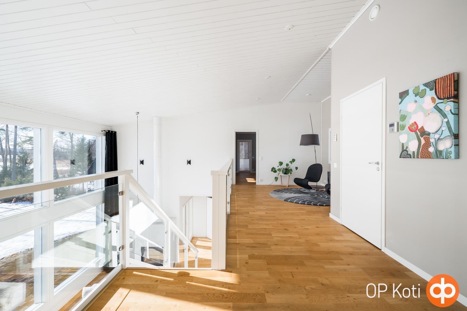 Kodissa suuret, lattiasta kattoon ulottuvat ikkunapinnat avaavat näkymät suoraan järvelle ja tuovat luonnon osaksi sisätiloja kaikkina vuodenaikoina. Valoisat ja avarat oleskelutilat muodostavat harmonisen kokonaisuuden, jossa moderni arkkitehtuuri ja järvimaisema täydentävät toisiaan.